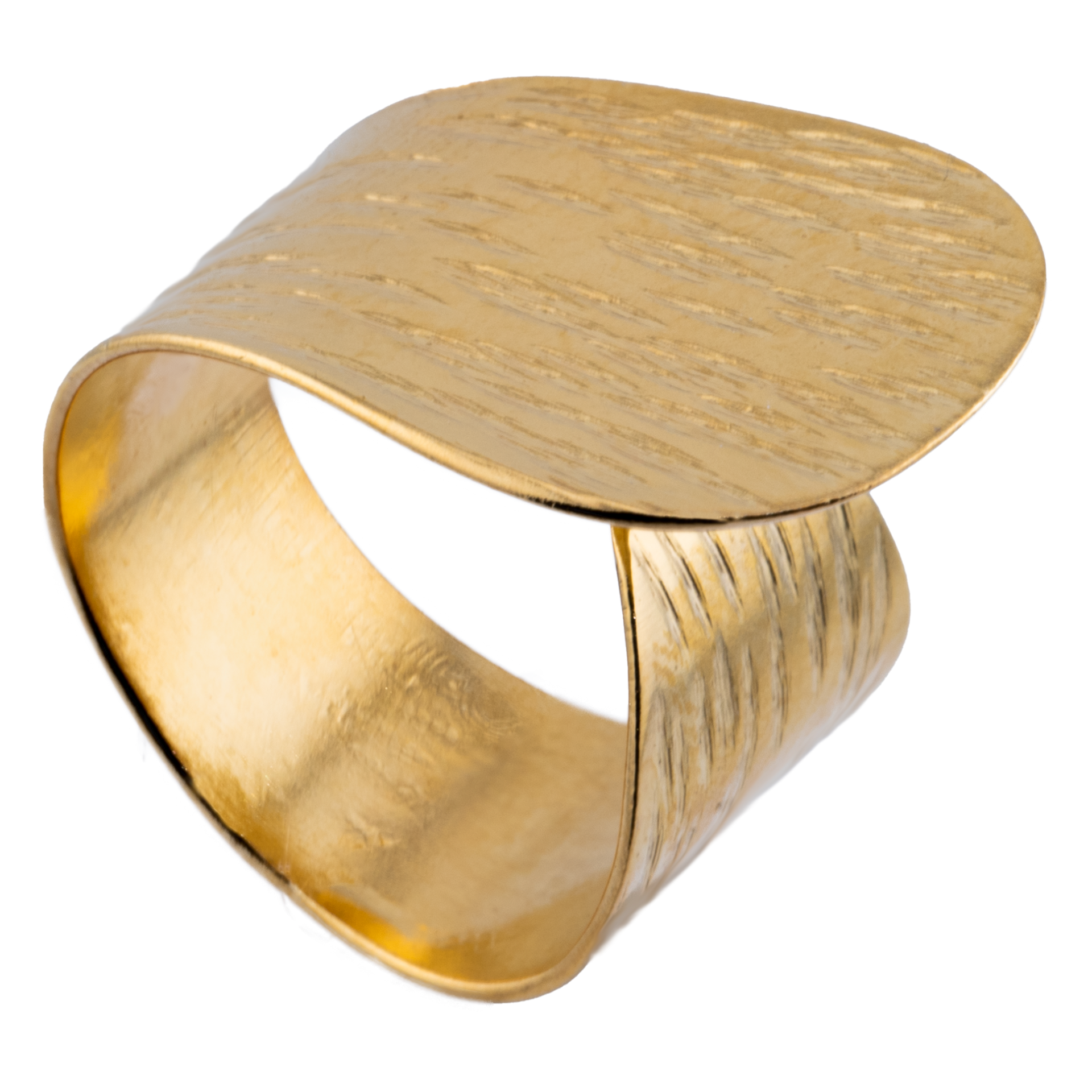 Anello in argento con bagno in oro 24 carati, dal design minimalista. La superficie leggermente texturizzata e la forma ondulata creano un effetto elegante e fluido, richiamando la delicatezza di un petalo. Altezza della fascia 10 mm.