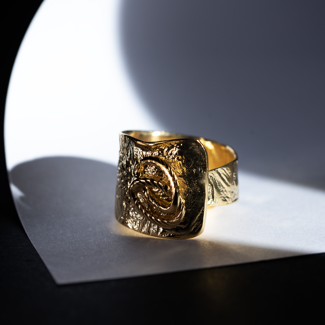 Anello a fascia in argento e bagno in oro 24 carati dalla lavorazione a rilievo. Un delicato intreccio con il simbolo dell’infinito completa questa originale creazione artigianale. Altezza della fascia 15 mm.
