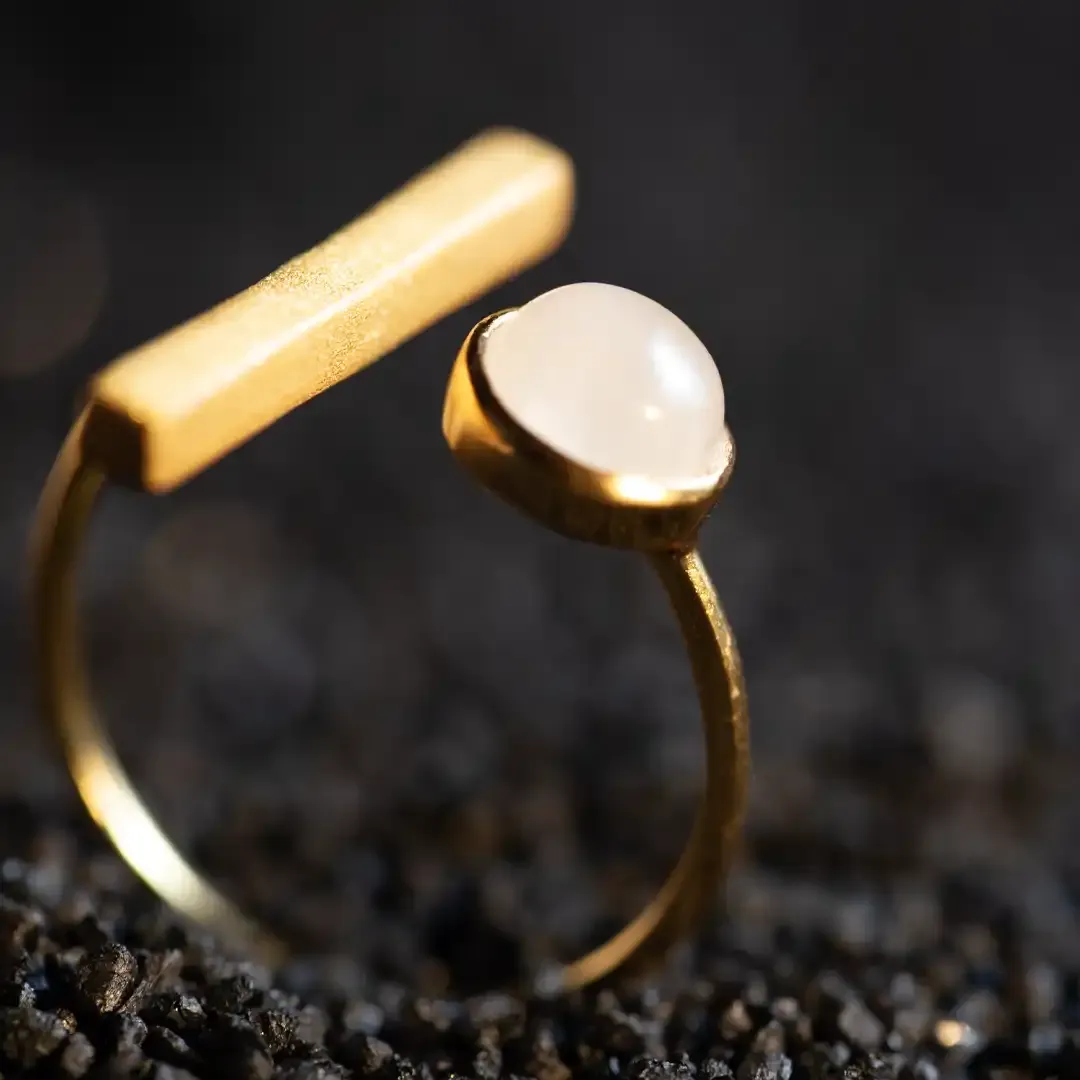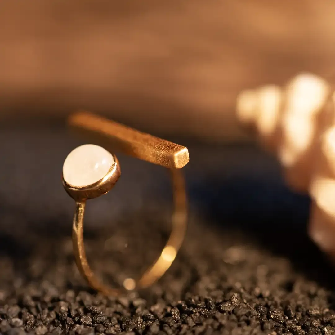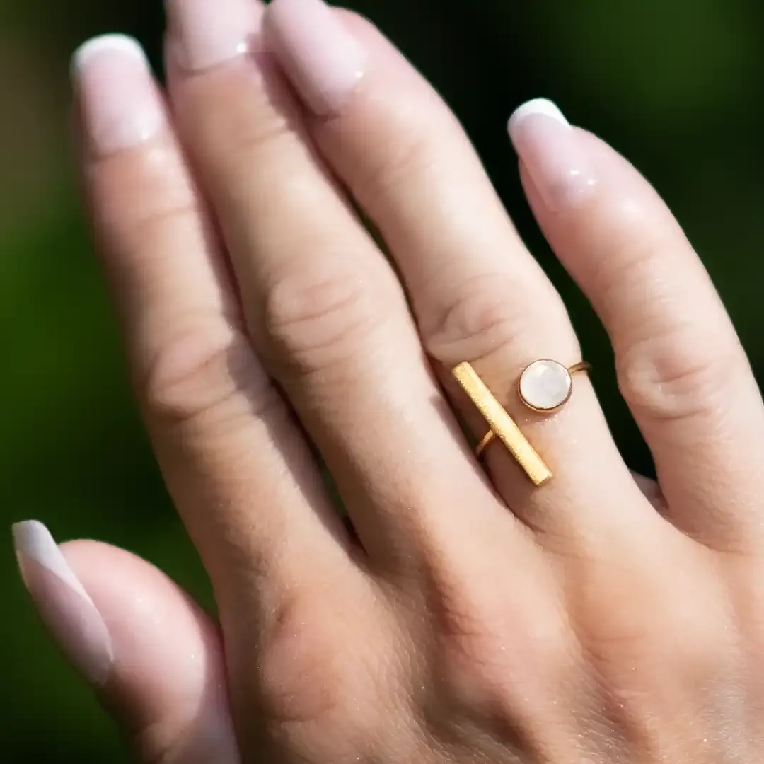 Piccolo anello aperto dalla forma geometrica in argento 925 con bagno in oro 24 carati. La pietra incastonata è una raffinata agata bianca.