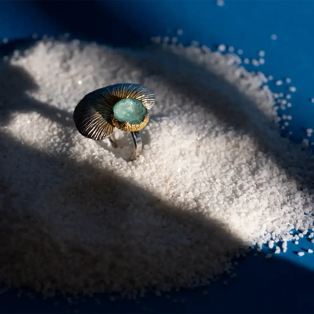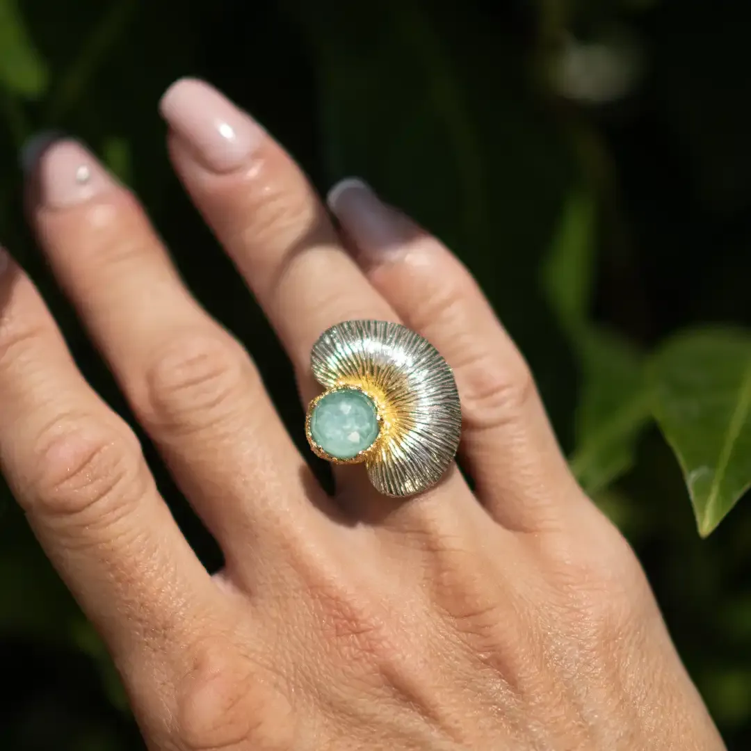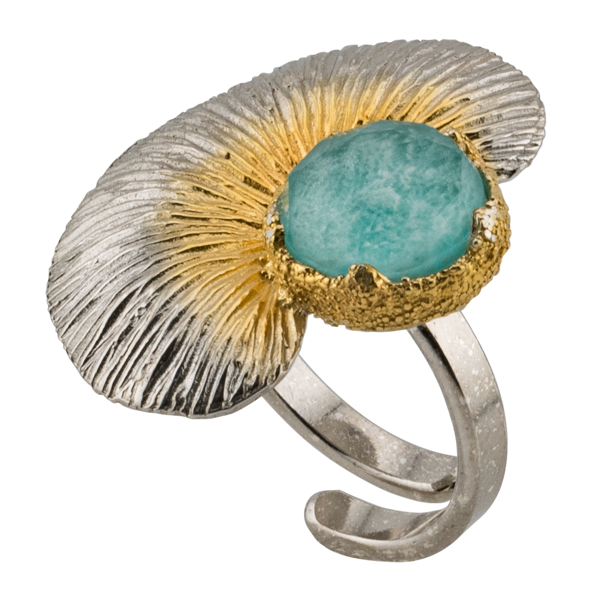 Delicato anello realizzato in argento 925 con bagno in oro 24 carati e finitura in palladio. La pietra incastonata è un’amazzonite.