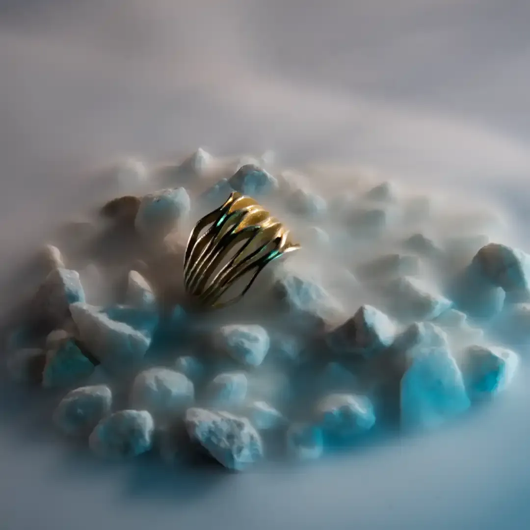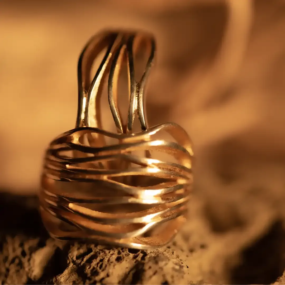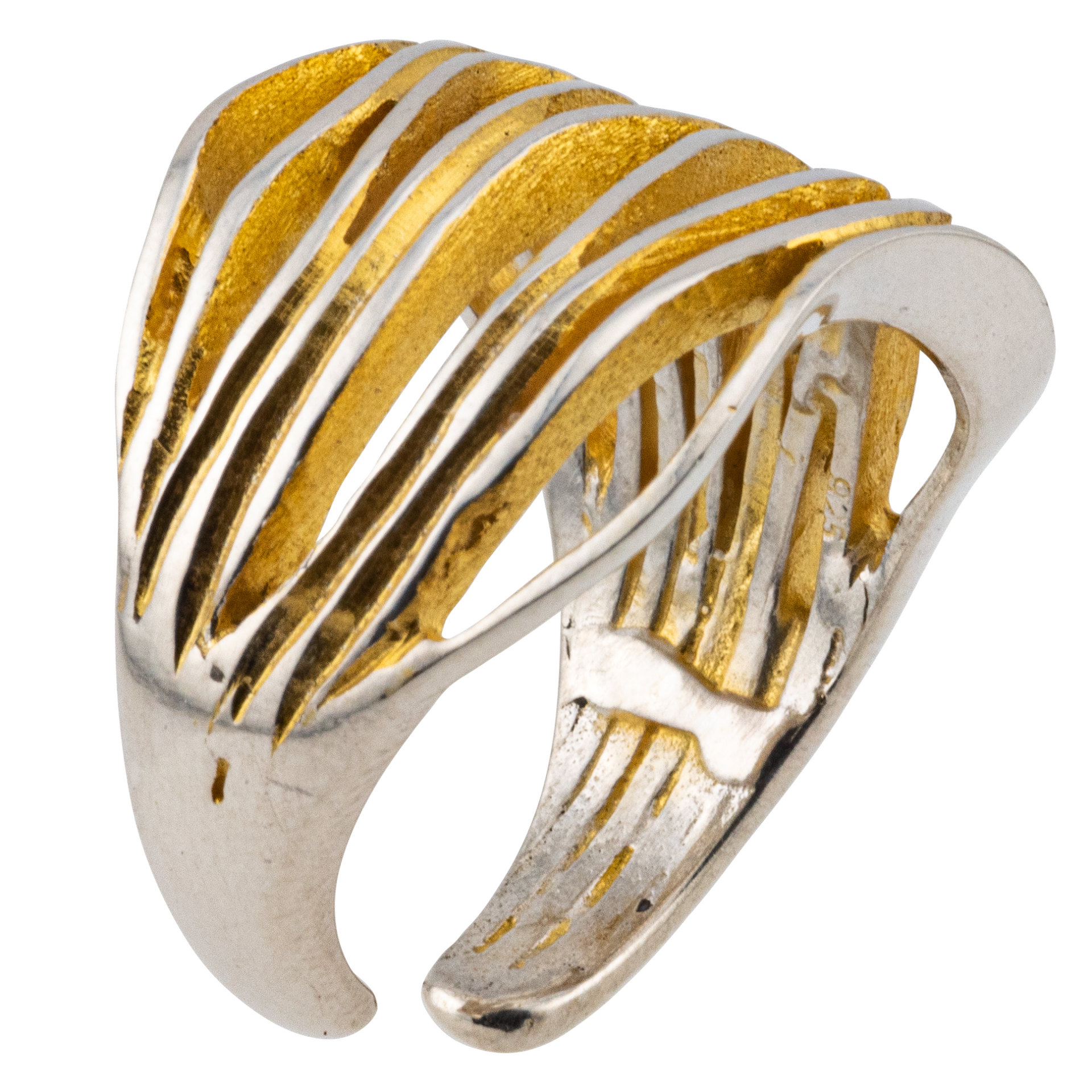 Anello aperto in argento e bagno oro 24 carati dal design moderno e dinamico. Le striature in oro creano un effetto di movimento e contrasto, esaltando la brillantezza dell'argento.