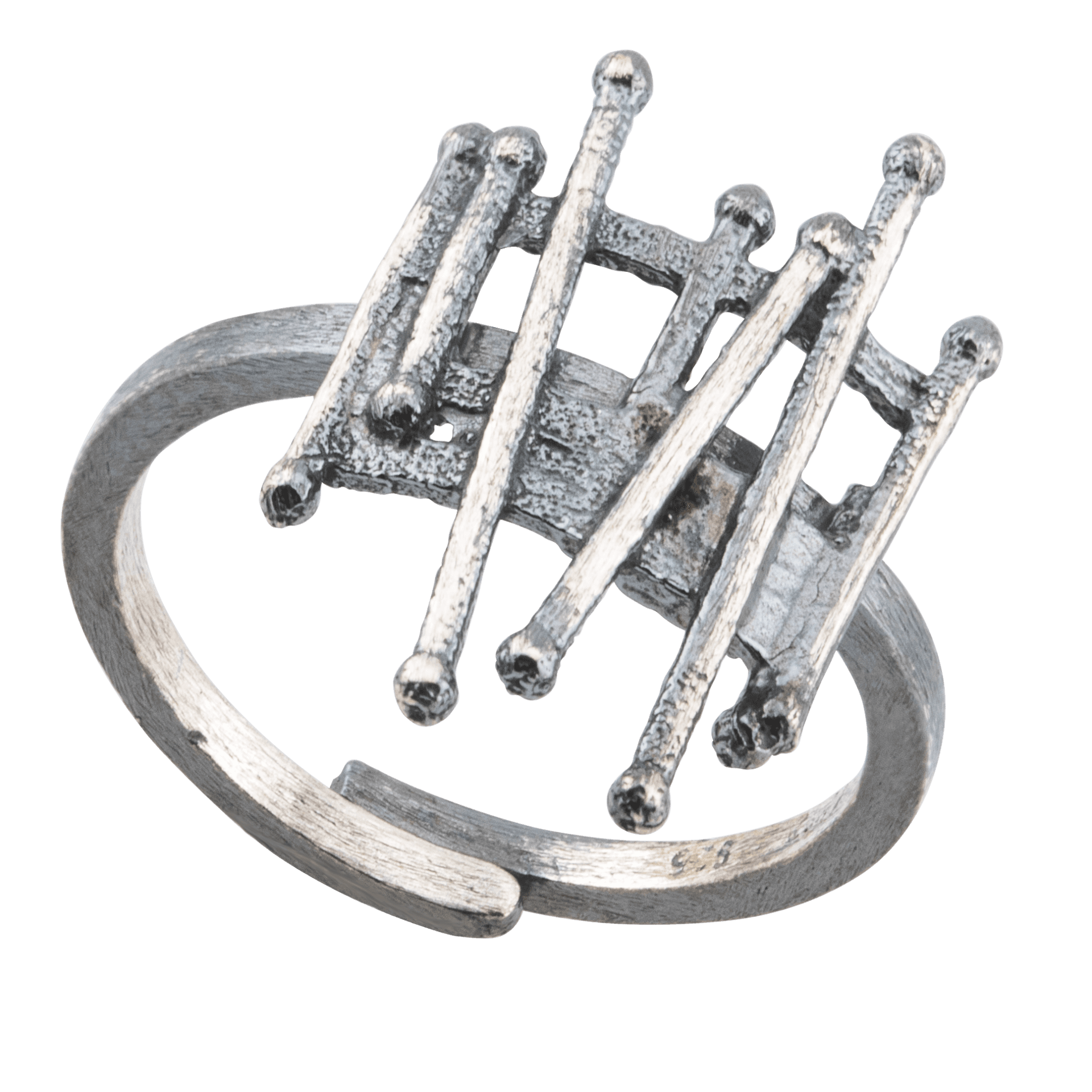 Anello in argento ossidato dal design geometrico contemporaneo, caratterizzato da elementi lineari sovrapposti e disposti in modo asimmetrico.