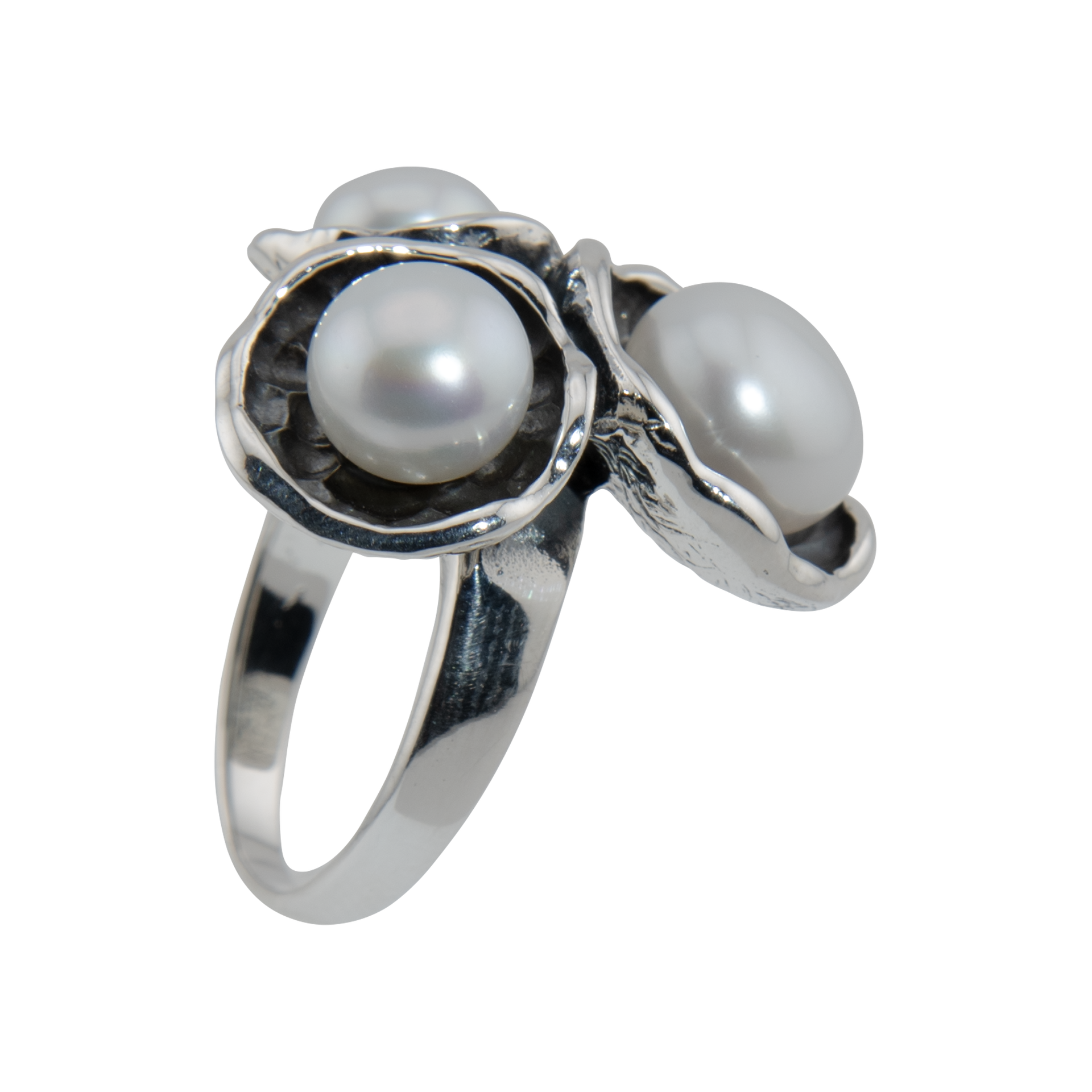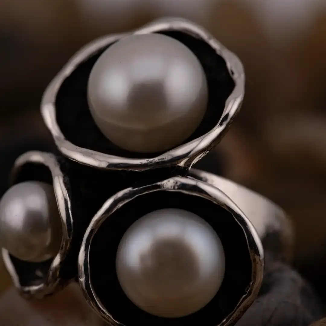 Anello cocktail in argento brunito, decorato con tre perle d'acqua dolce. Un accessorio elegante e di grande impatto visivo.