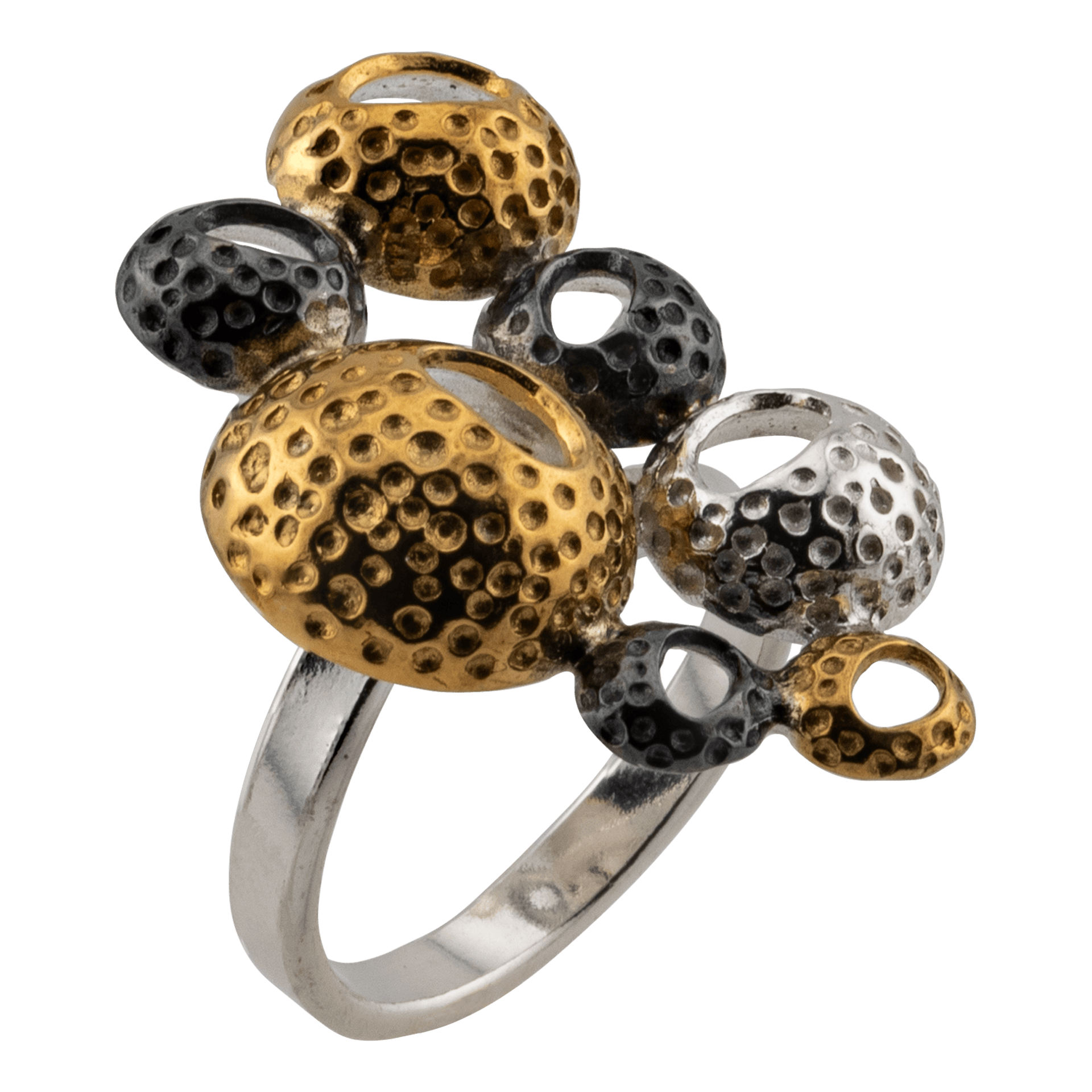 Anello in argento con elementi a cupola forati, rifiniti in tonalità dorate, brunite e argentate. Il design tridimensionale ricorda la struttura di un riccio di mare. Un gioiello originale e sofisticato per chi ama la natura.