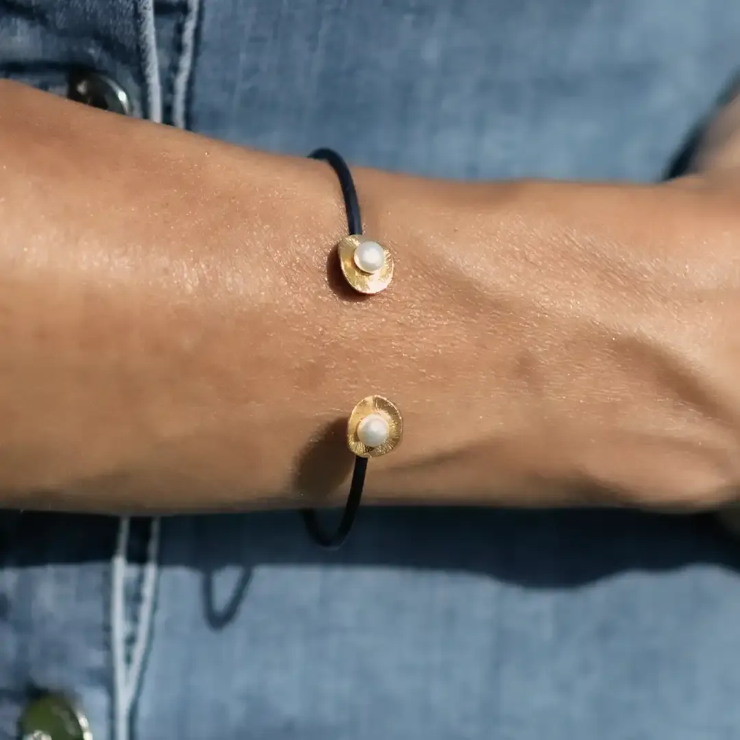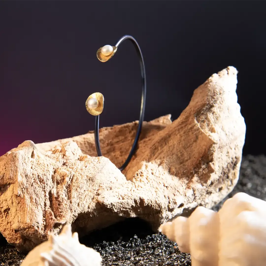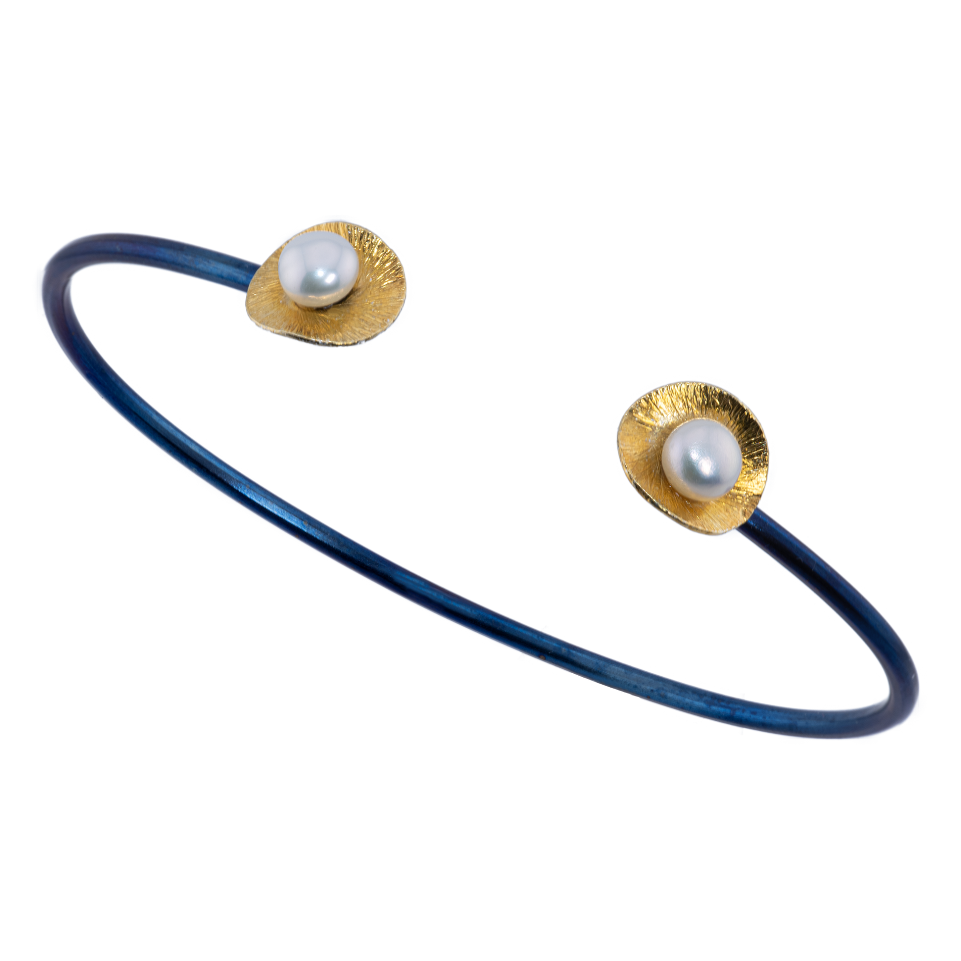 Una sottile struttura in titanio blu elettrico del diametro di 6.5 cm sostiene due piccole corolle in argento dorato dove sono applicate due delicate perle d’acqua dolce.