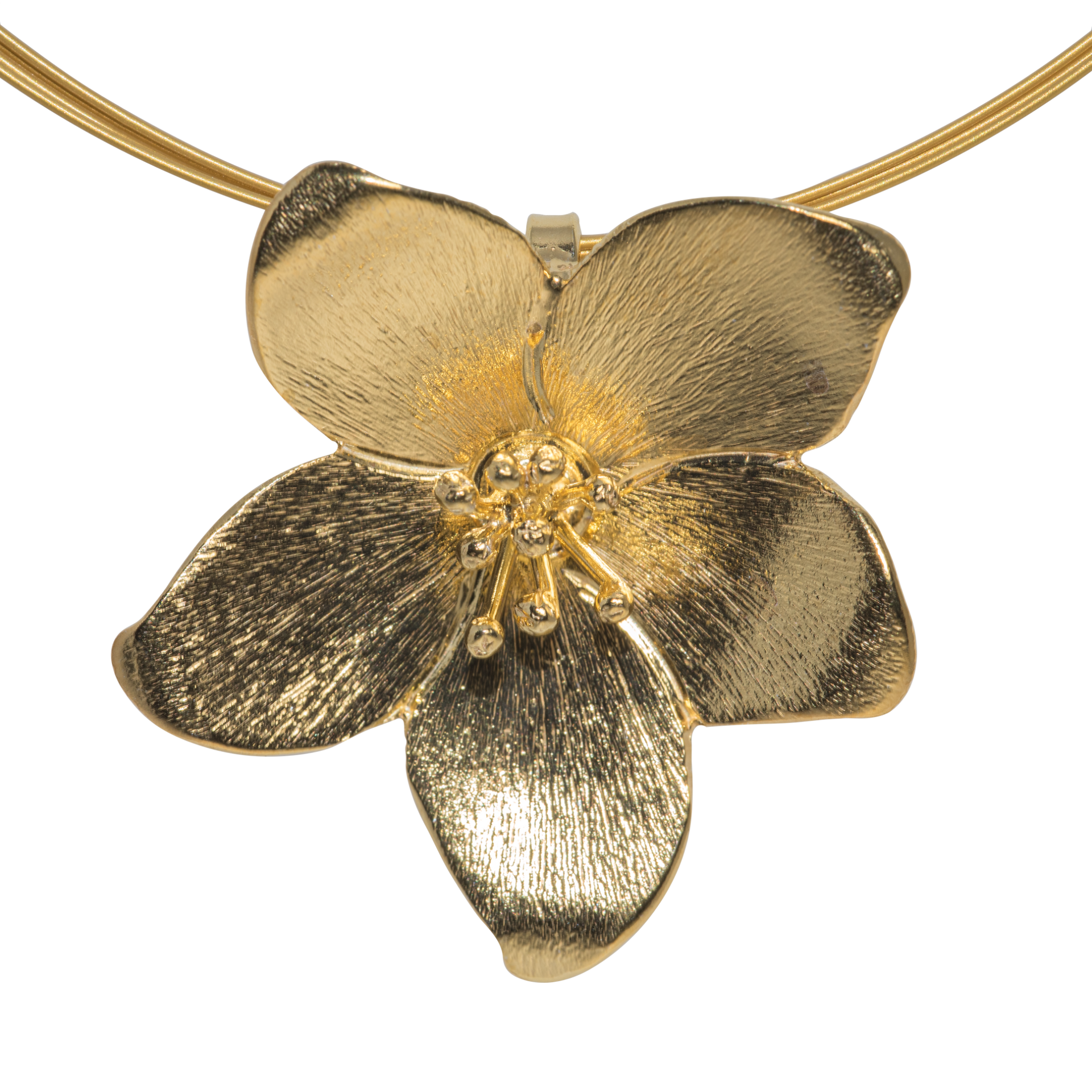Collana girocollo avvolgente a cinque fili in acciaio dorato con chiusura in argento. La lunghezza del girocollo è 40 cm più 5 cm di allungo per poterlo indossare più o meno accollato. Il pendente è un delicato fiore a lavorazione martellata in argento 925 con bagno in oro 24 carati.
