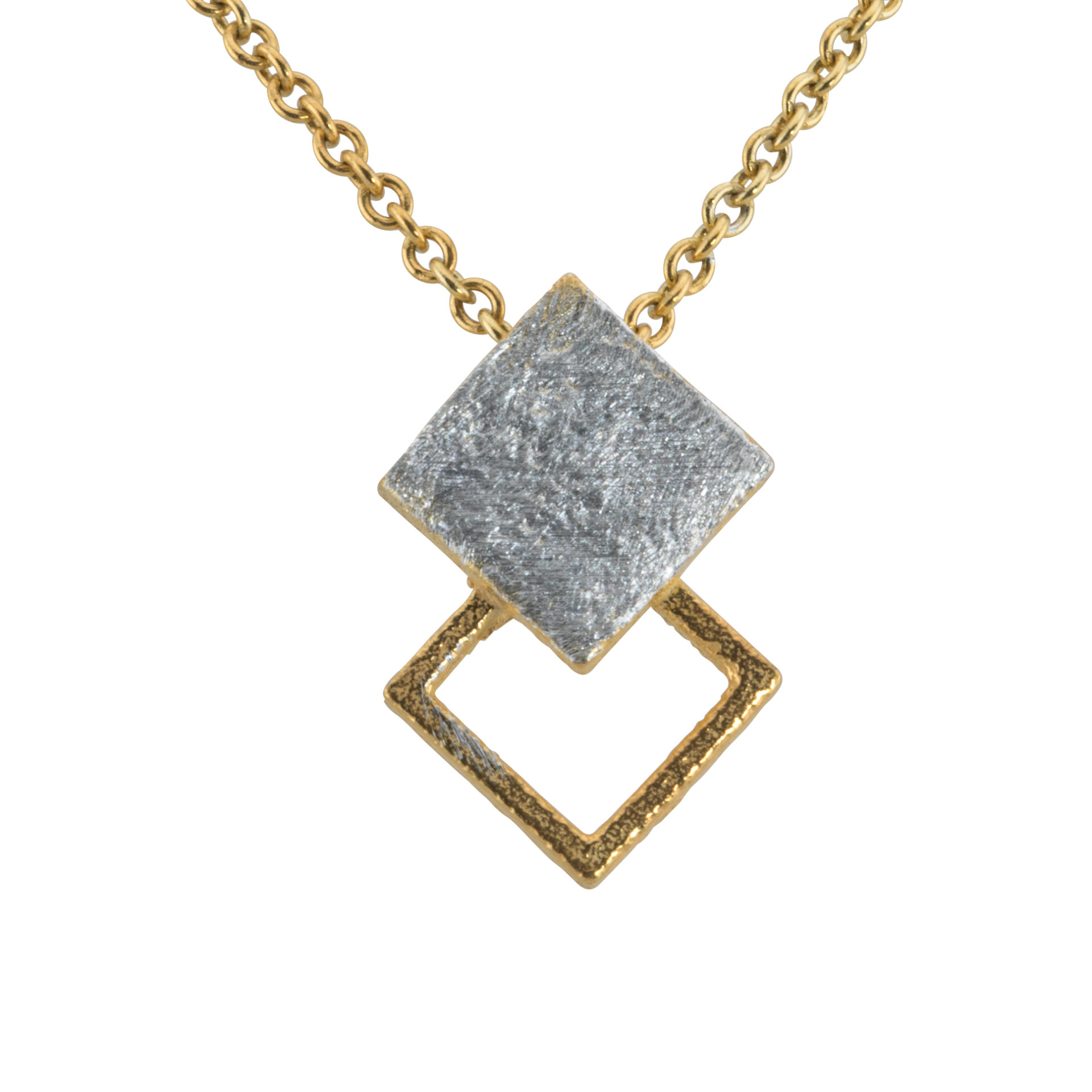 Collana con pendente geometrico composto da un quadrato in argento texturizzato sovrapposto a un quadrato vuoto in argento con bagno in oro. Il contrasto tra materiali e forme utilizzate crea un design moderno e raffinato. Lunghezza della catena 42 cm.