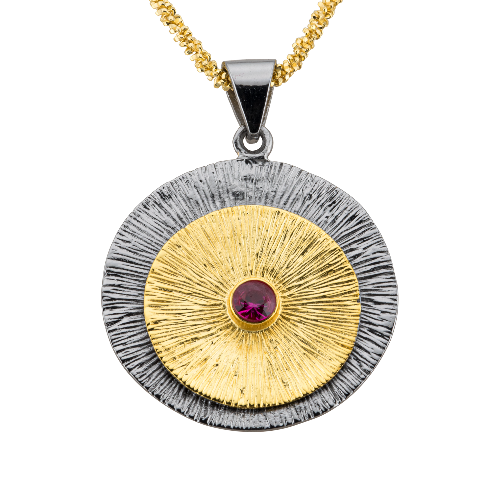 Collana in argento e bagno in oro 24 carati con un particolare pendente circolare doppio. Un cristallo dal rosso intenso effetto rubino aggiunge un raffinato tocco di colore e originalità.