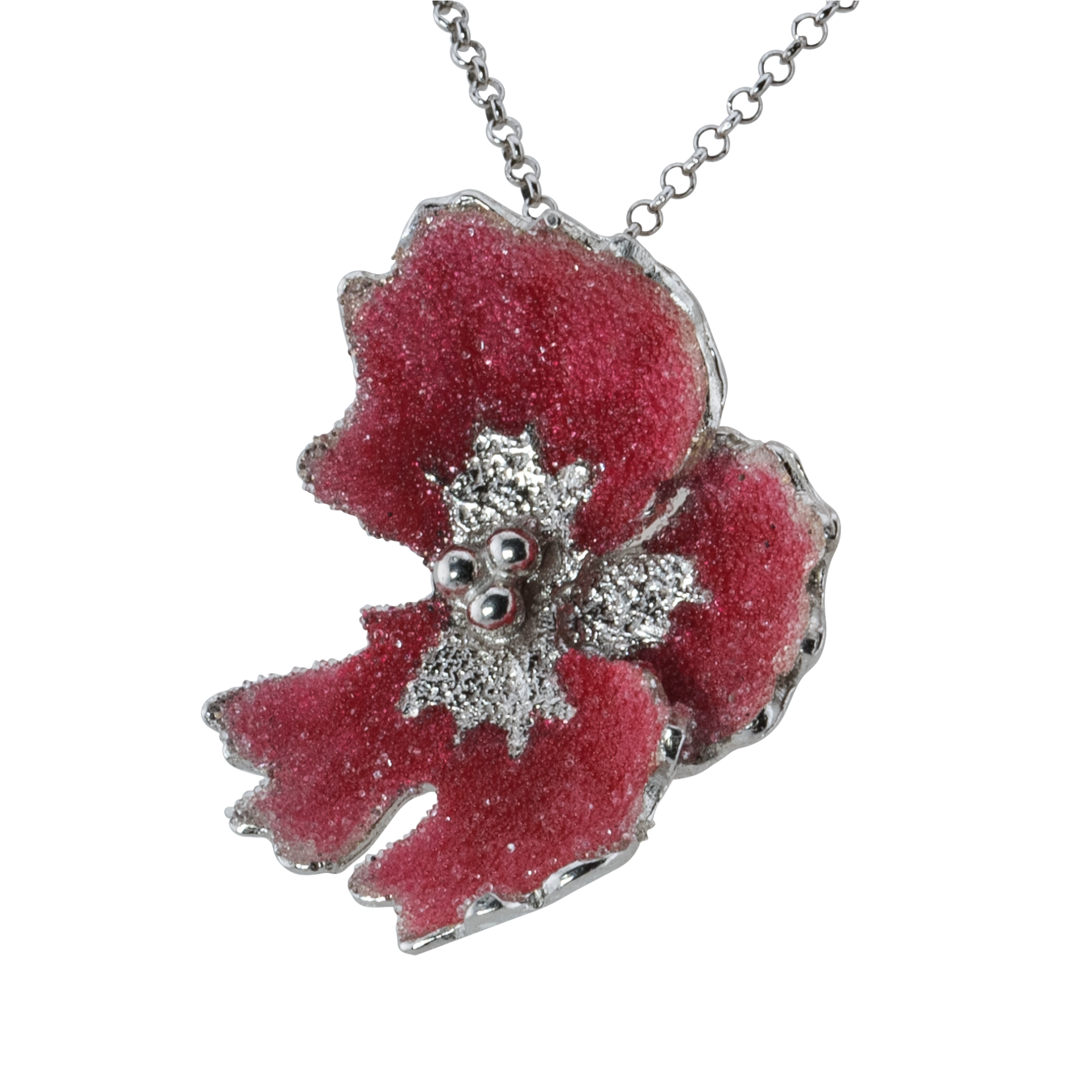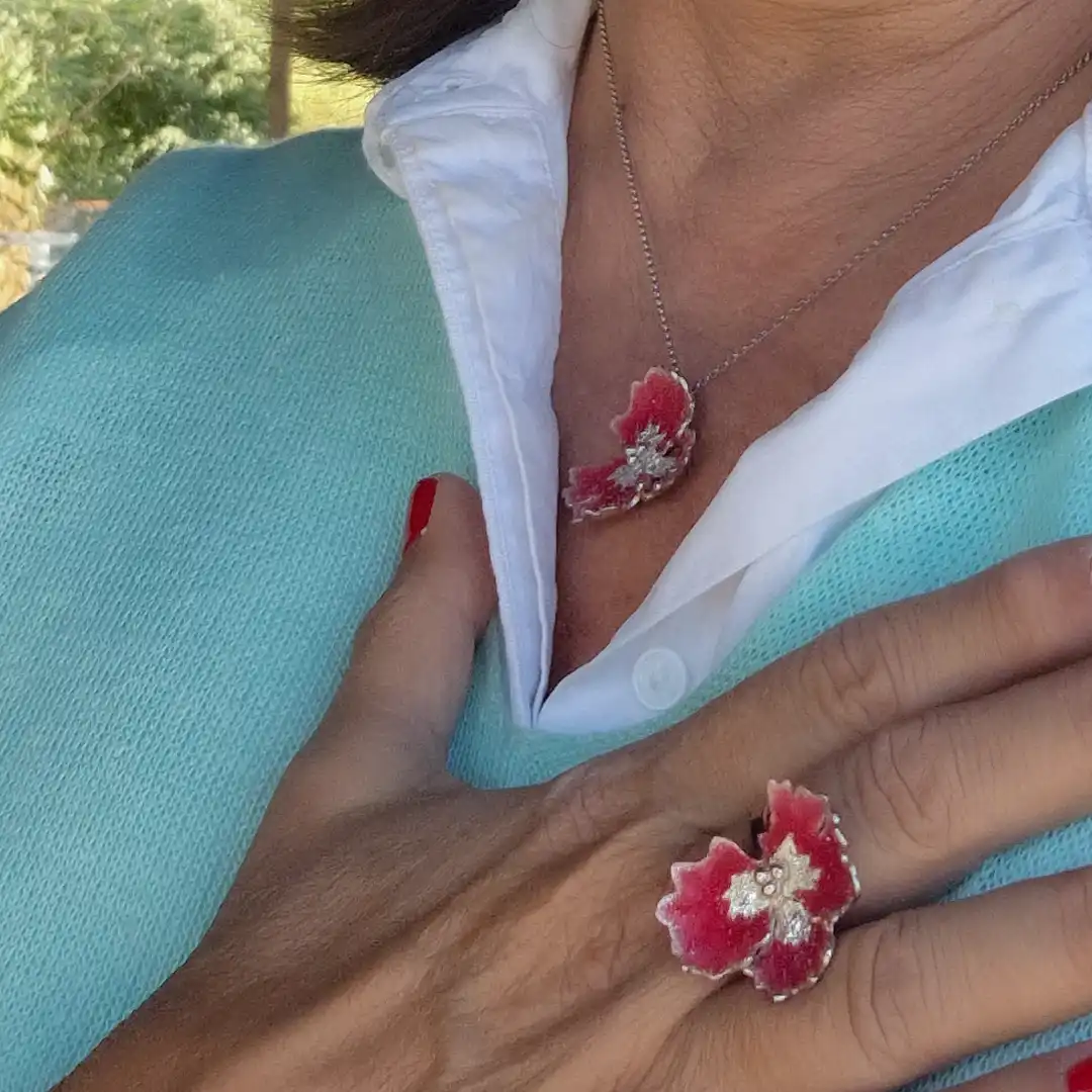 Collana con pendente floreale in argento 925 con bagno in platino, decorato con microcristalli rossi. Un design sofisticato e raffinato che cattura la luce. Lunghezza della catena 45 cm.