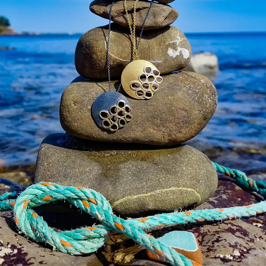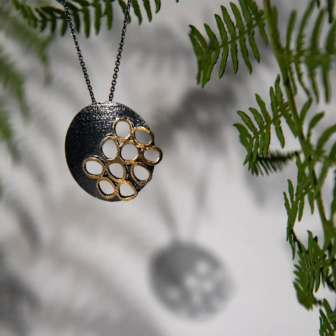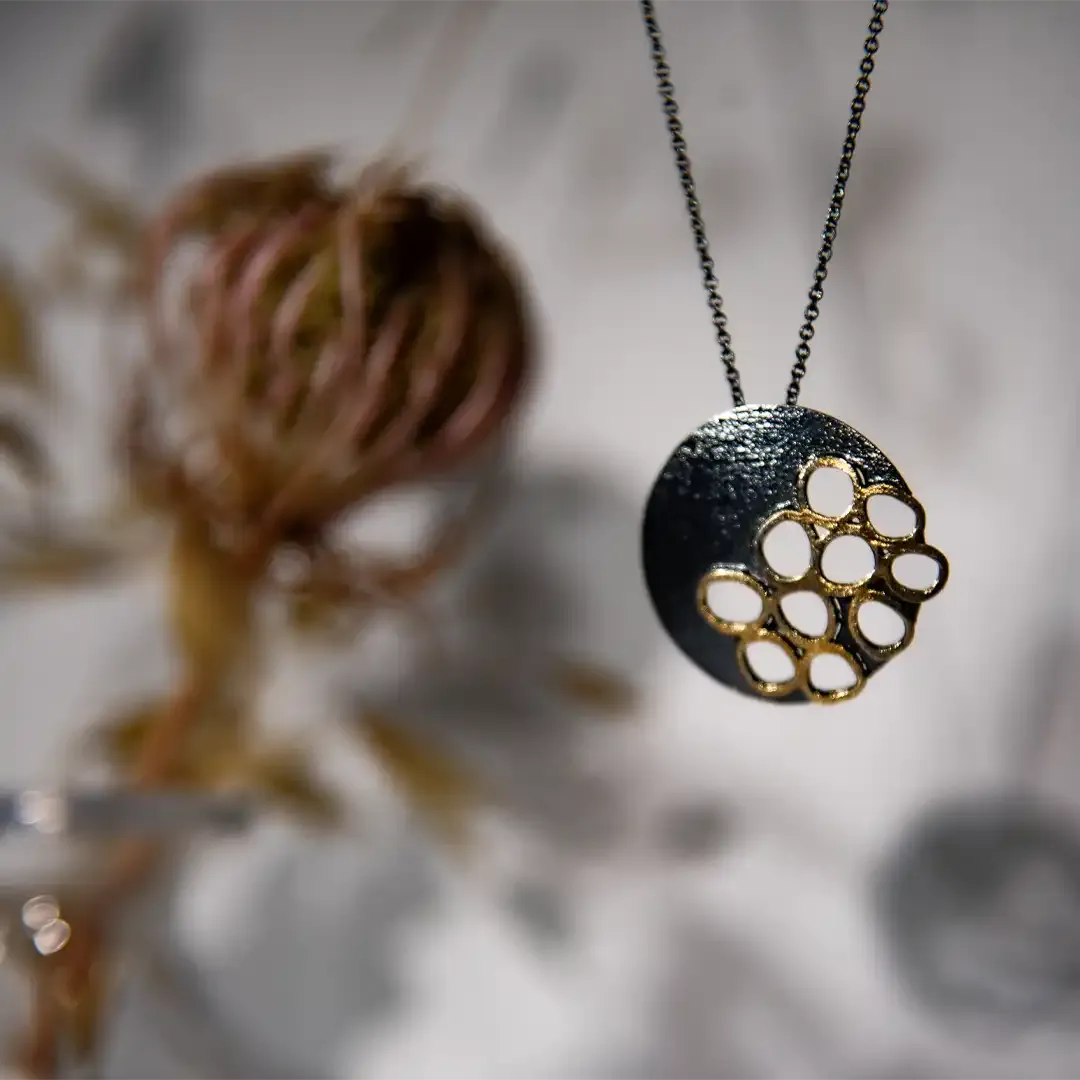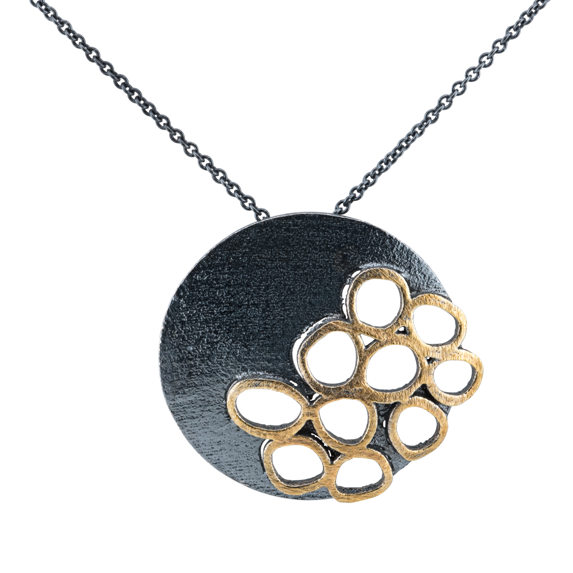 Collana con pendente a cerchio traforato e satinato a mano, realizzato in argento ossidato 925. Con un diametro di 35 mm questo pendente unisce artigianalità e stile per un look elegante e sofisticato. La lunghezza della catena è 45 cm.