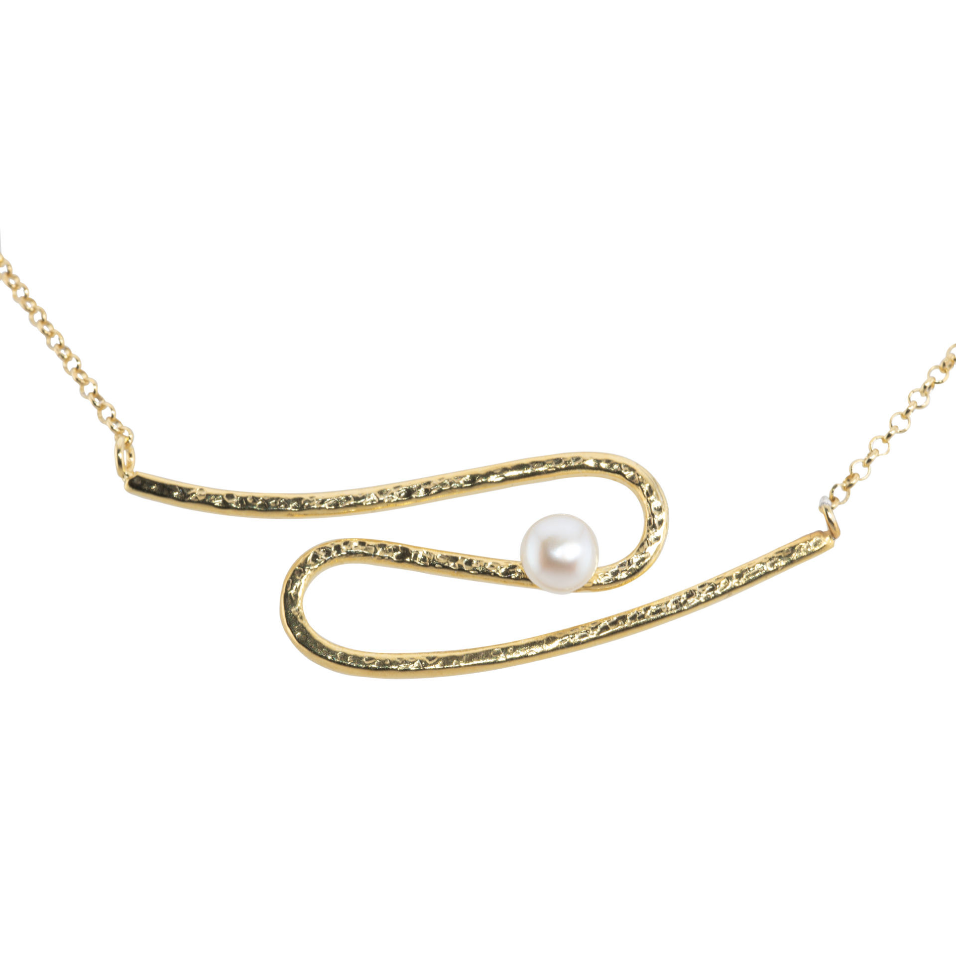 Elegante collana in argento con bagno in oro, caratterizzata da una sottile catena che si avvolge delicatamente attorno a una perla centrale. Il design minimalista e raffinato esalta la brillantezza della perla d’acqua dolce. Lunghezza della catena 42 cm.