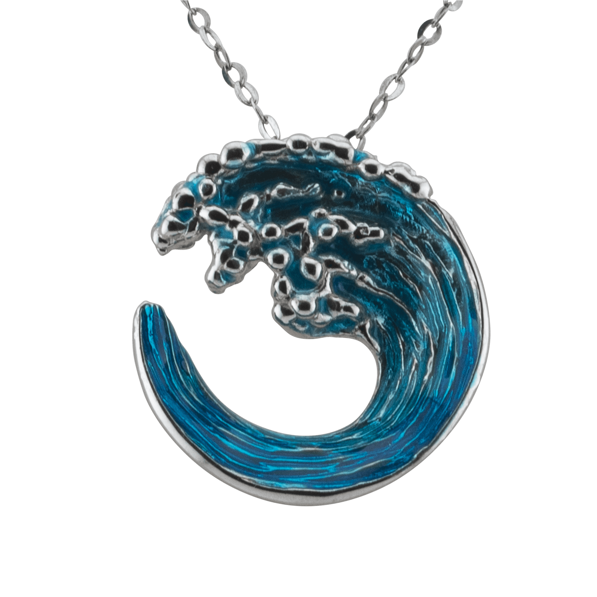 Pendente artigianale in argento e bagno in platino raffigurante un'onda stilizzata, realizzata con dettagli in smalto blu. Il design dinamico e fluido cattura la potenza e la bellezza del mare. Lunghezza della catena 45 cm.
