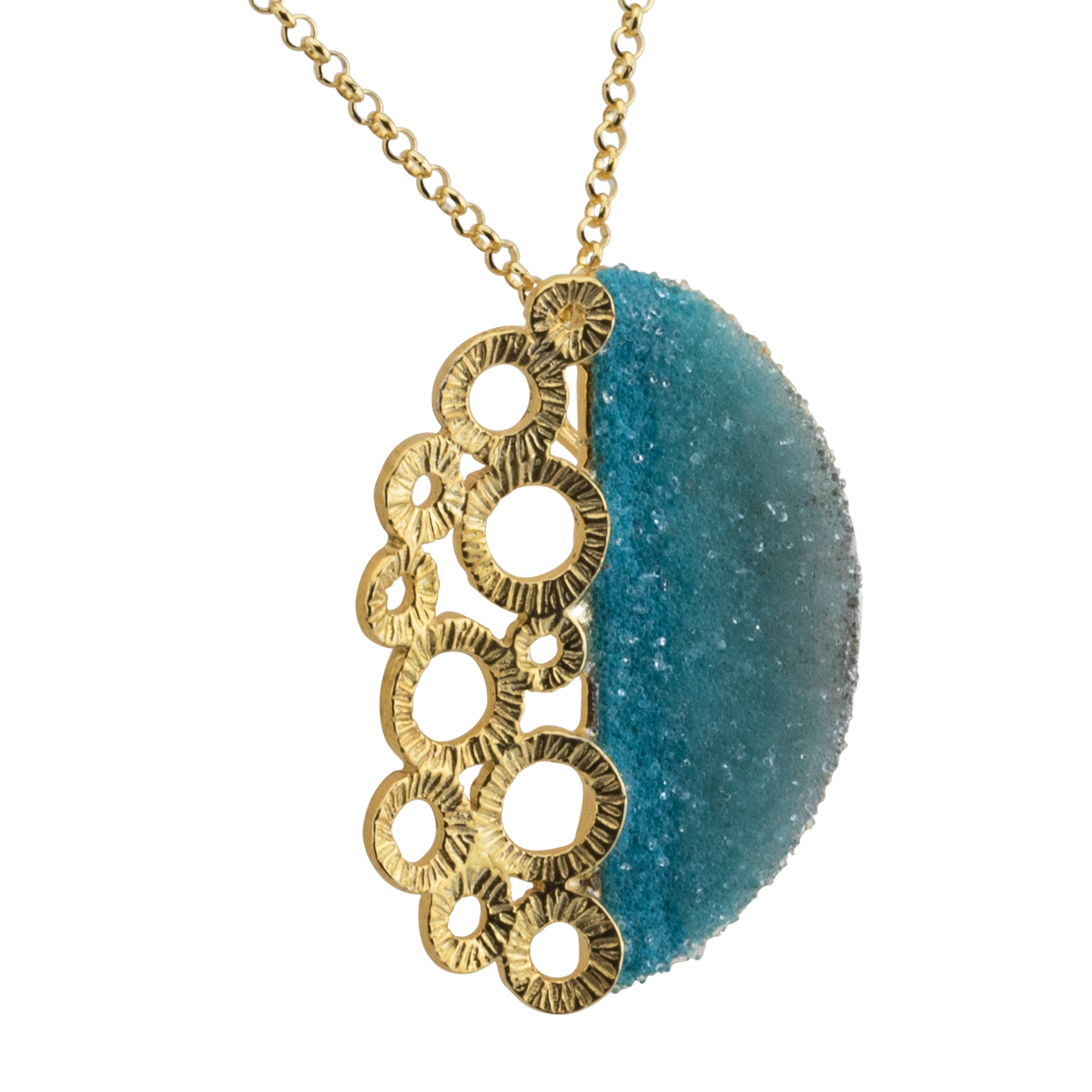 Pendente artigianale in argento dorato, caratterizzato da un design semicircolare con microcristalli blu e dettagli traforati. Un gioiello unico. Lunghezza della catena 45 cm.