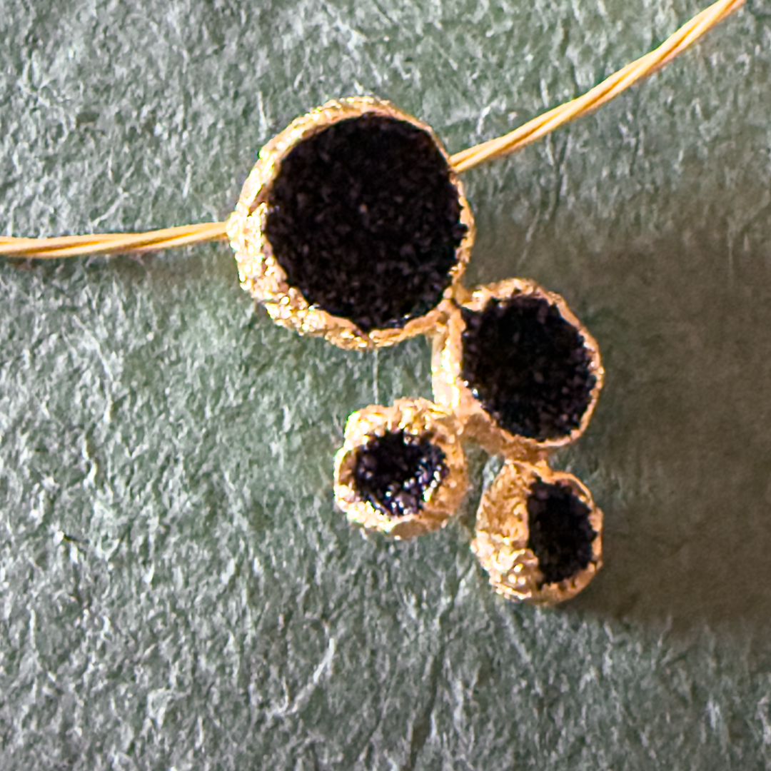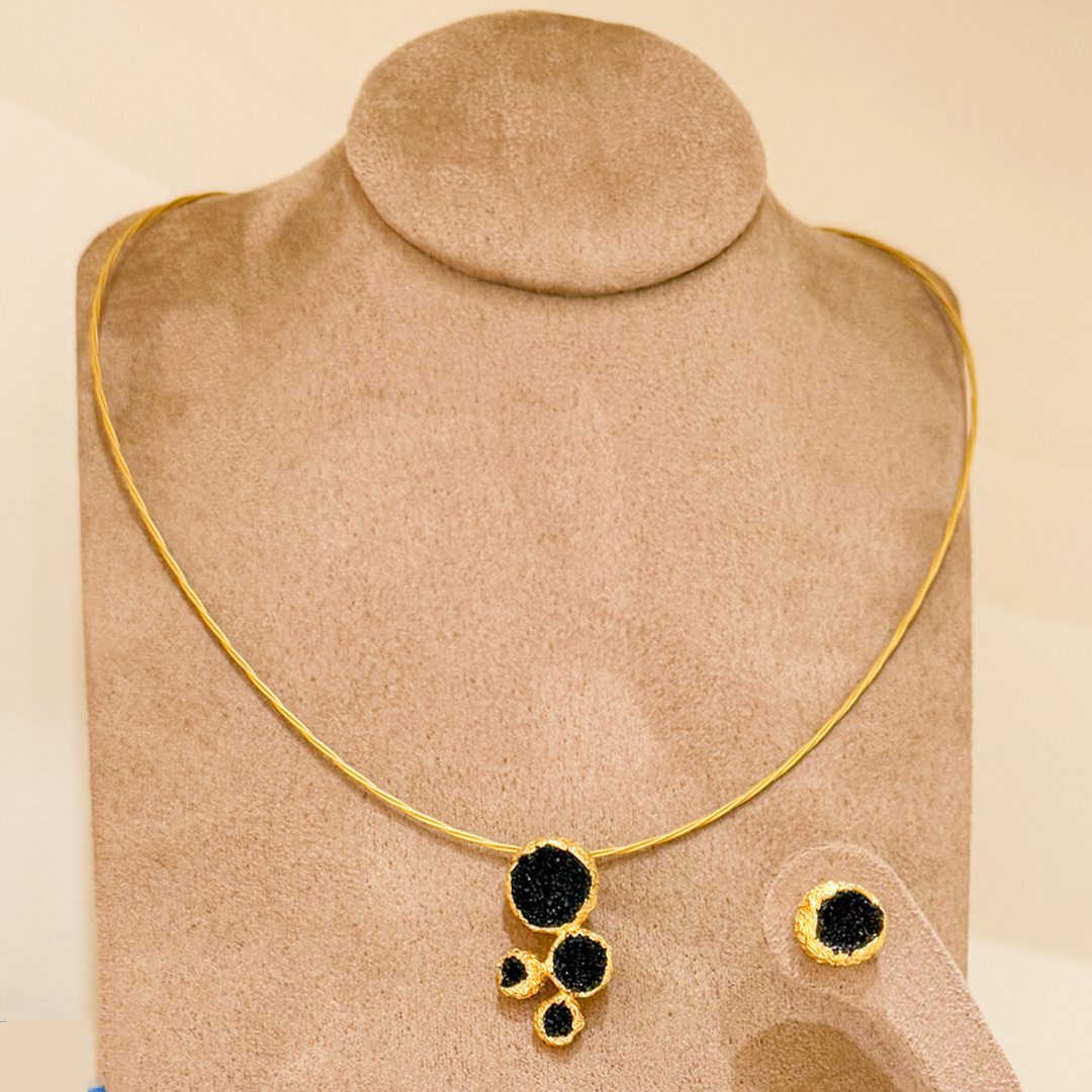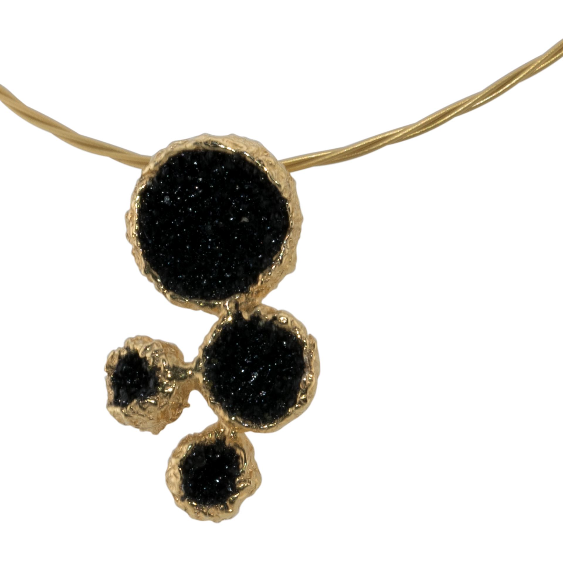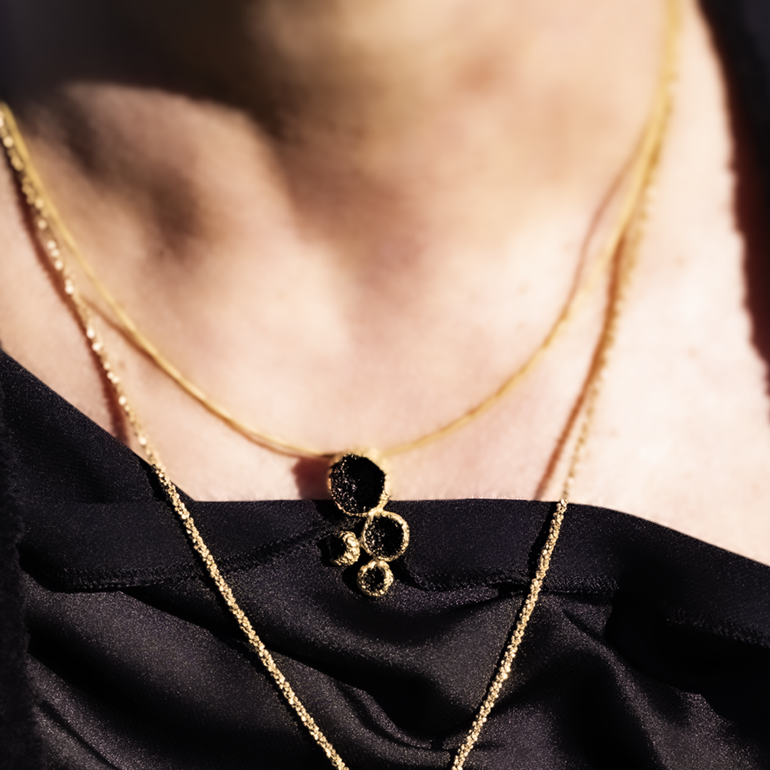Collana girocollo avvolgente con pendente in argento bagnato in oro decorato con polvere di lava nera. La catena in acciaio a più fili ha una lunghezza di 42 cm. Chiusura a moschettone.