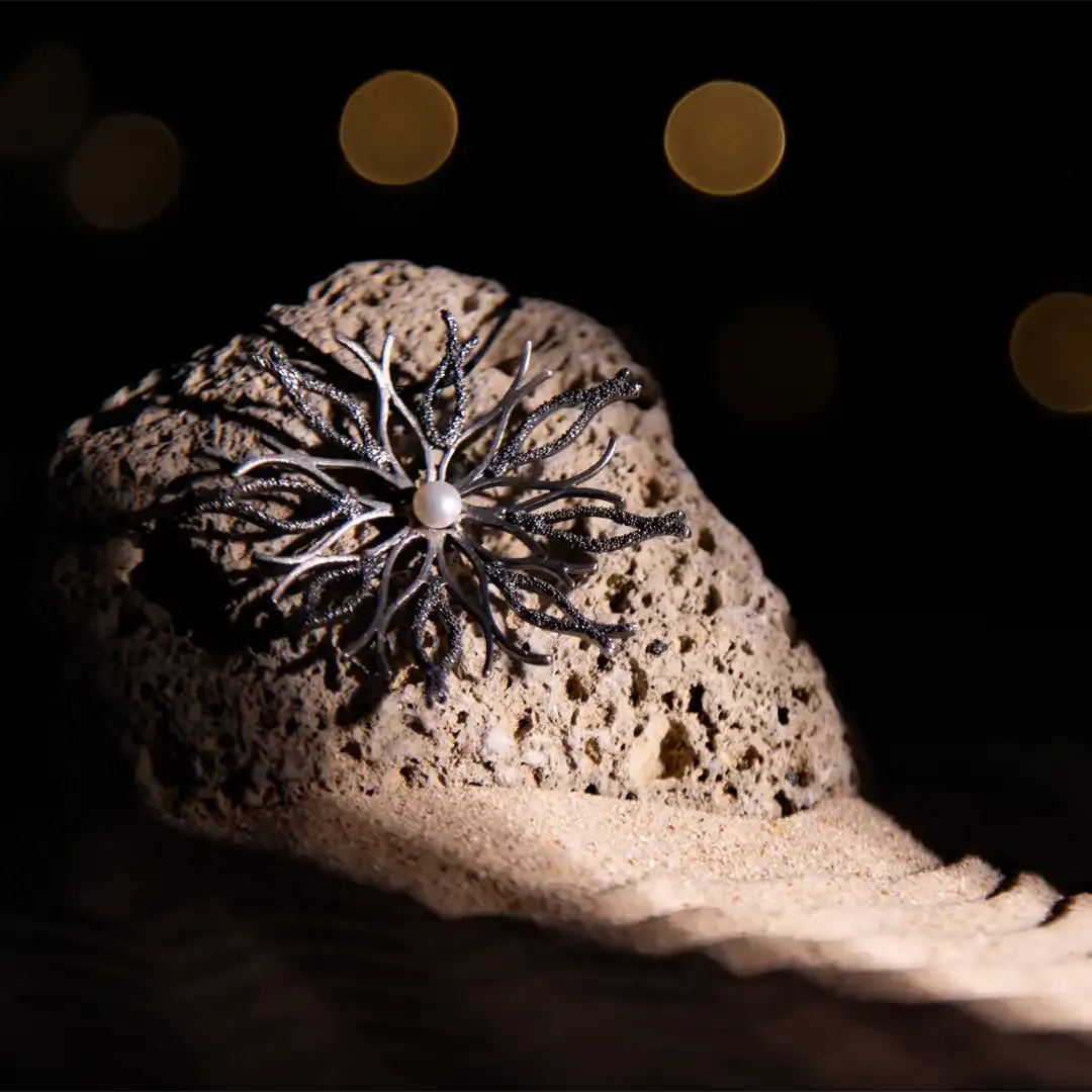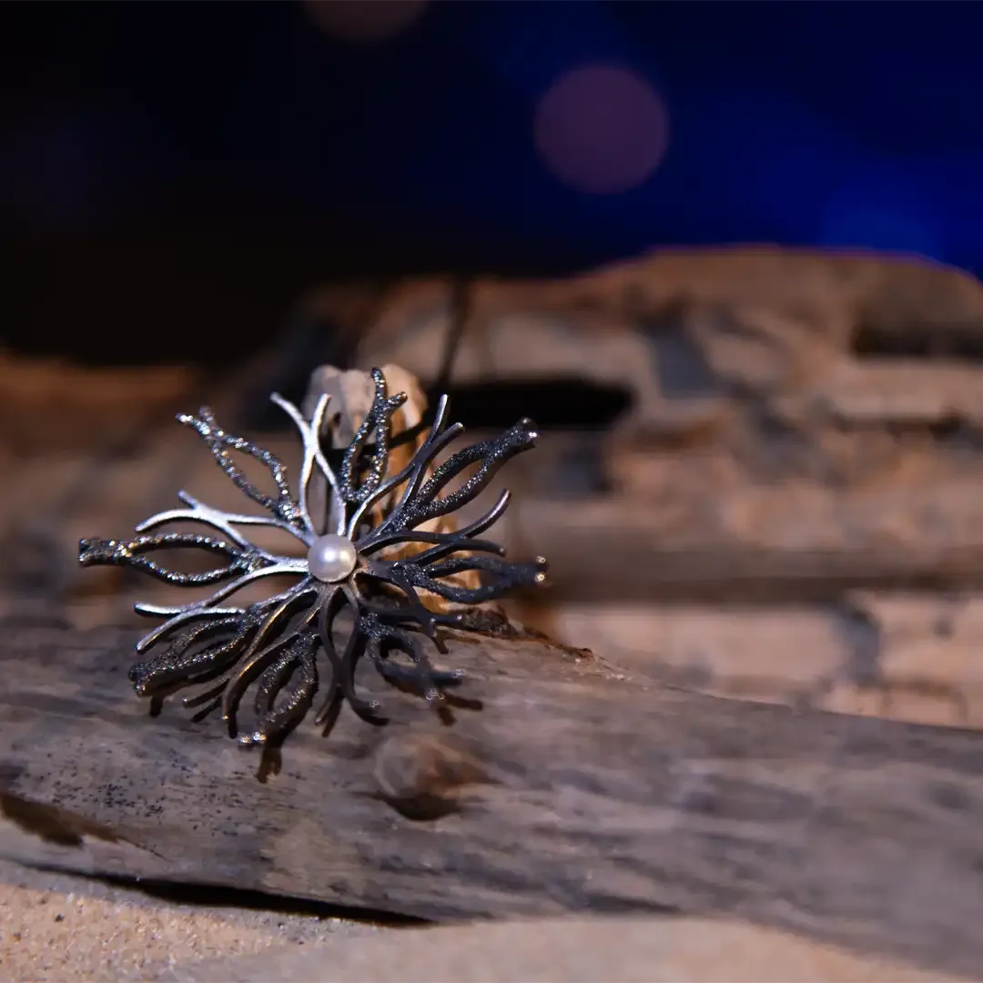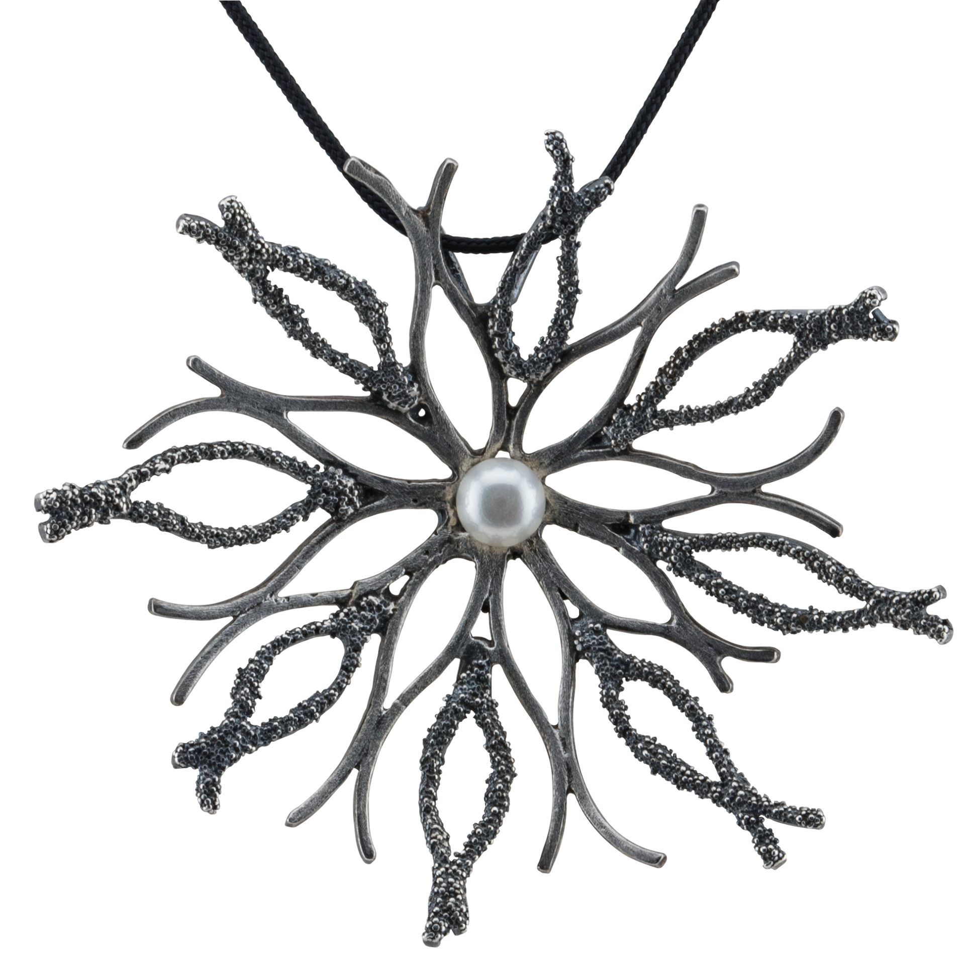 Collana pendente in argento con finitura in platino ispirato alla forma di una stella marina. Le sue linee sinuose e ramificate creano un disegno elegante e intricato, che cattura la luce in modo affascinante. Al centro del pendente spicca una delicata perla d’acqua dolce. Cordino in cotone nero cerato lungo 80 cm regolabile.