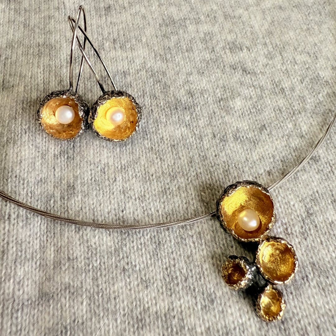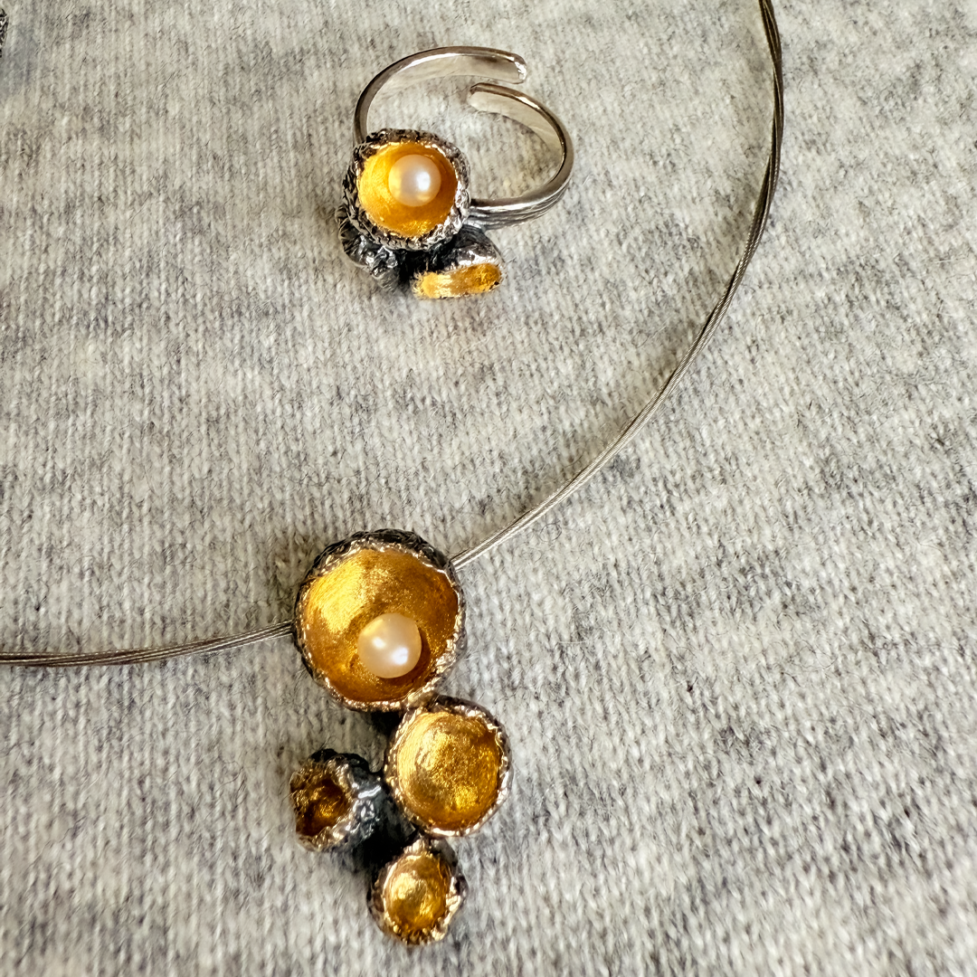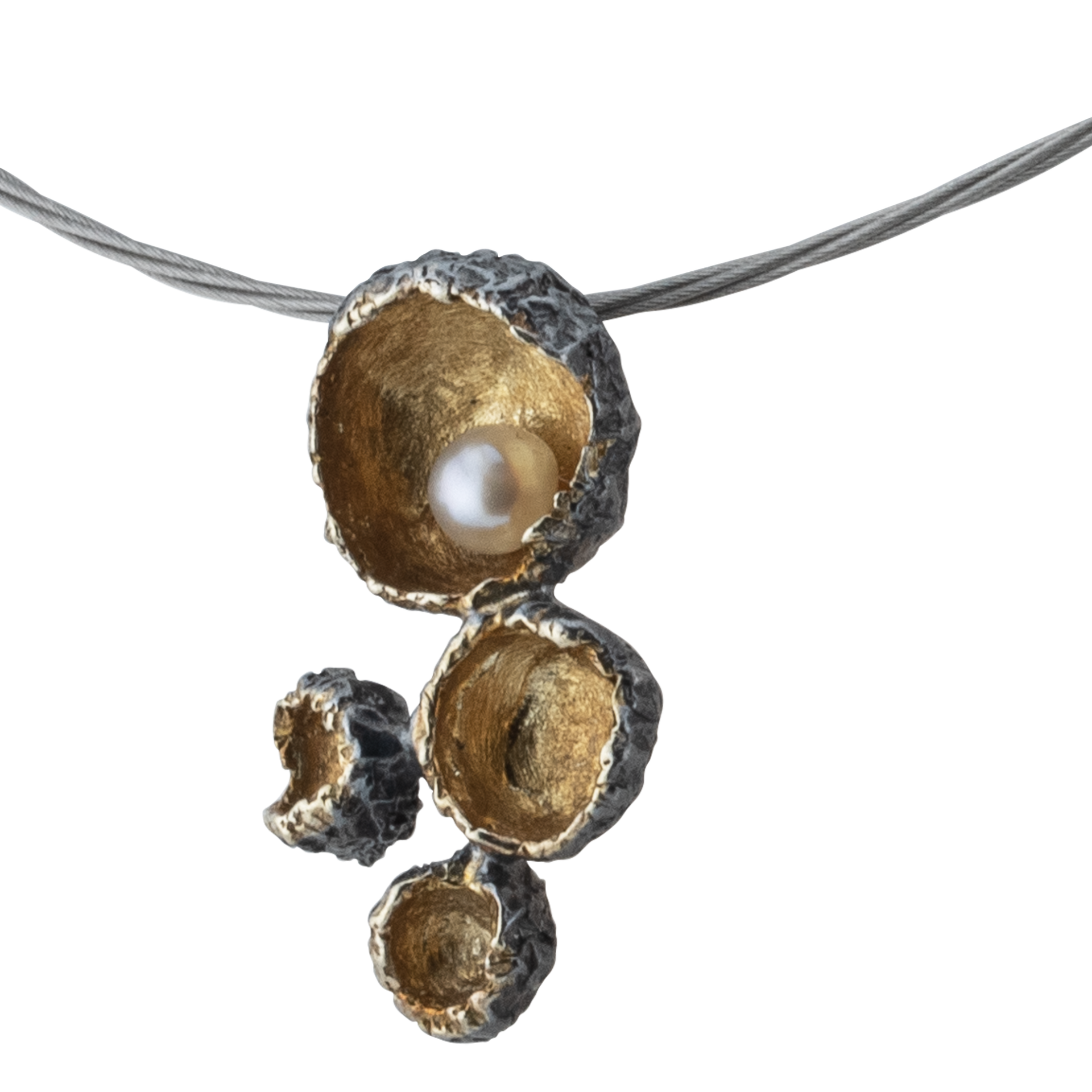Elegante collana artigianale con pendente a piccole coppe, arricchito da una perla centrale. L’interno dorato crea un suggestivo contrasto con la texture esterna in argento brunito. Un gioiello sofisticato e naturale.