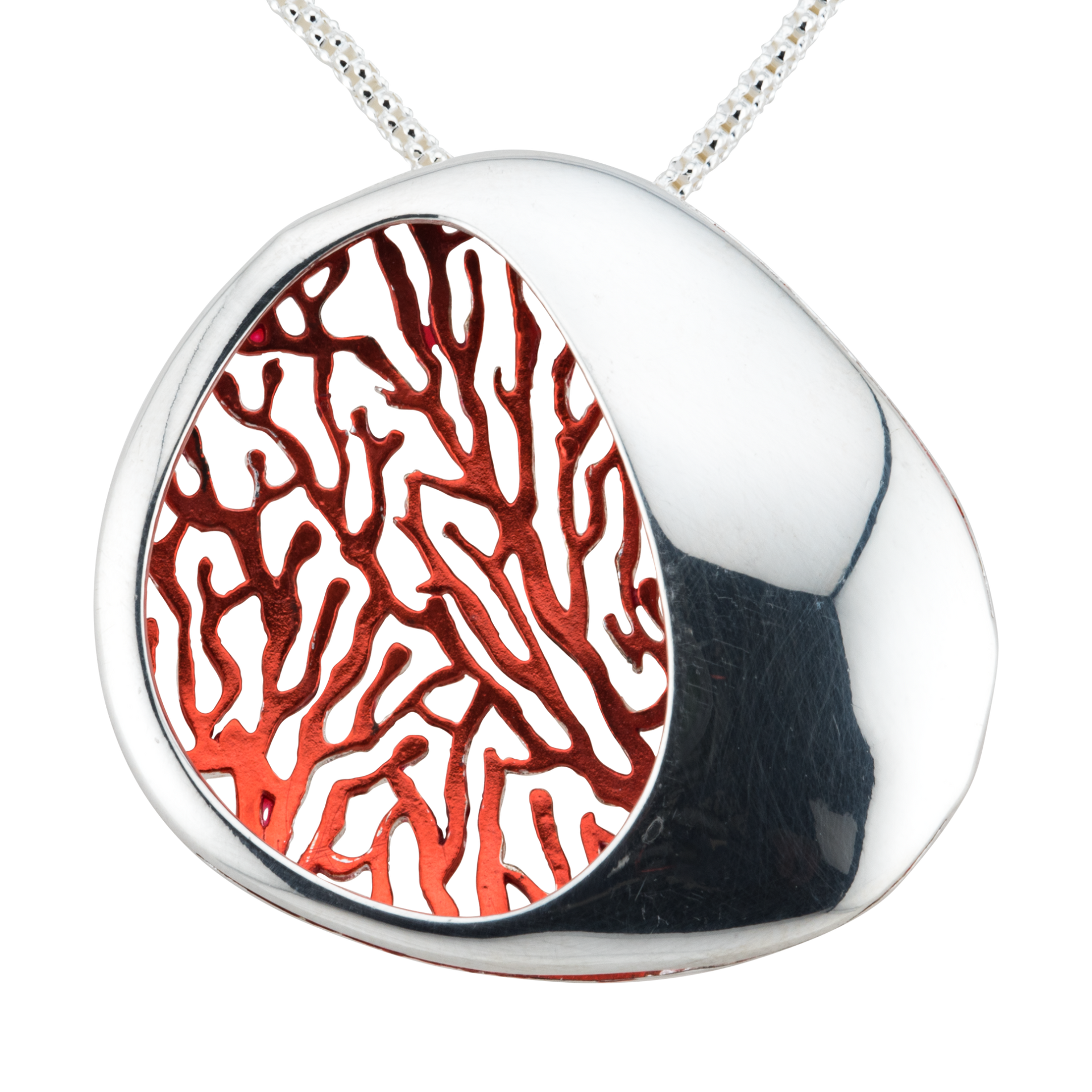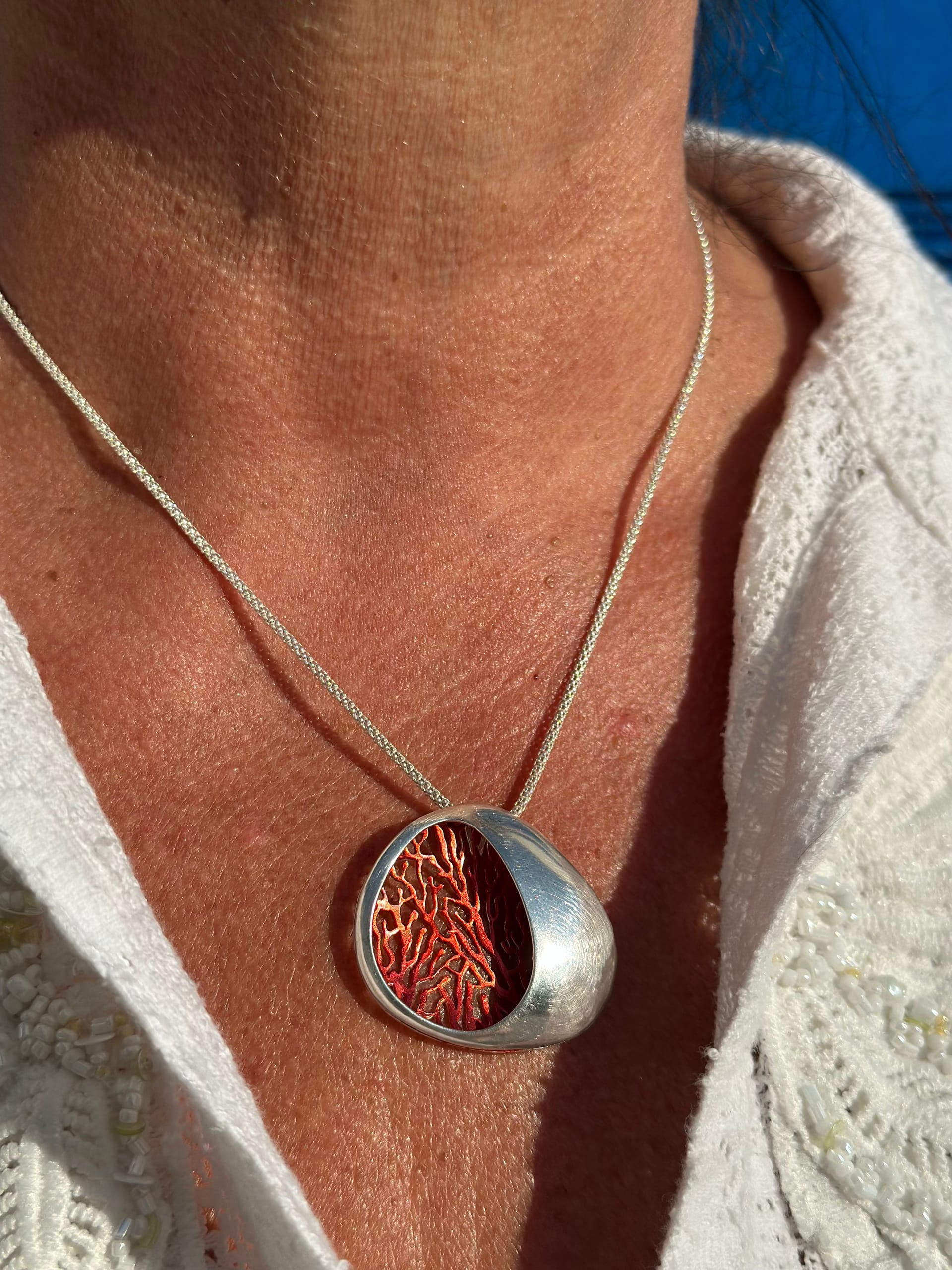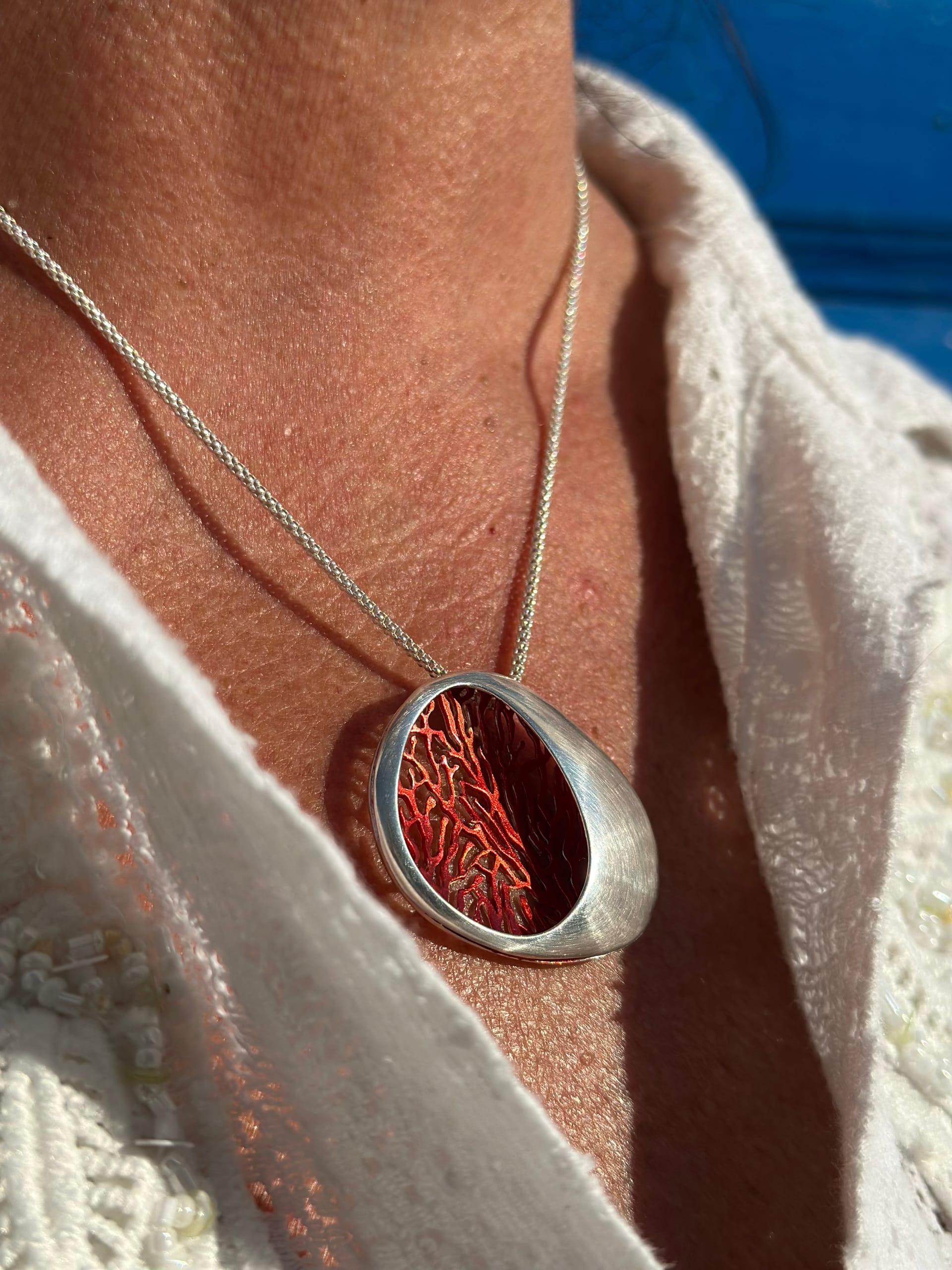 Collana in argento lucido con un pendente dal design unico, caratterizzato da un interno cesellato e smaltato che richiama le forme del corallo. Il contrasto tra l'argento brillante e il rosso intenso crea un effetto visivo sorprendente, rendendo questo gioiello un pezzo distintivo e affascinante. Lunghezza della catena 45 cm.