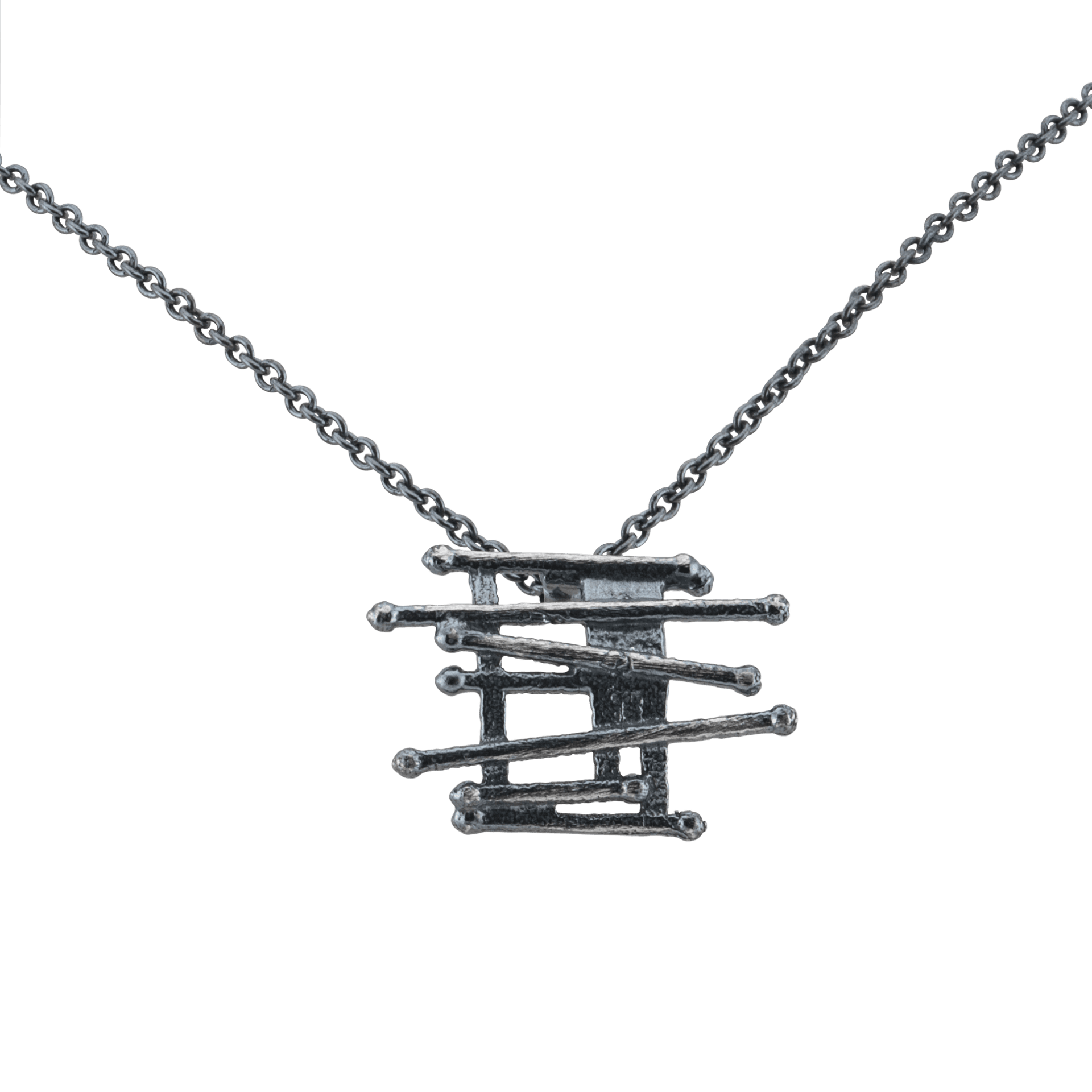 Collana in argento con un piccolo pendente dal design geometrico e moderno, caratterizzato da linee sovrapposte e intersecate. L'estetica minimalista rende questo gioiello un pezzo unico. Lunghezza della catena 42 cm.