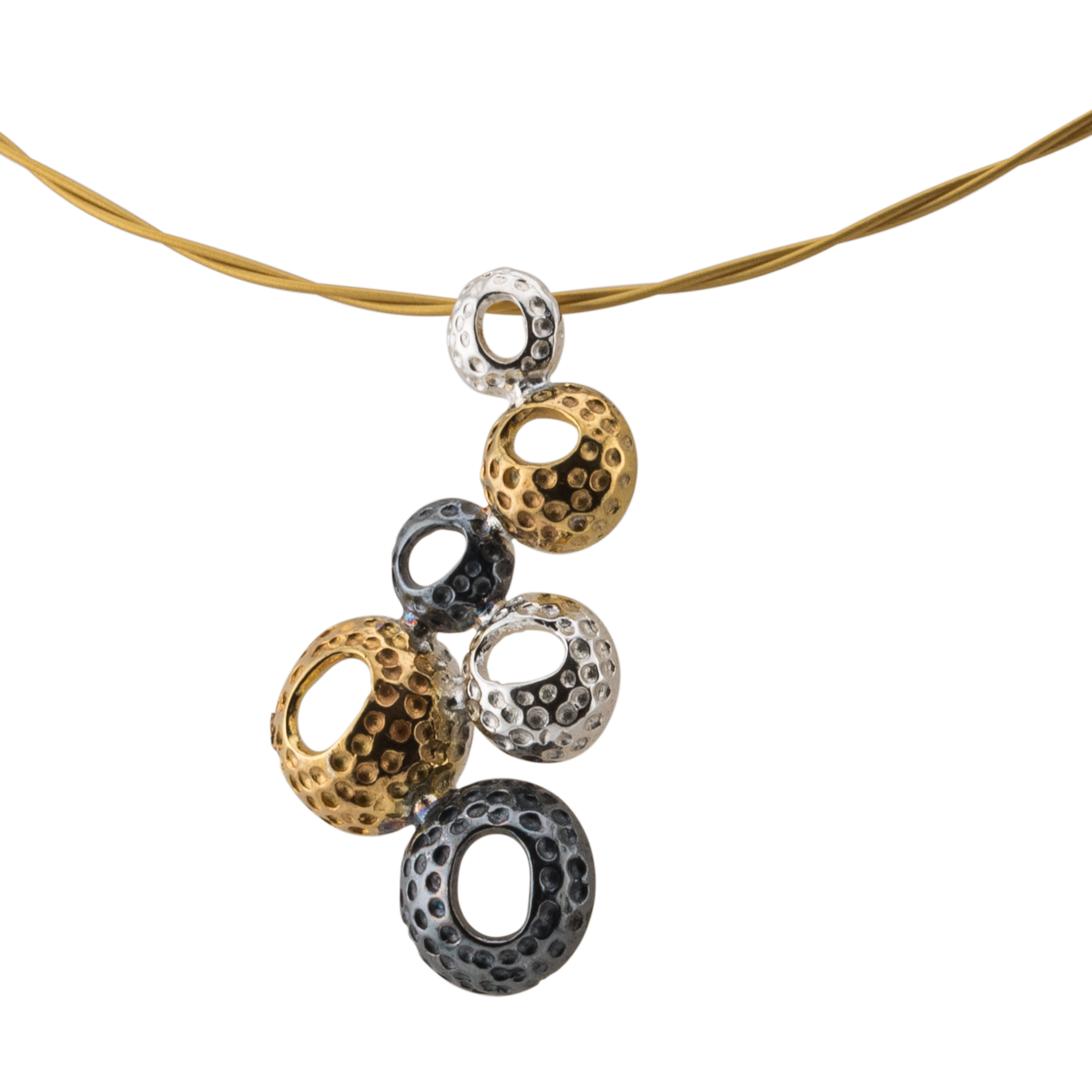 Collana con pendente in argento con elementi a cupola, rifiniti in tonalità dorate, brunite e argentate. Il design tridimensionale ricorda la struttura di un riccio di mare. La catena a più fili in acciaio è lunga 42 cm.