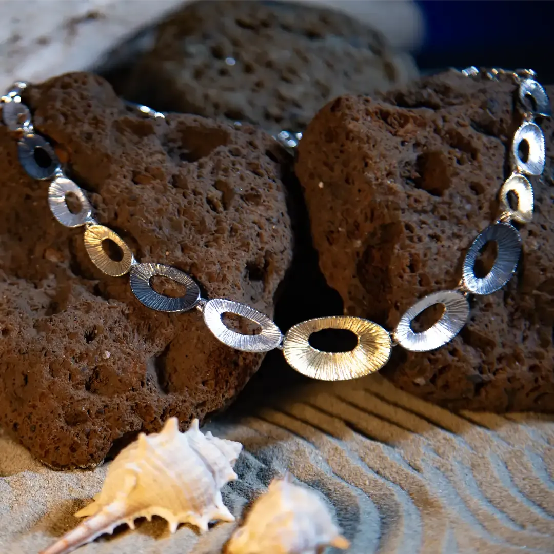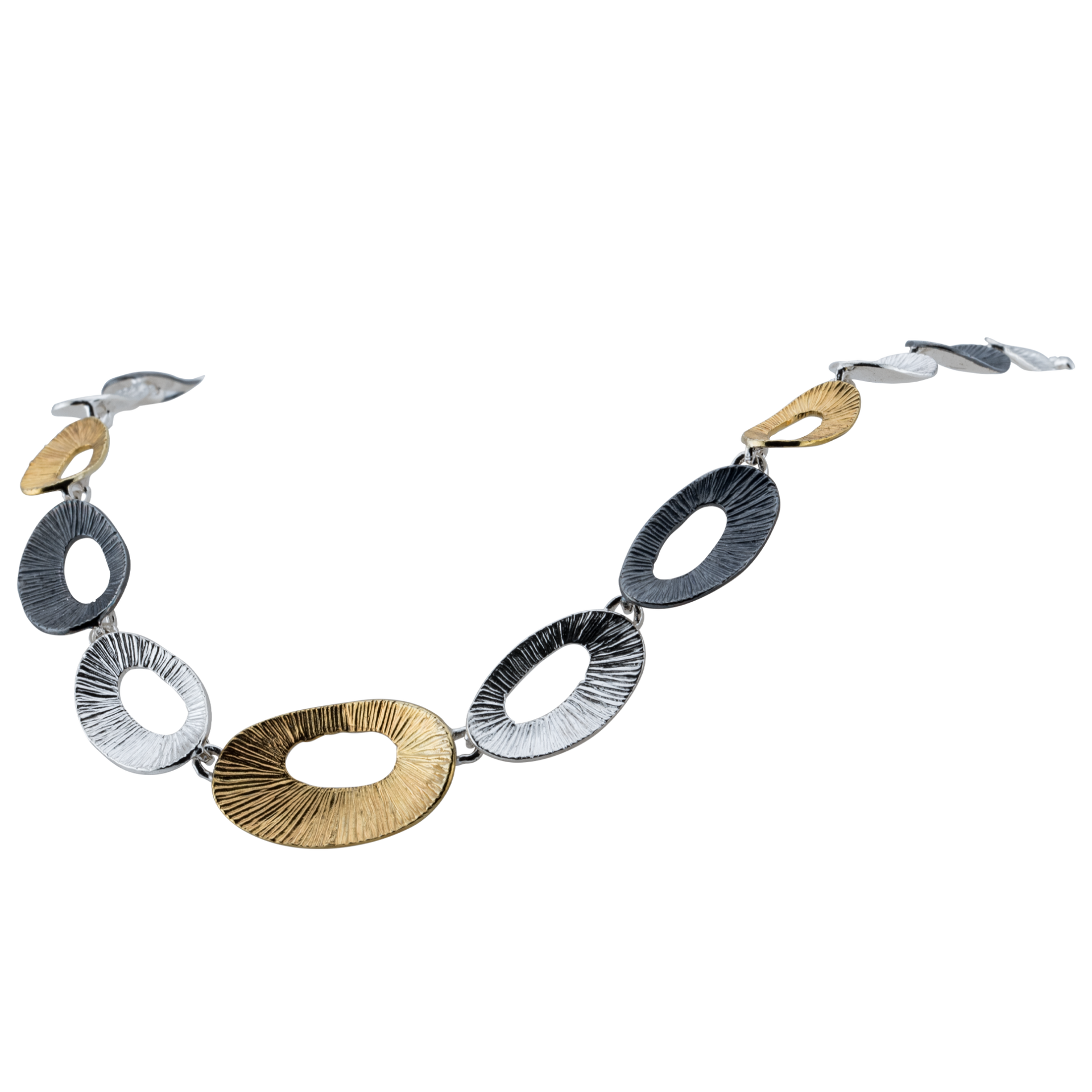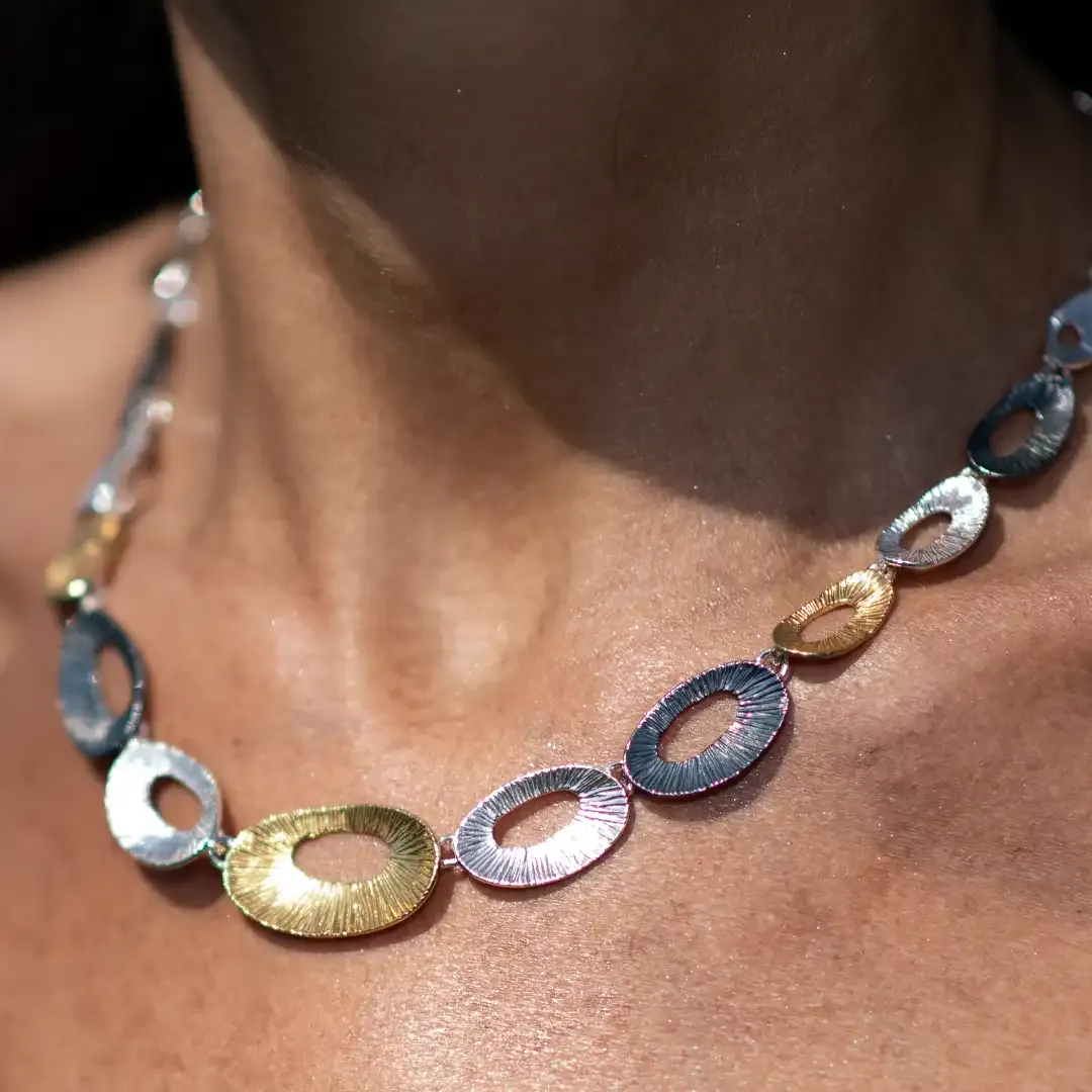 Collana realizzata con piccole piastre in argento, argento brunito e argento dorato dal design elegante e contemporaneo. La lunghezza della collana è 42 cm + 5 cm di allungo con chiusura a moschettone.