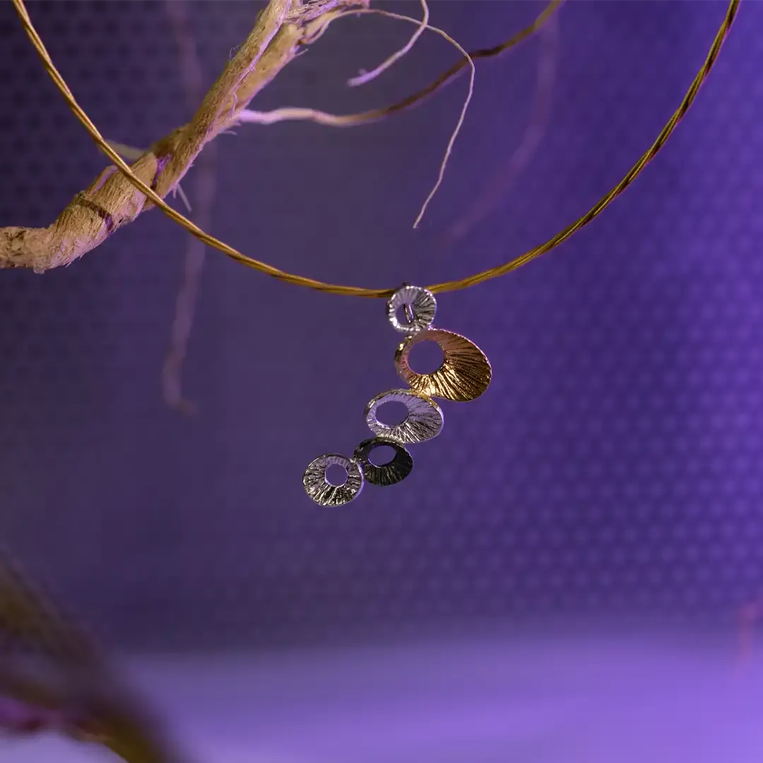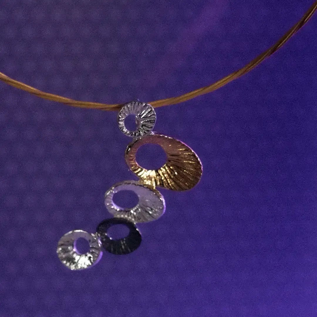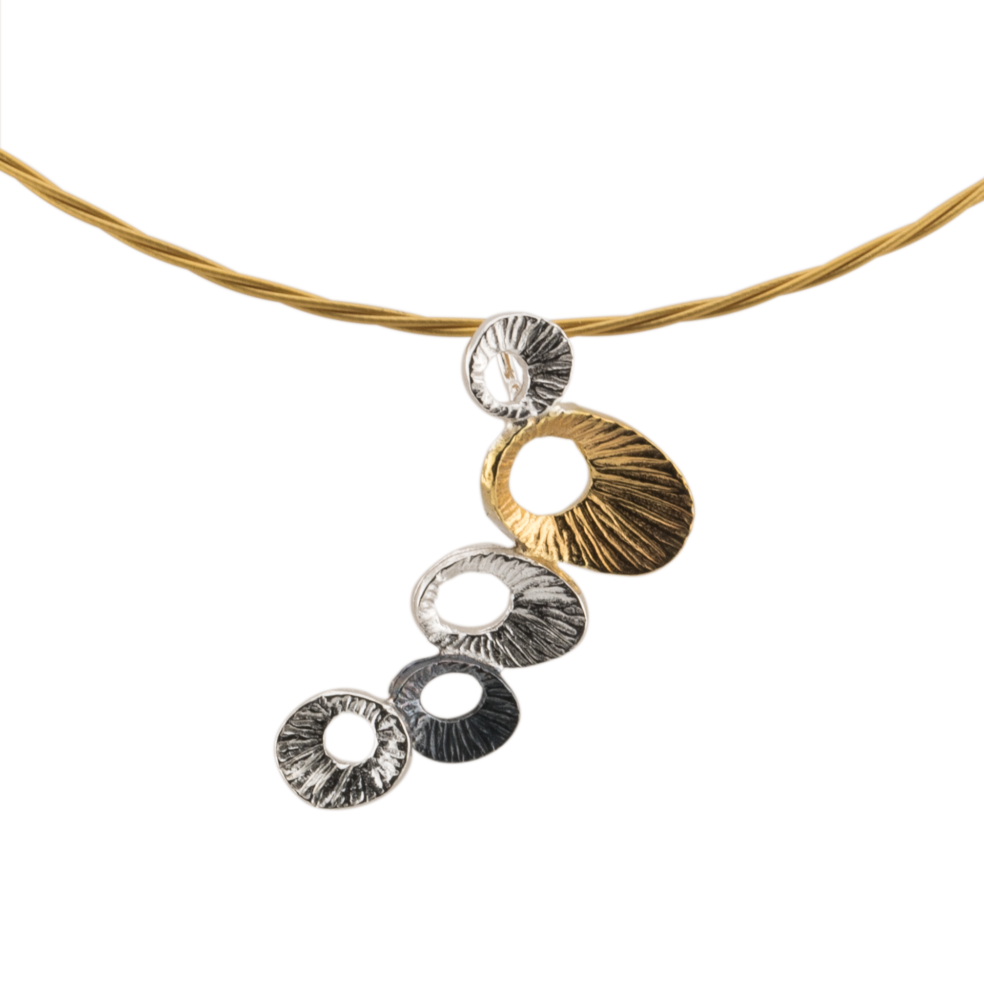 Collana girocollo con pendente realizzato interamente in argento 925 con piccole piastre lavorate. La catena dalla lunghezza di 42 cm è realizzata in acciaio con chiusura in argento.