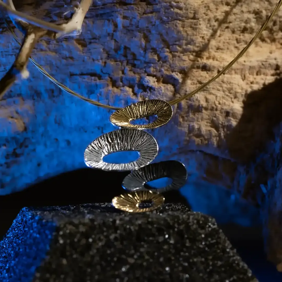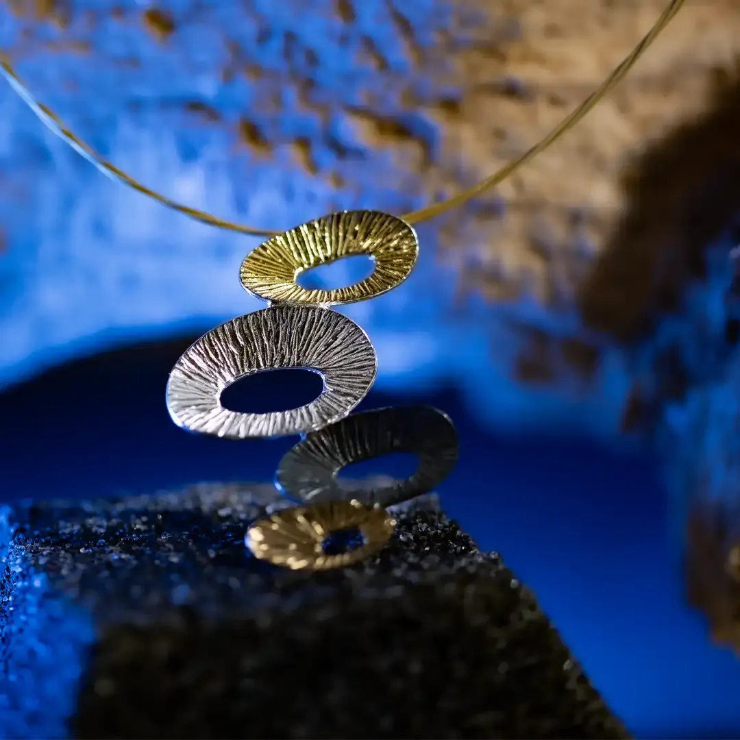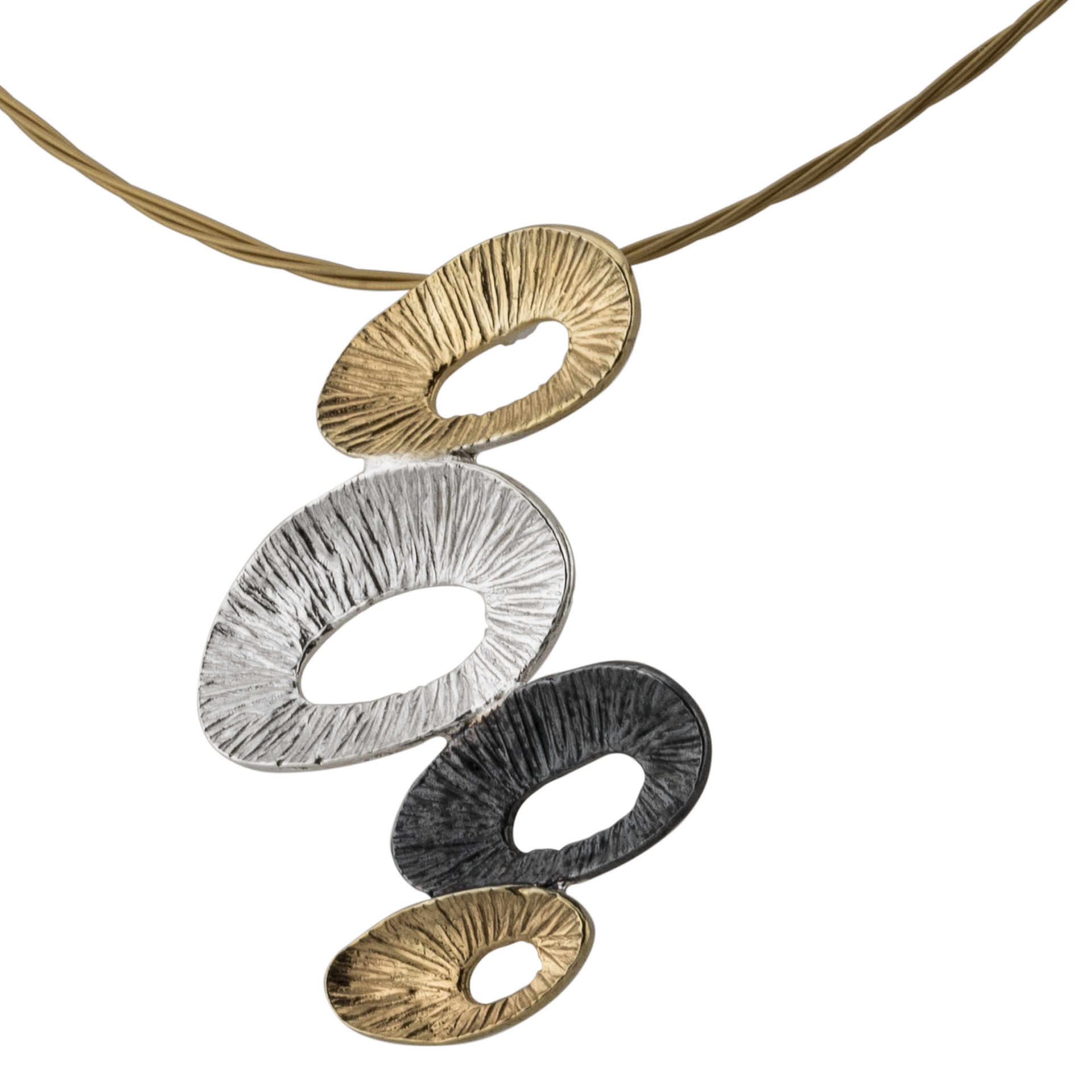 Collana girocollo avvolgente con pendente realizzato interamente in argento 925 con piccole piastre lavorate. La catena dalla lunghezza di 42 cm è realizzata in acciaio con chiusura in argento.