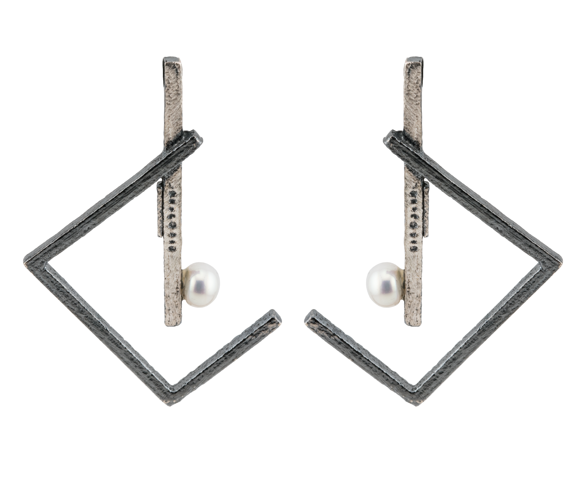 Orecchini in argento dal design geometrico e asimmetrico, caratterizzati da linee angolari. Una perla bianca d’acqua dolce, posizionata strategicamente, aggiunge un tocco di eleganza a questo gioiello. Chiusura a farfalla.