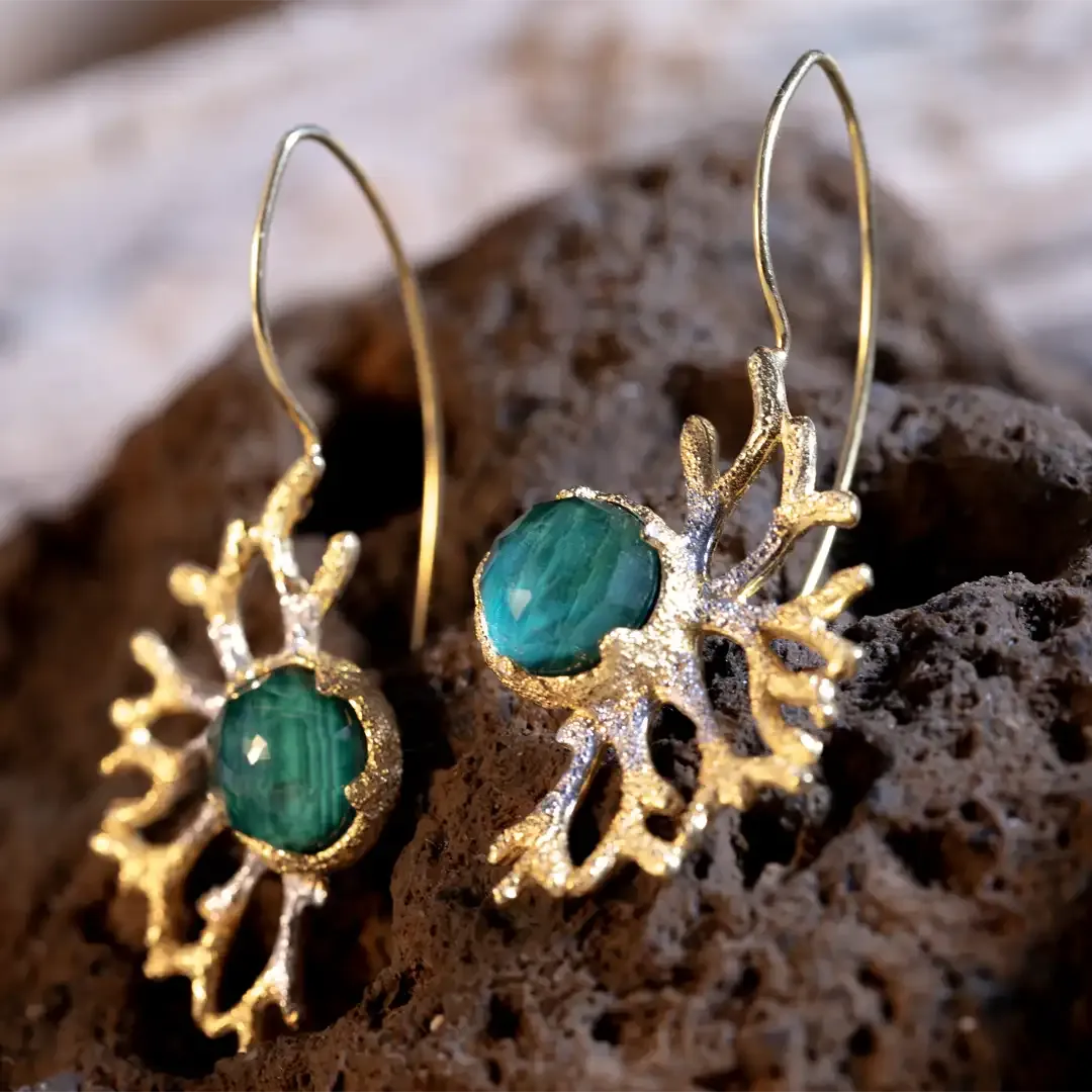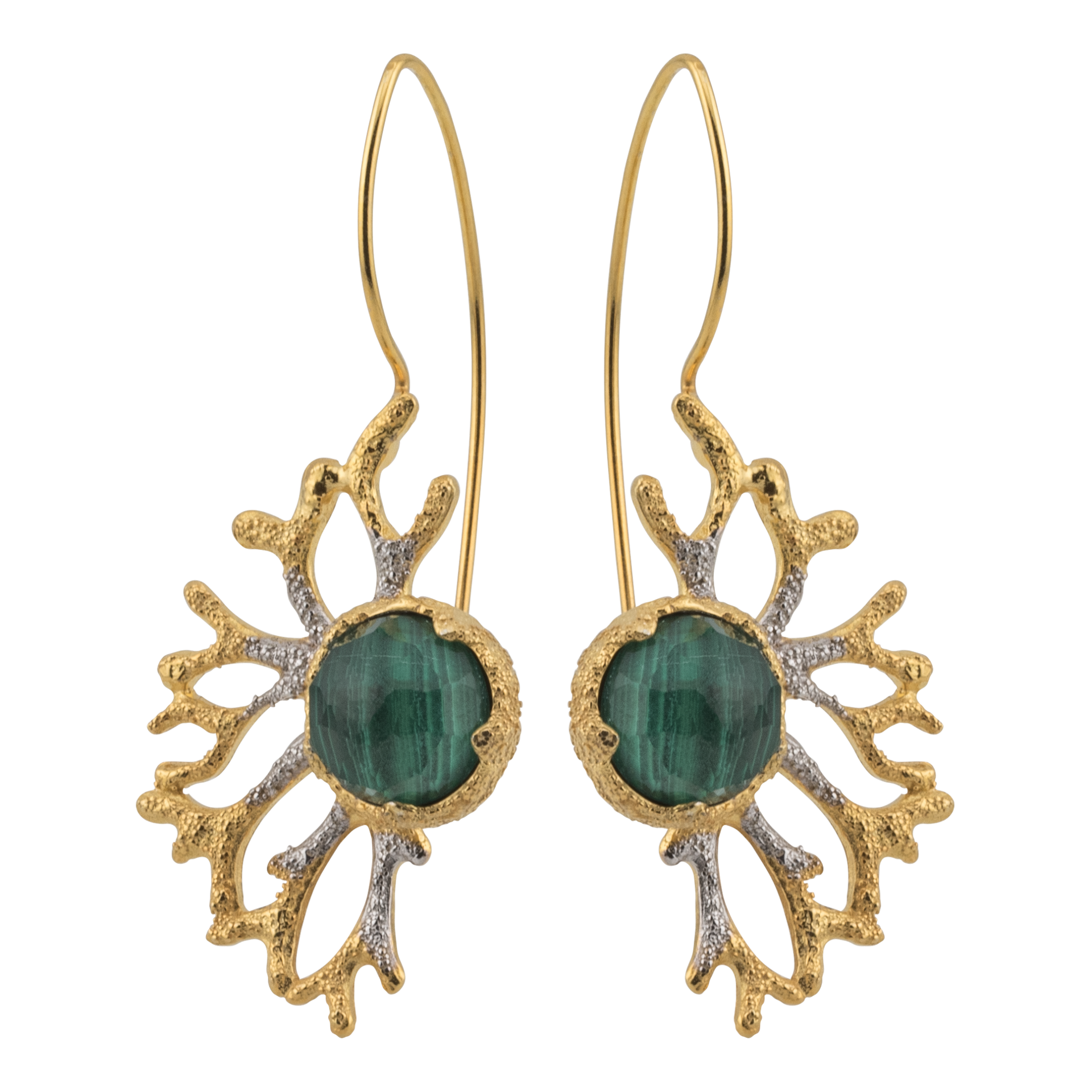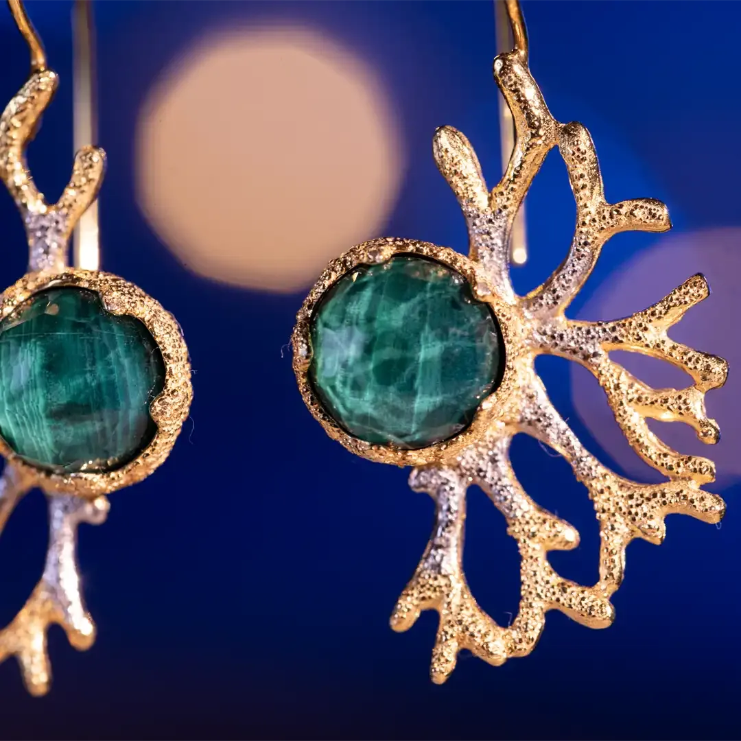 Orecchini artigianali in argento 925, placcati in oro 24 carati, con due malachiti naturali dal verde intenso incastonate al centro. Dotati di chiusura ad amo, questi orecchini combinano eleganza e qualità artigianale per un look sofisticato.