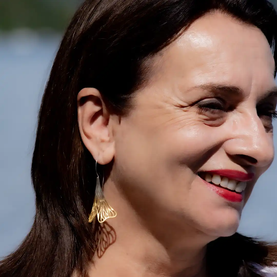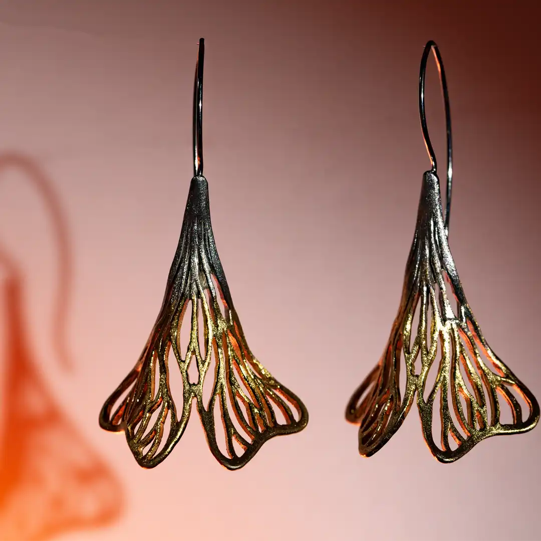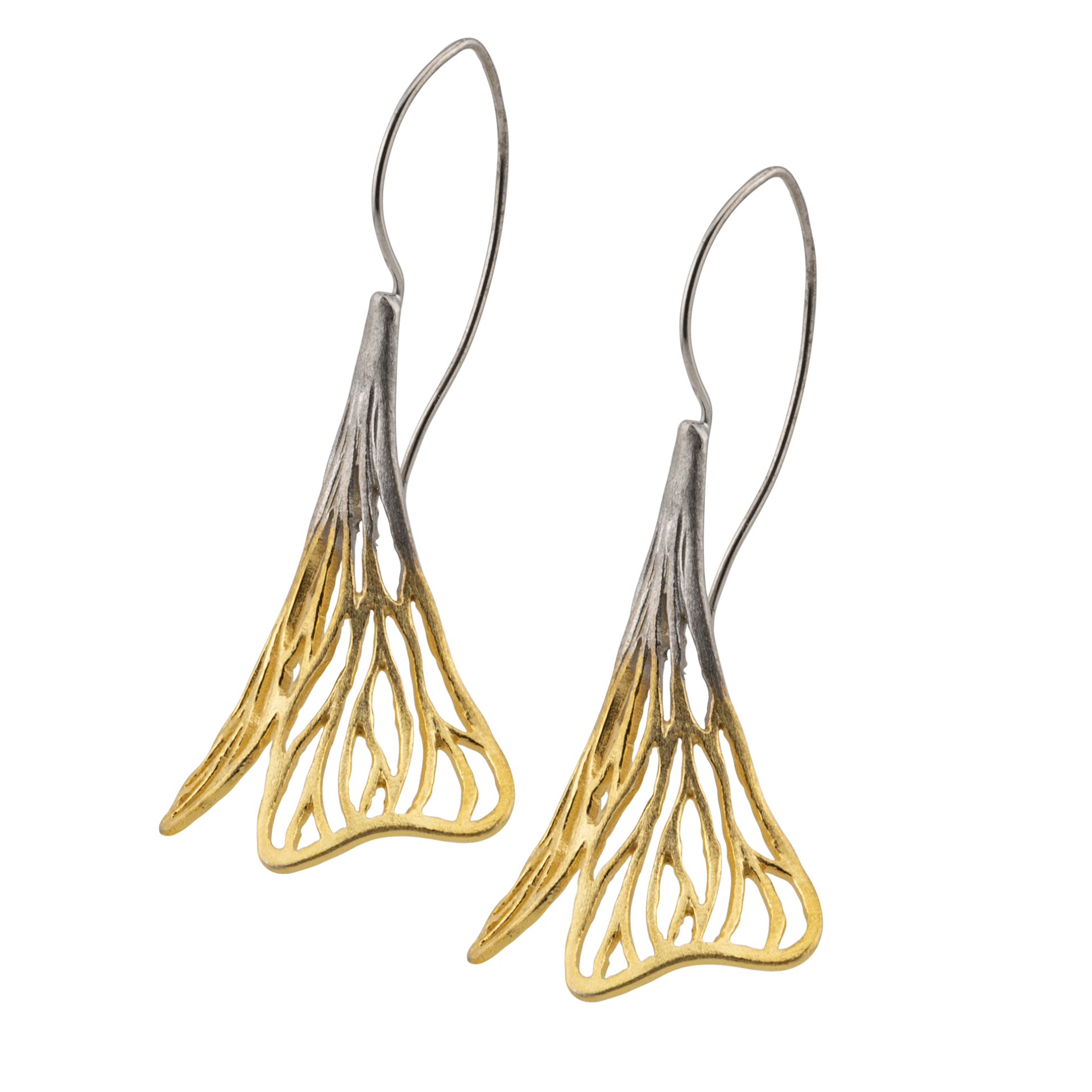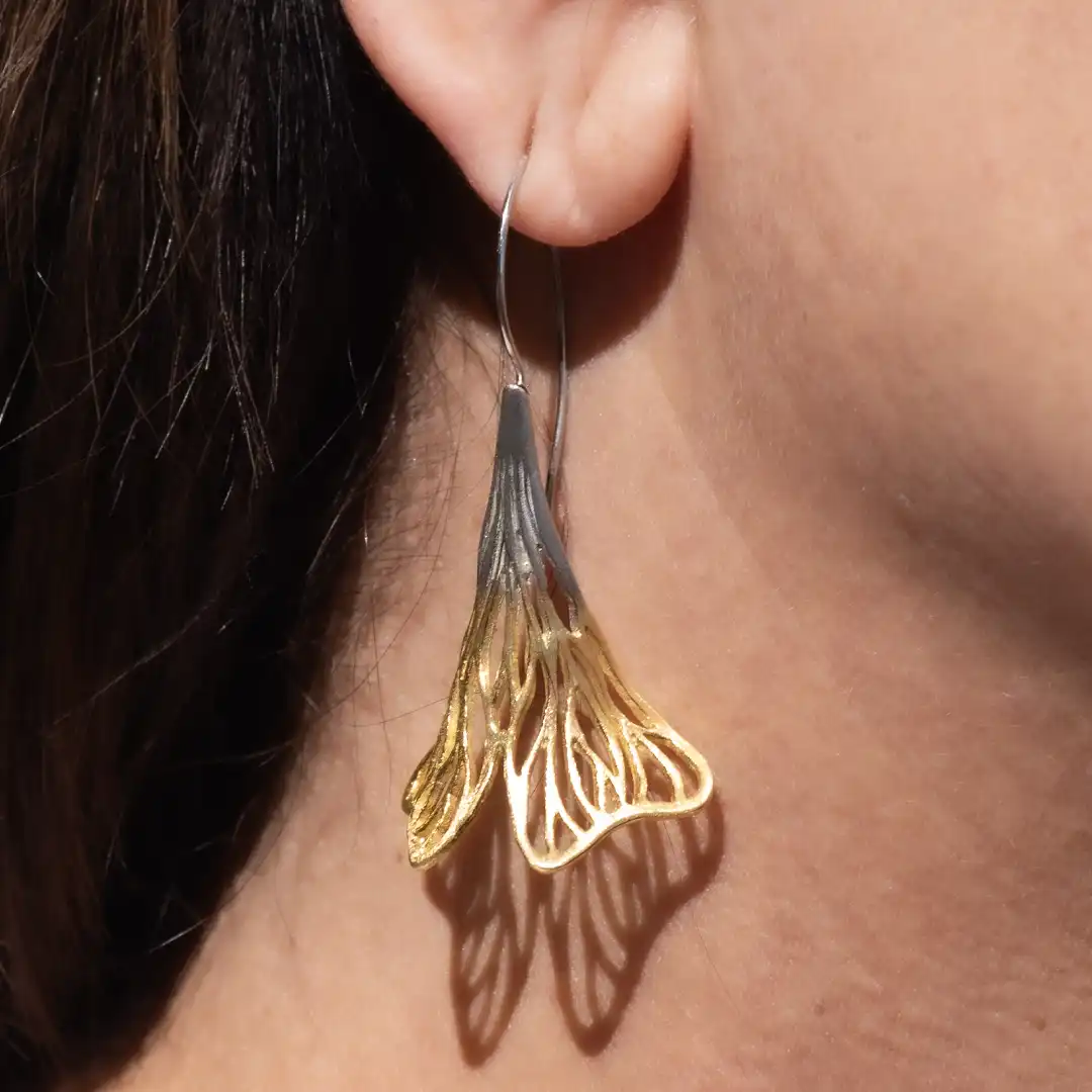 Orecchini artigianali in argento con bagno io oro 24 carati e finitura in platino che si espandono in una delicata forma a ventaglio. Le linee sottili e fluide evocano la leggerezza di una foglia di ginko, creando un effetto elegante e arioso.
