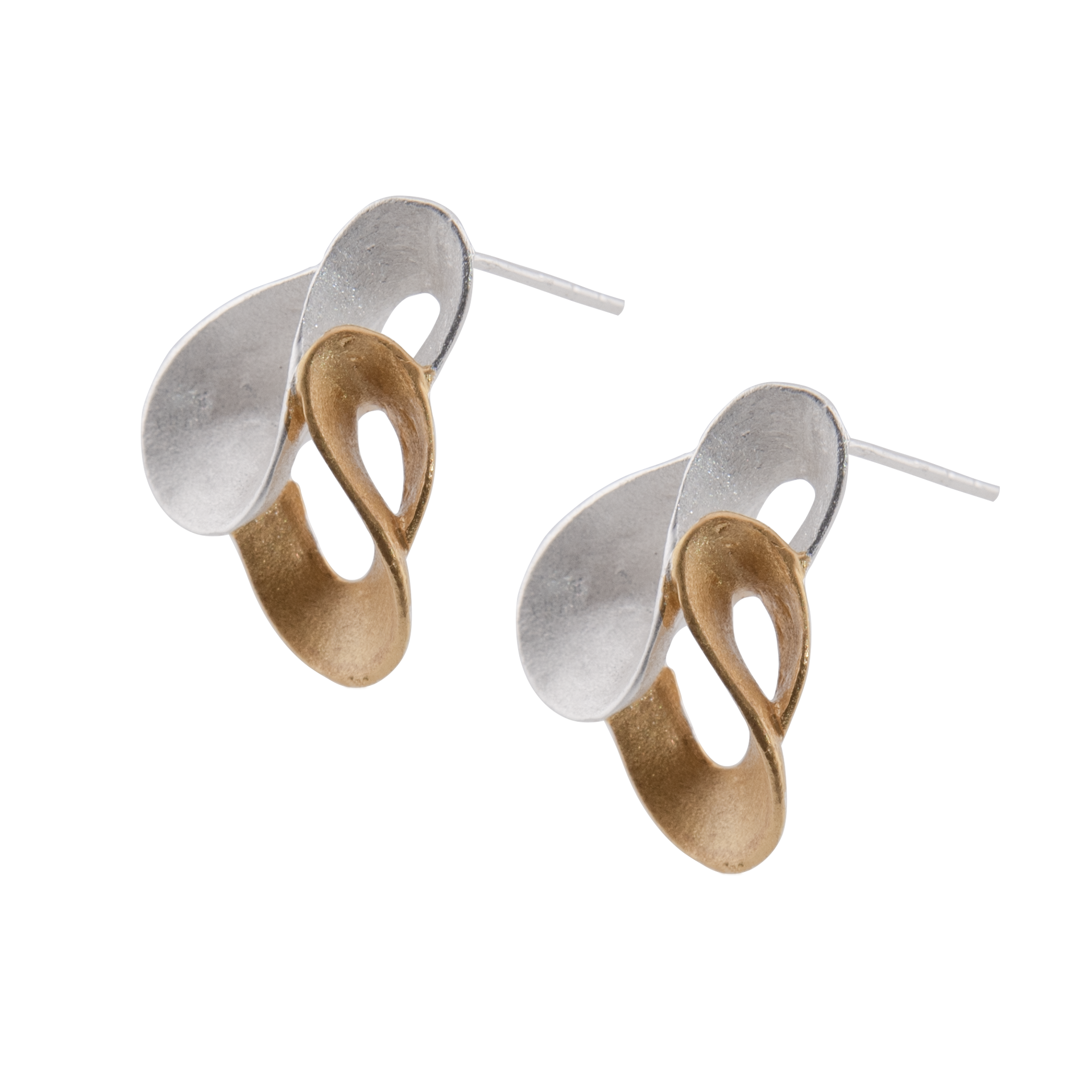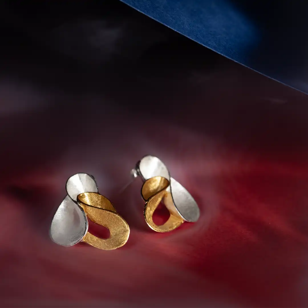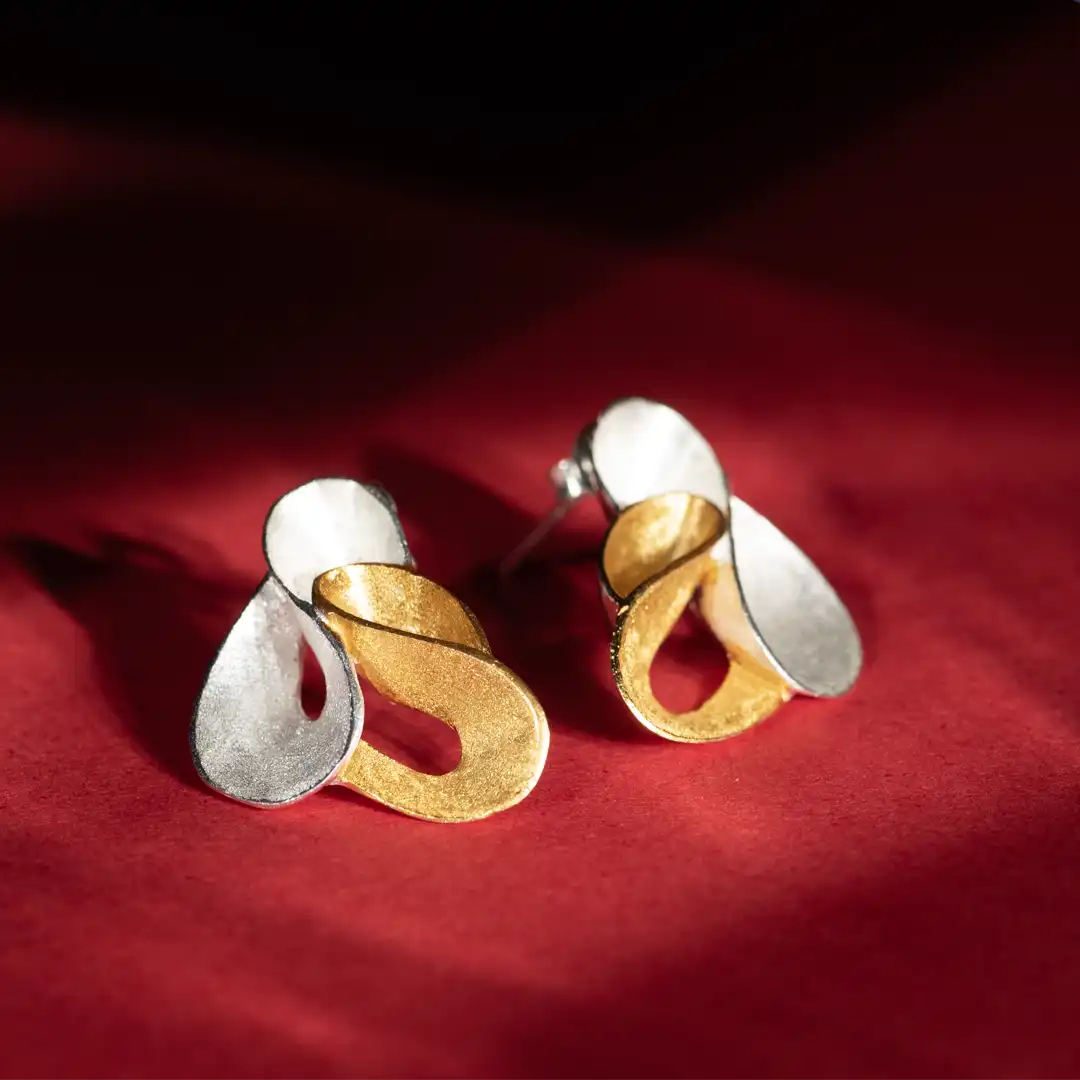 Orecchino artigianale in argento 925 e bagno in oro 24 carati, caratterizzato da un design intrecciato che unisce armoniosamente i due colori. Le forme sinuose e avvolgenti creano un effetto scultoreo, conferendo a questo gioiello un tocco di modernità e raffinatezza, perfetto per un look sofisticato e originale. Chiusura a farfalla.