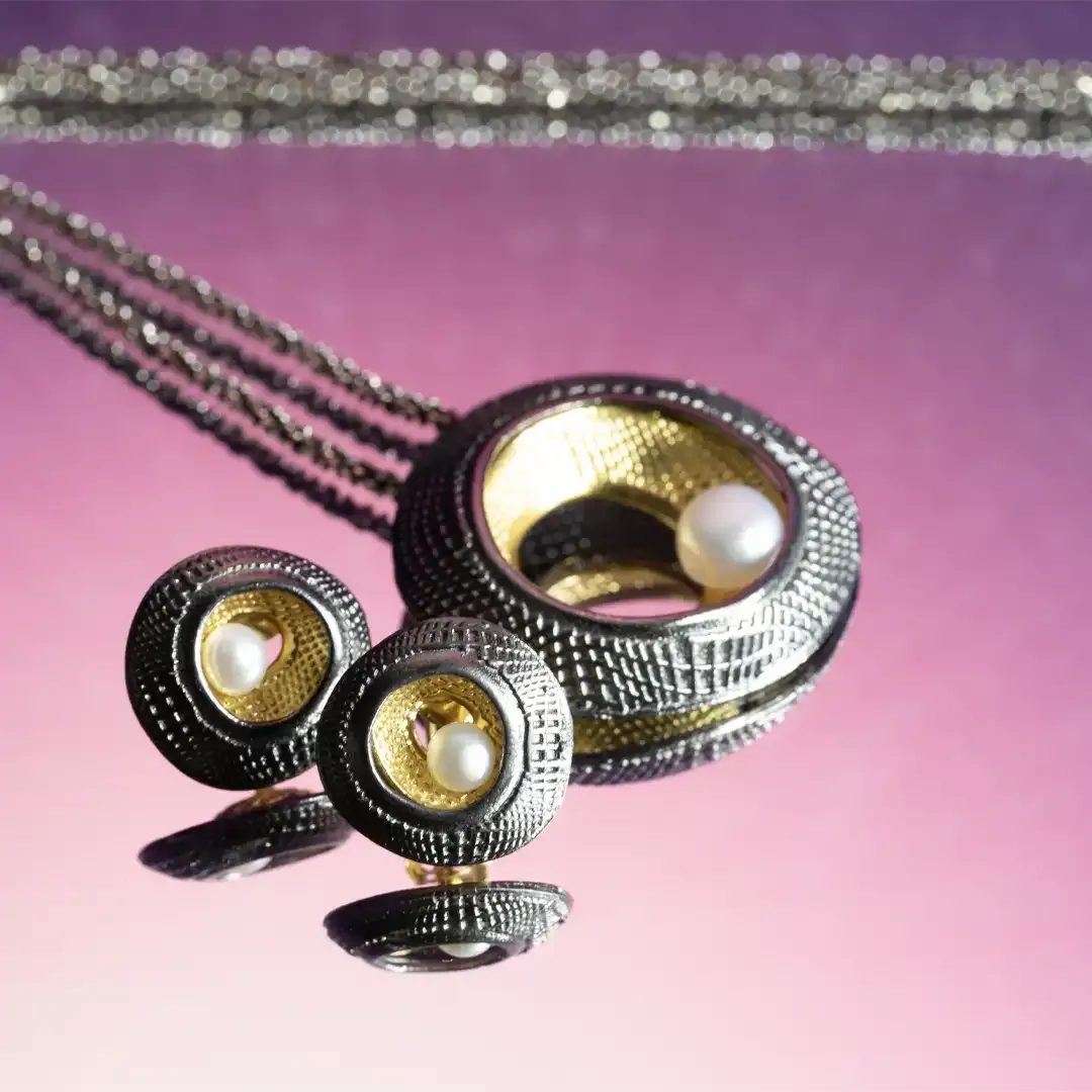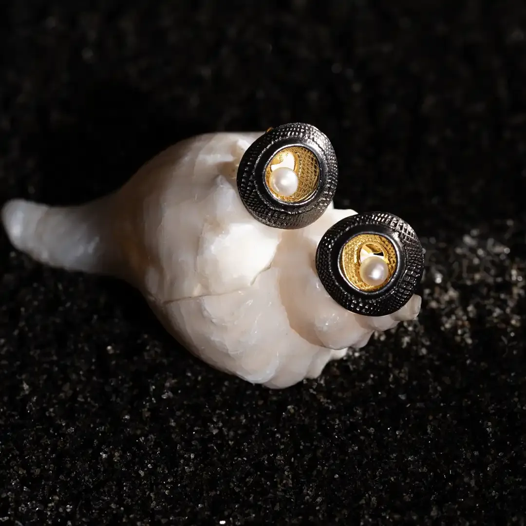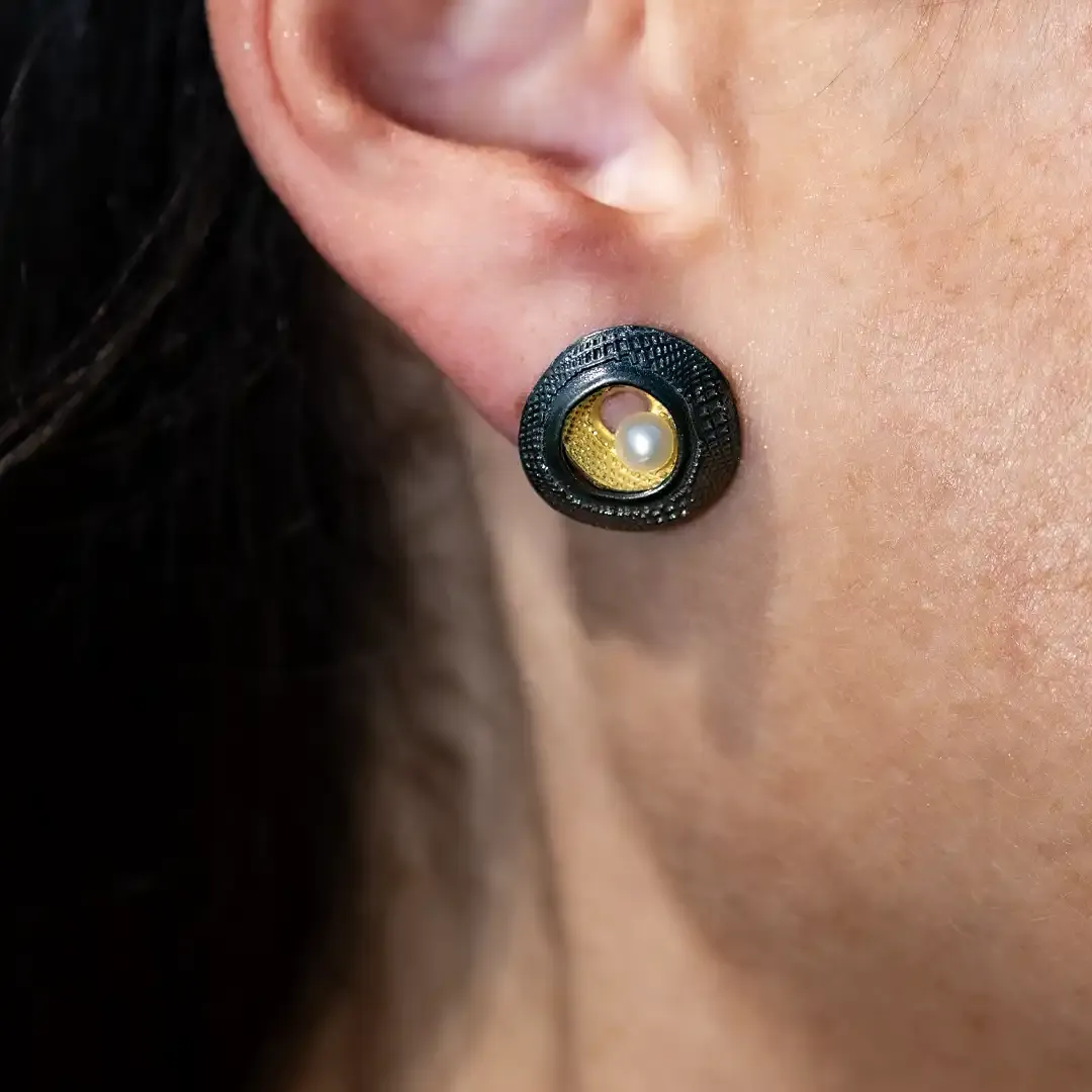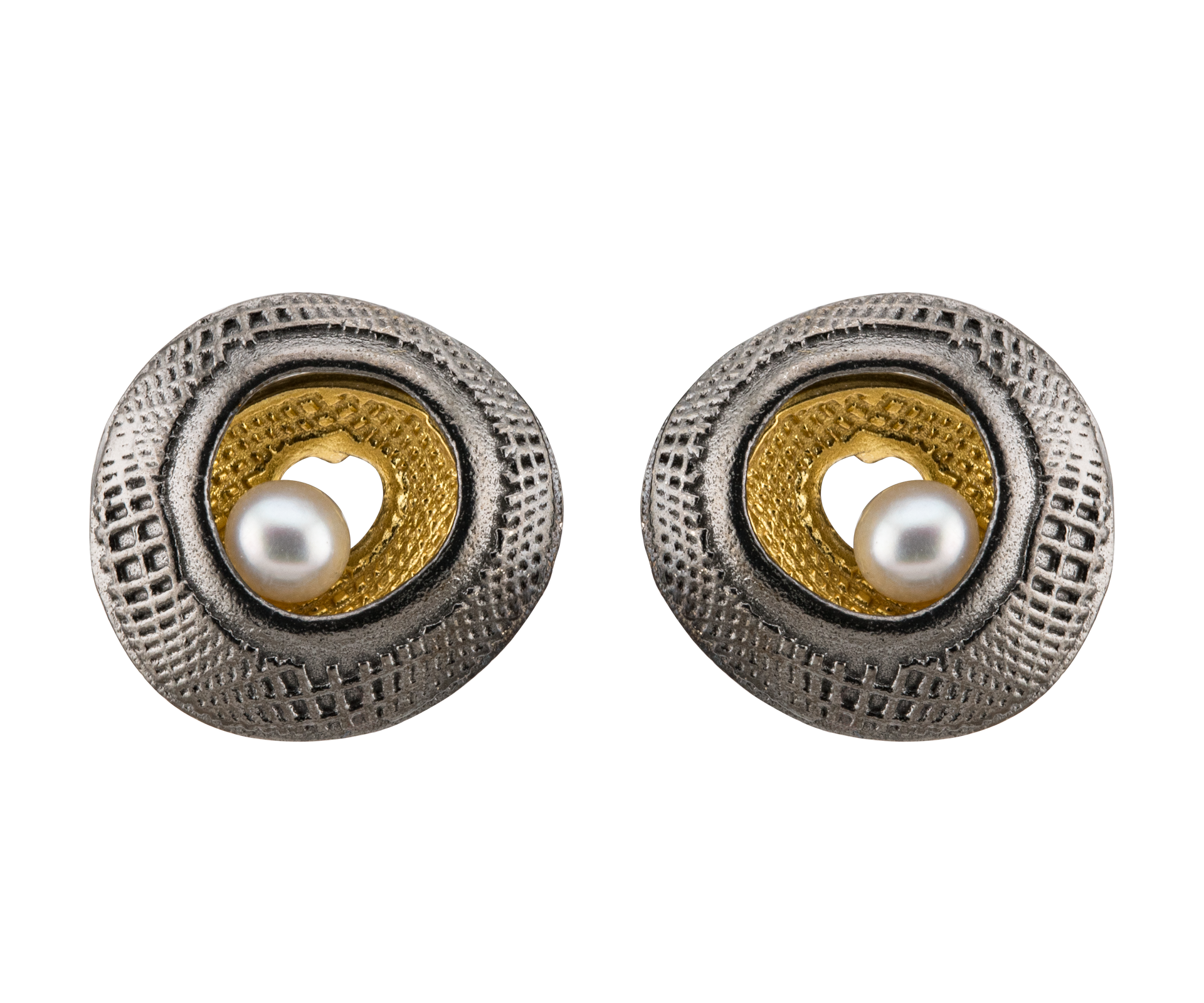 Orecchini a lobo in argento 925 e argento bagno oro24 carati. All’interno una perla d’acqua dolce dona lucentezza al gioiello. Diametro 15 mm. Chiusura a farfalla.