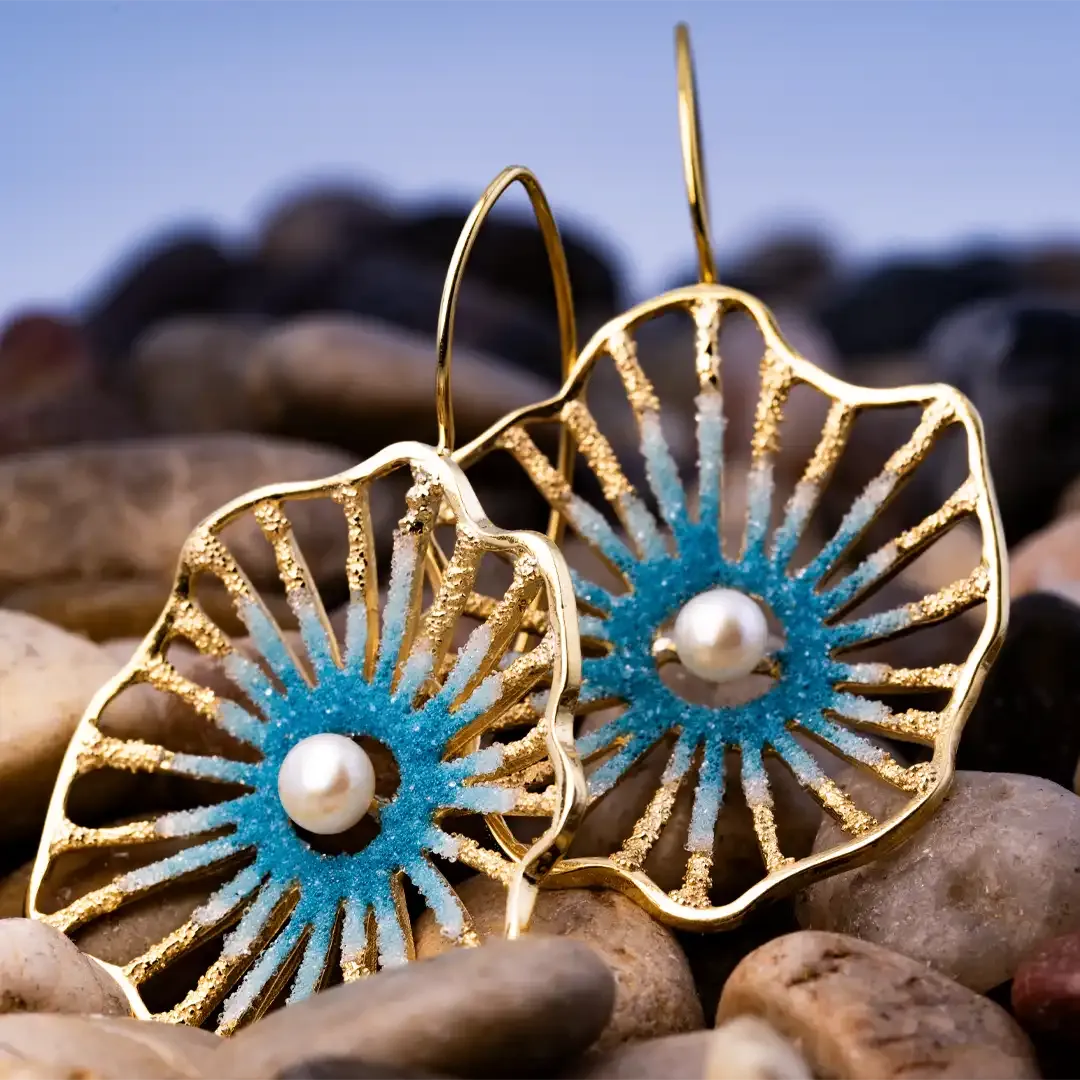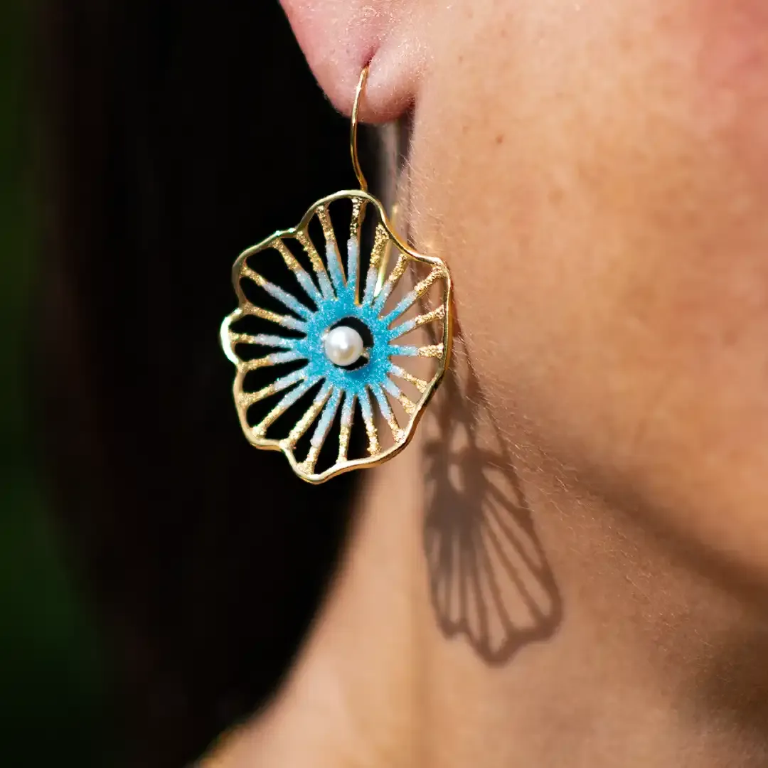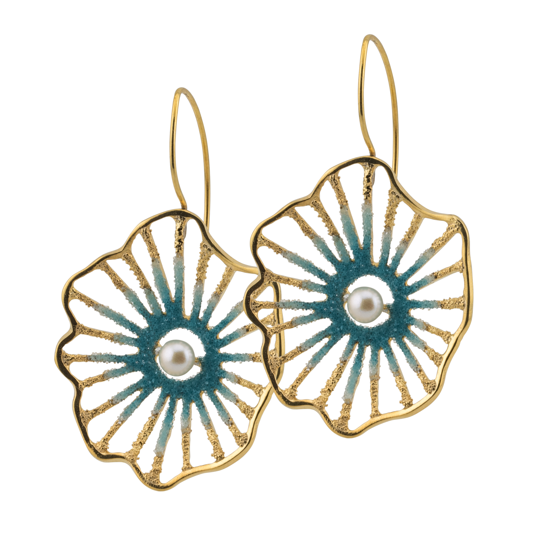 Orecchini realizzati artigianalmente in argento 925 con bagno in oro giallo 24 carati. La delicata forma è impreziosita da una perla d’acqua dolce e da un’applicazione in microcristalli dall’azzurro intenso.