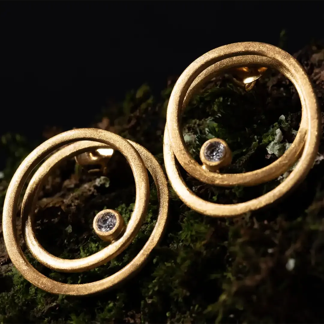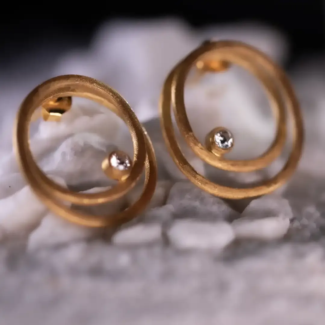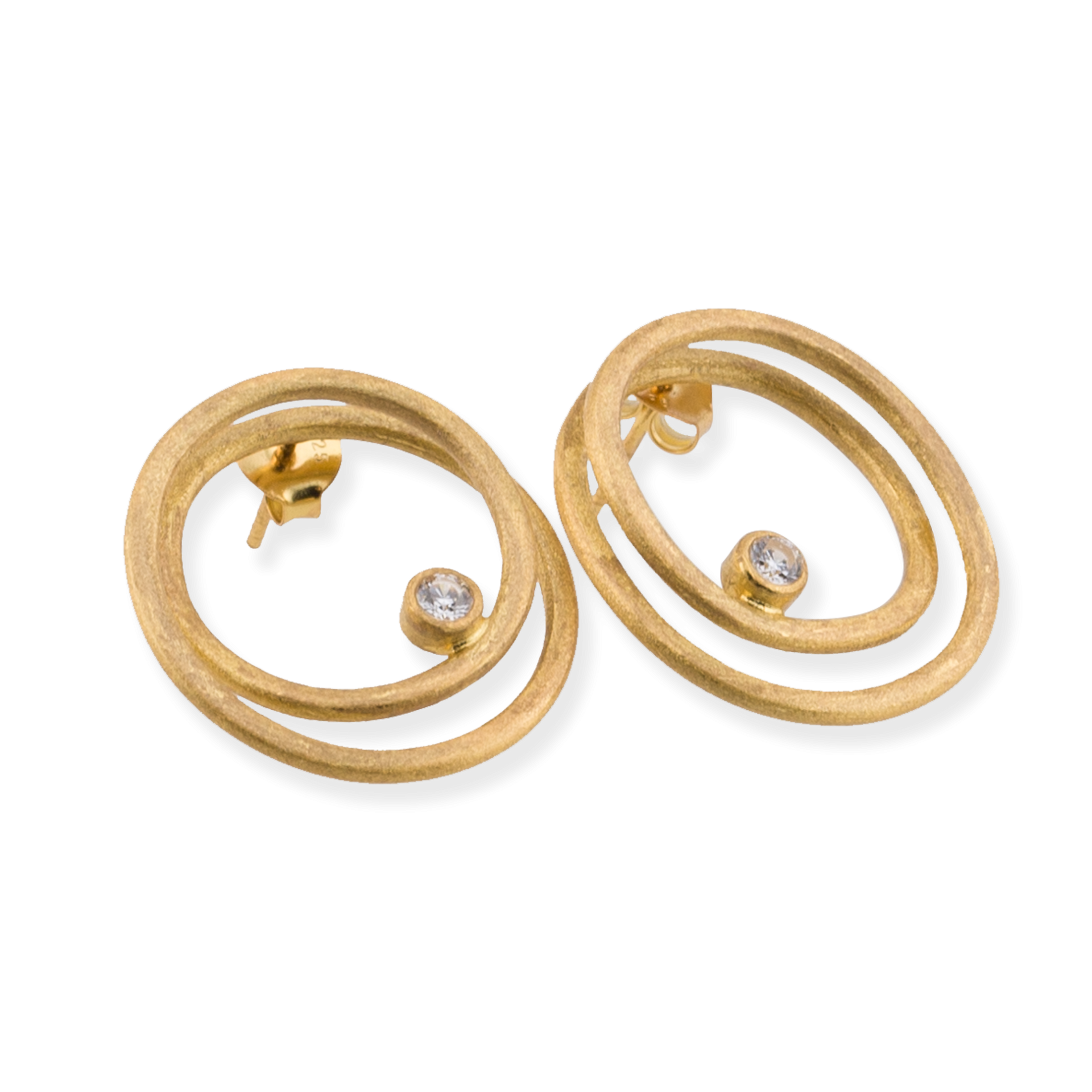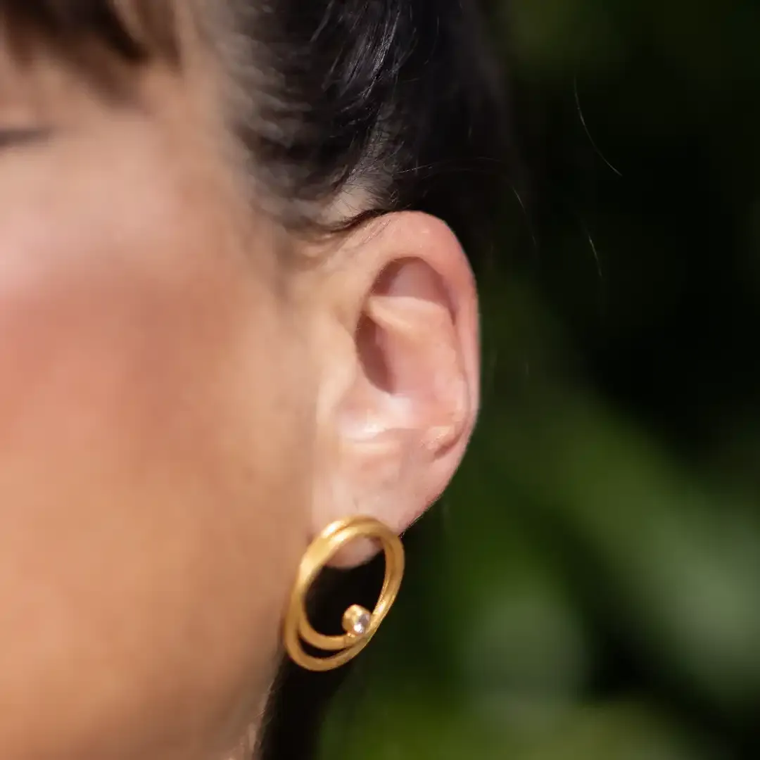 Orecchini a doppio cerchio realizzati in argento 925 con bagno in oro 24 carati. Una linea semplice ed elegante, impreziositi da un luminoso cristallo cubic zirconia centrale