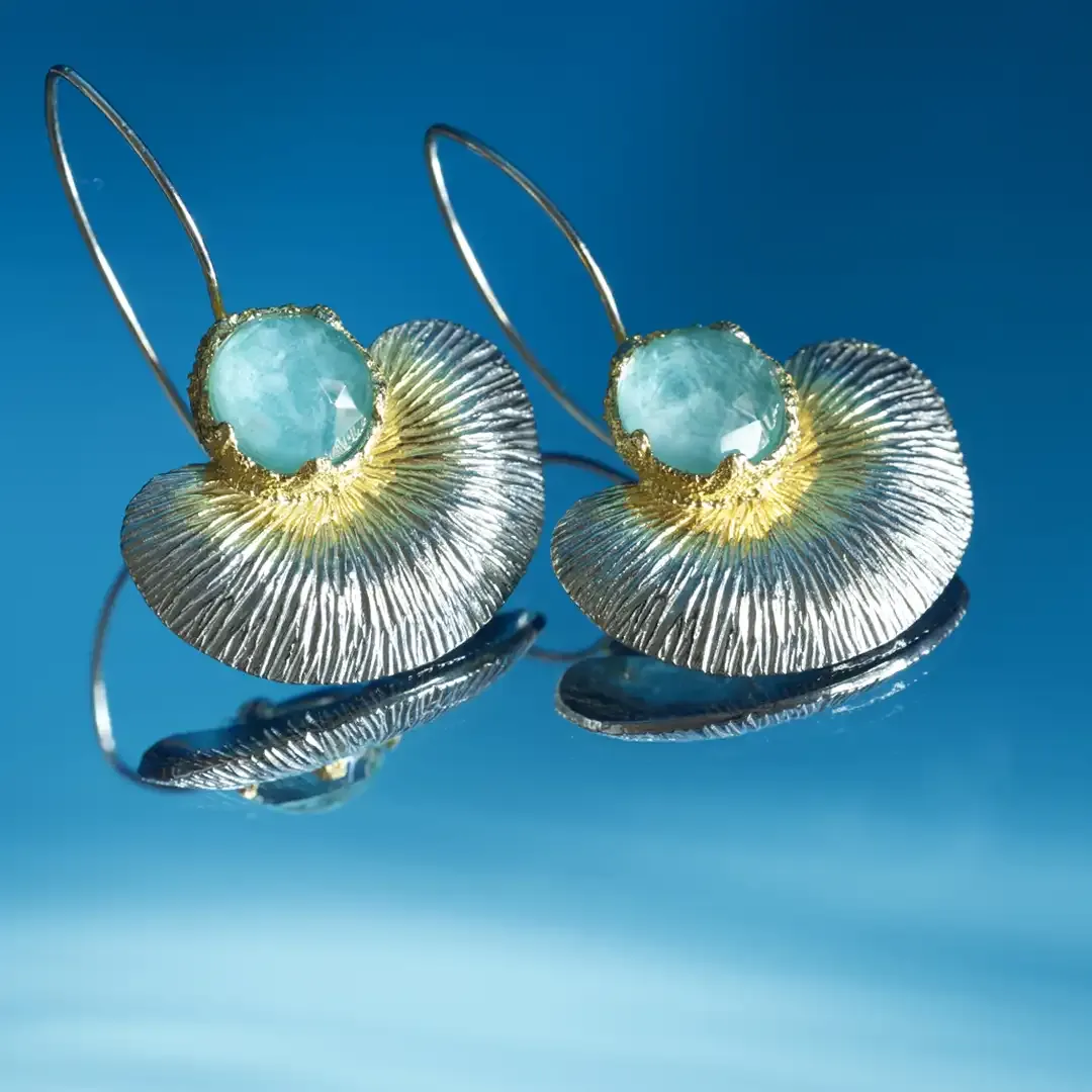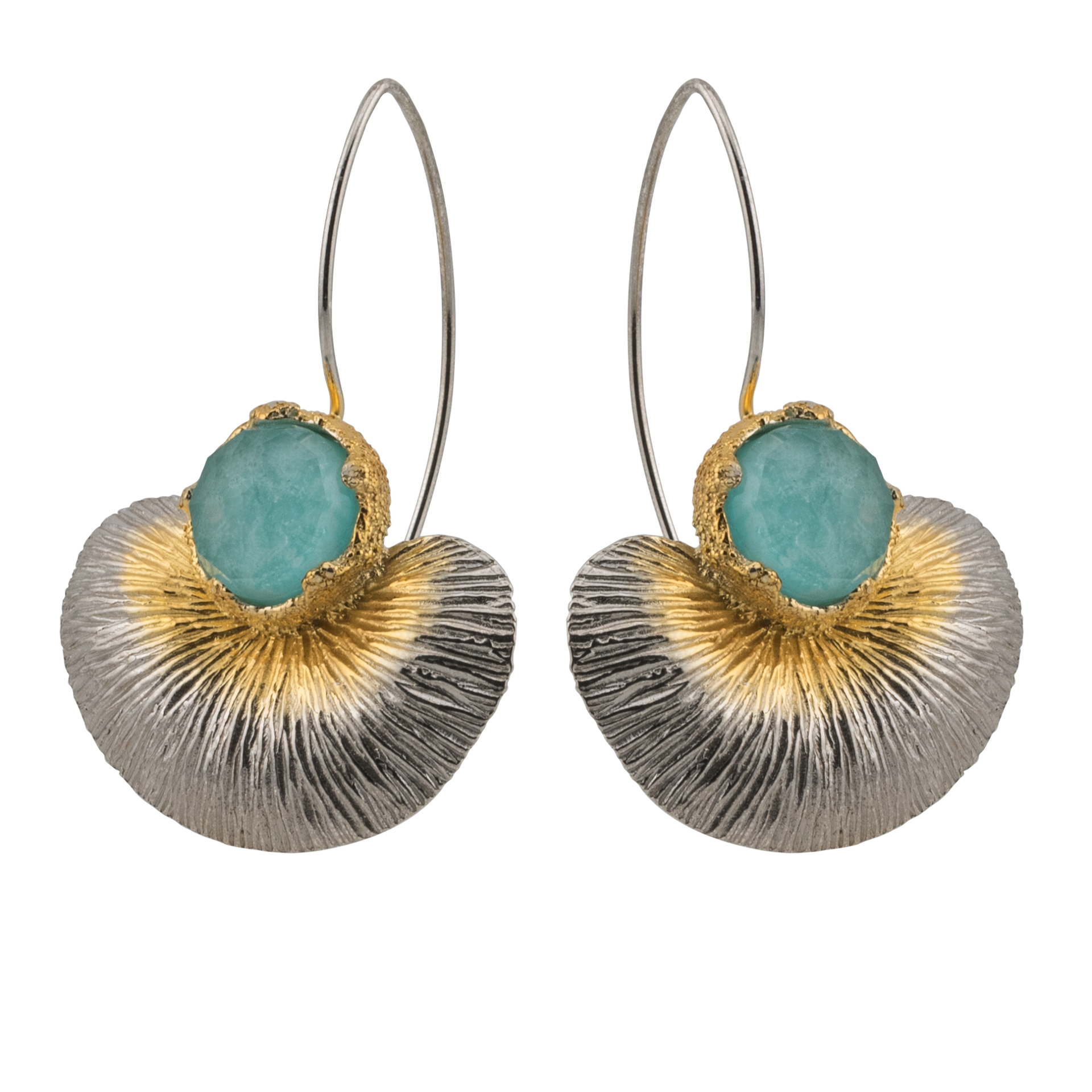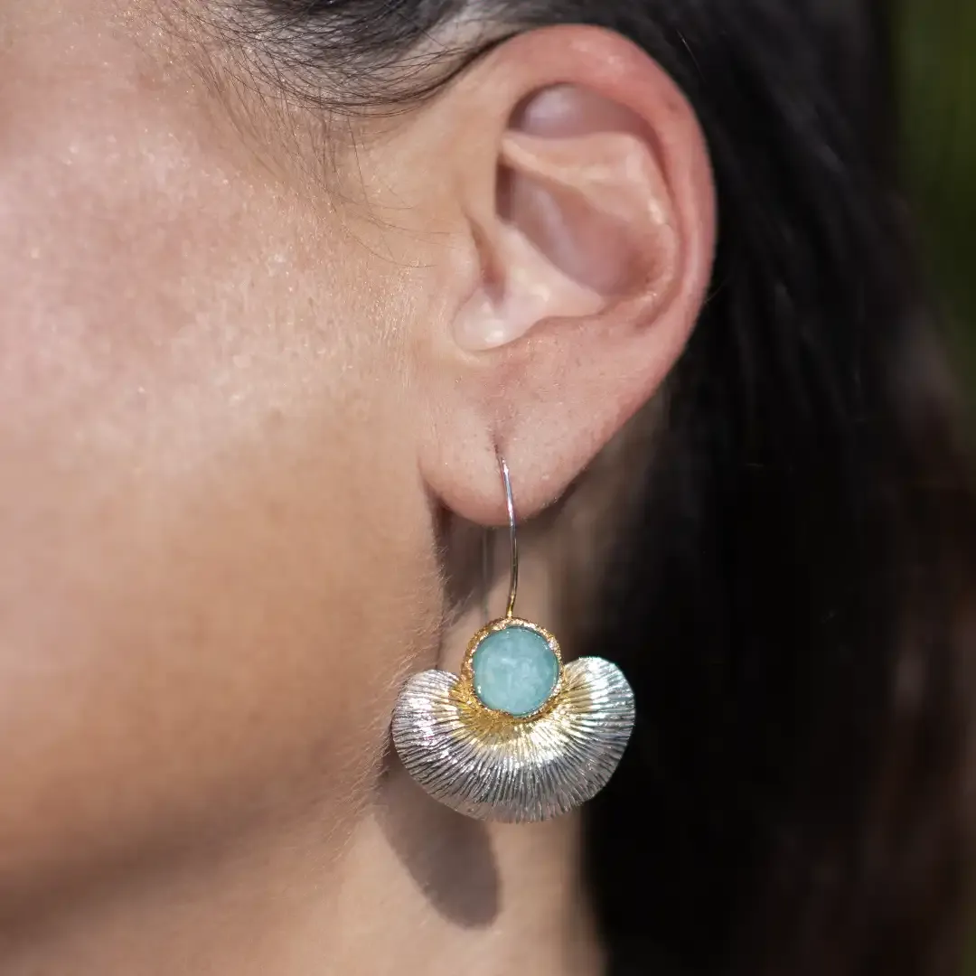 Orecchini con chiusura ad amo in argento 925, placcati in oro 24 carati e rifiniti in palladio. Con incastonate due amazzoniti di un'intensa tonalità verde azzurro, questi orecchini aggiungono un tocco di eleganza e colore ad ogni look.