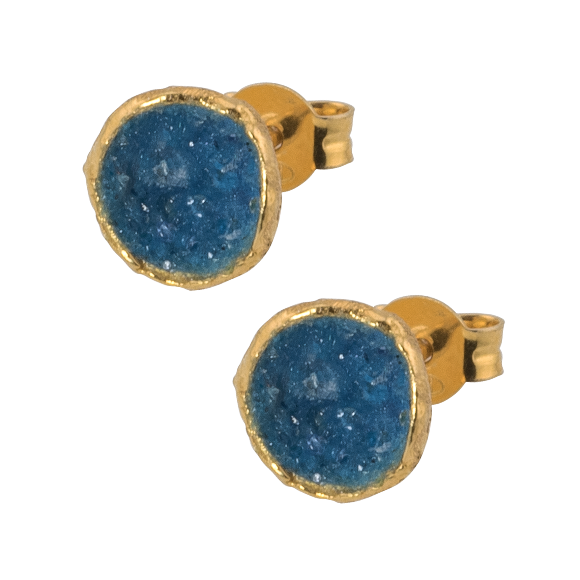 Piccoli orecchini a bottone in argento con bagno in oro 24 carati interamente realizzati a mano. La decorazione interna è in polvere di agata blu. Chiusura a farfalla.