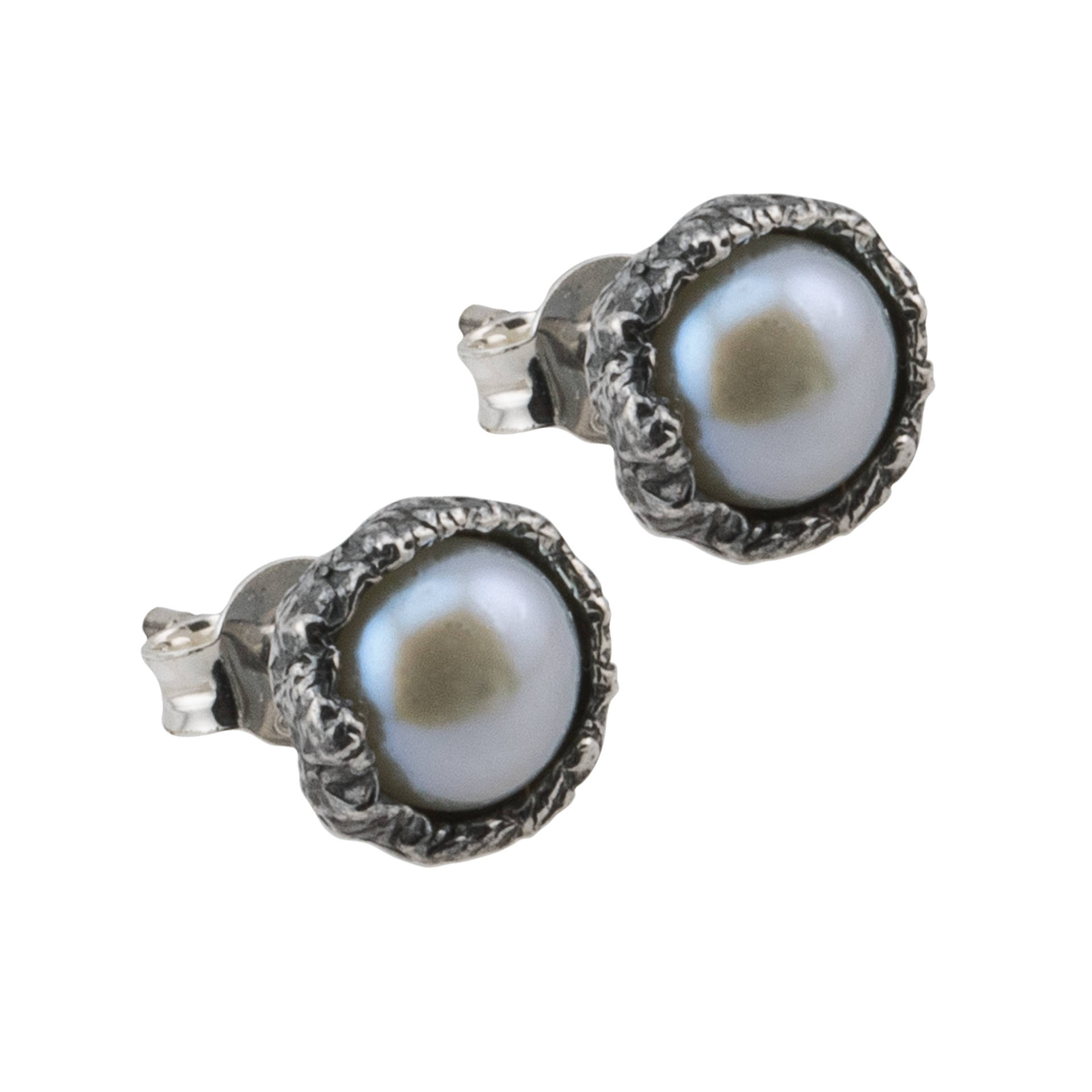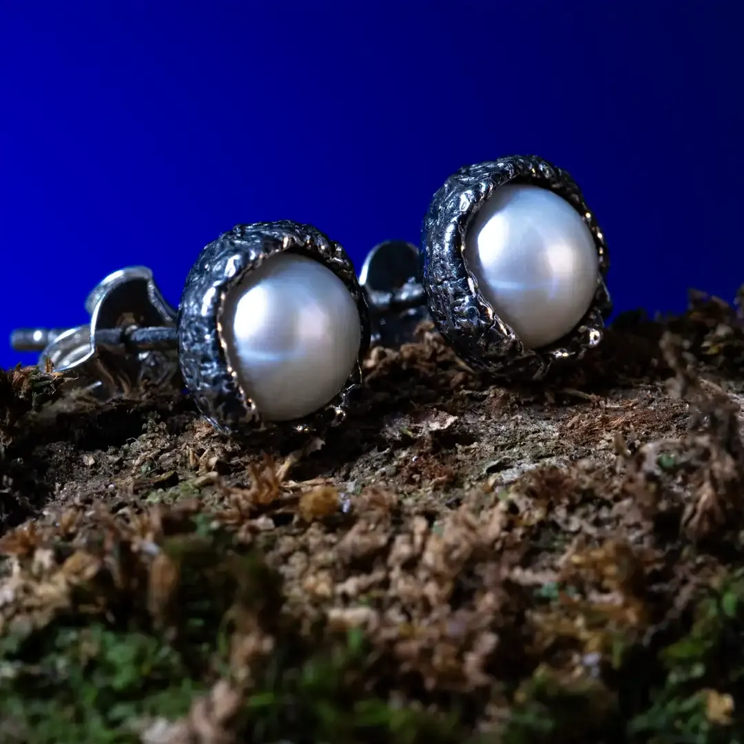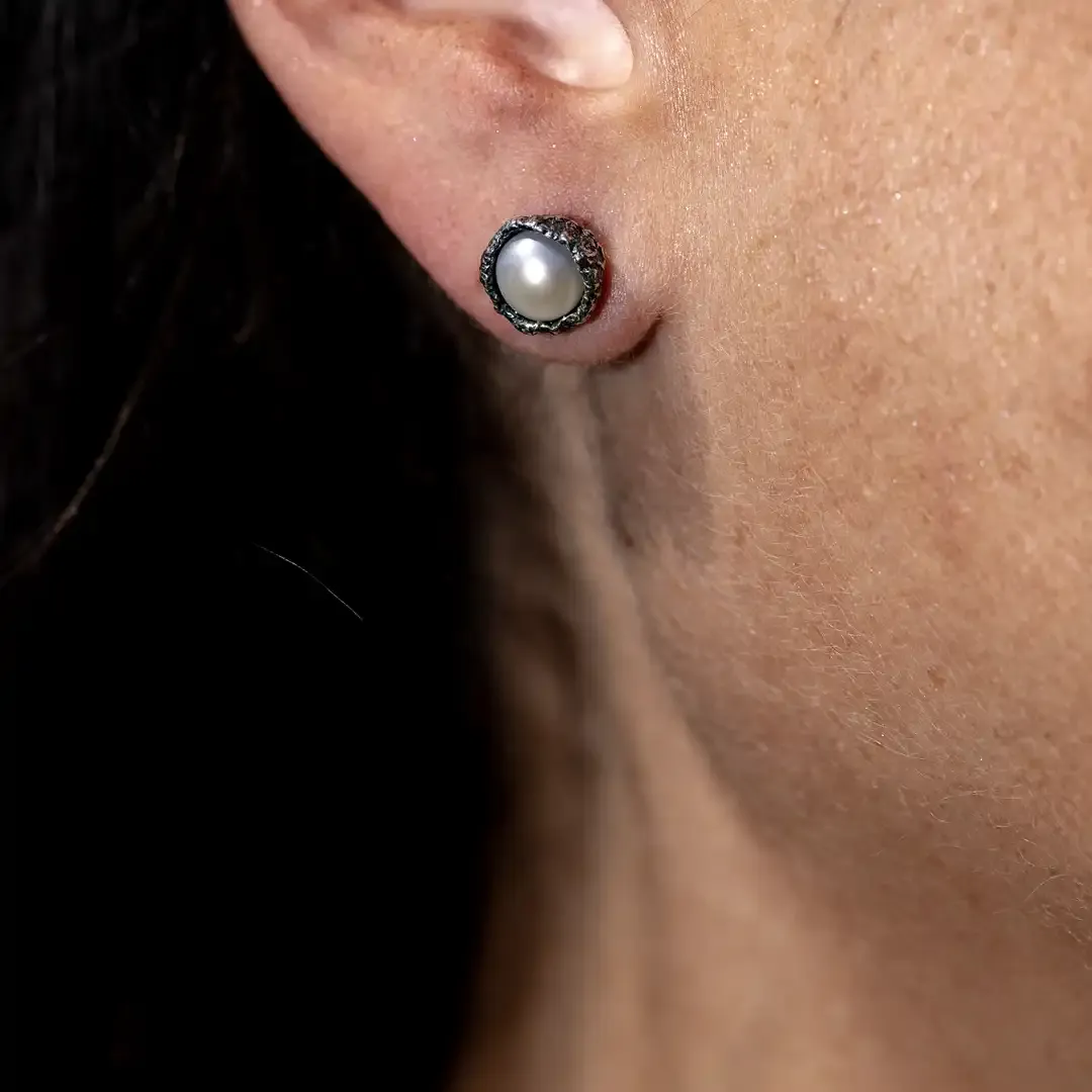 Orecchini con due delicate perle d’acqua dolce incastonate in una brillante montatura artigianale in argento brunito.