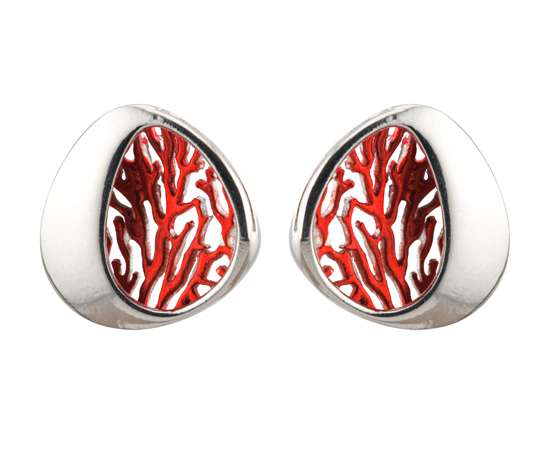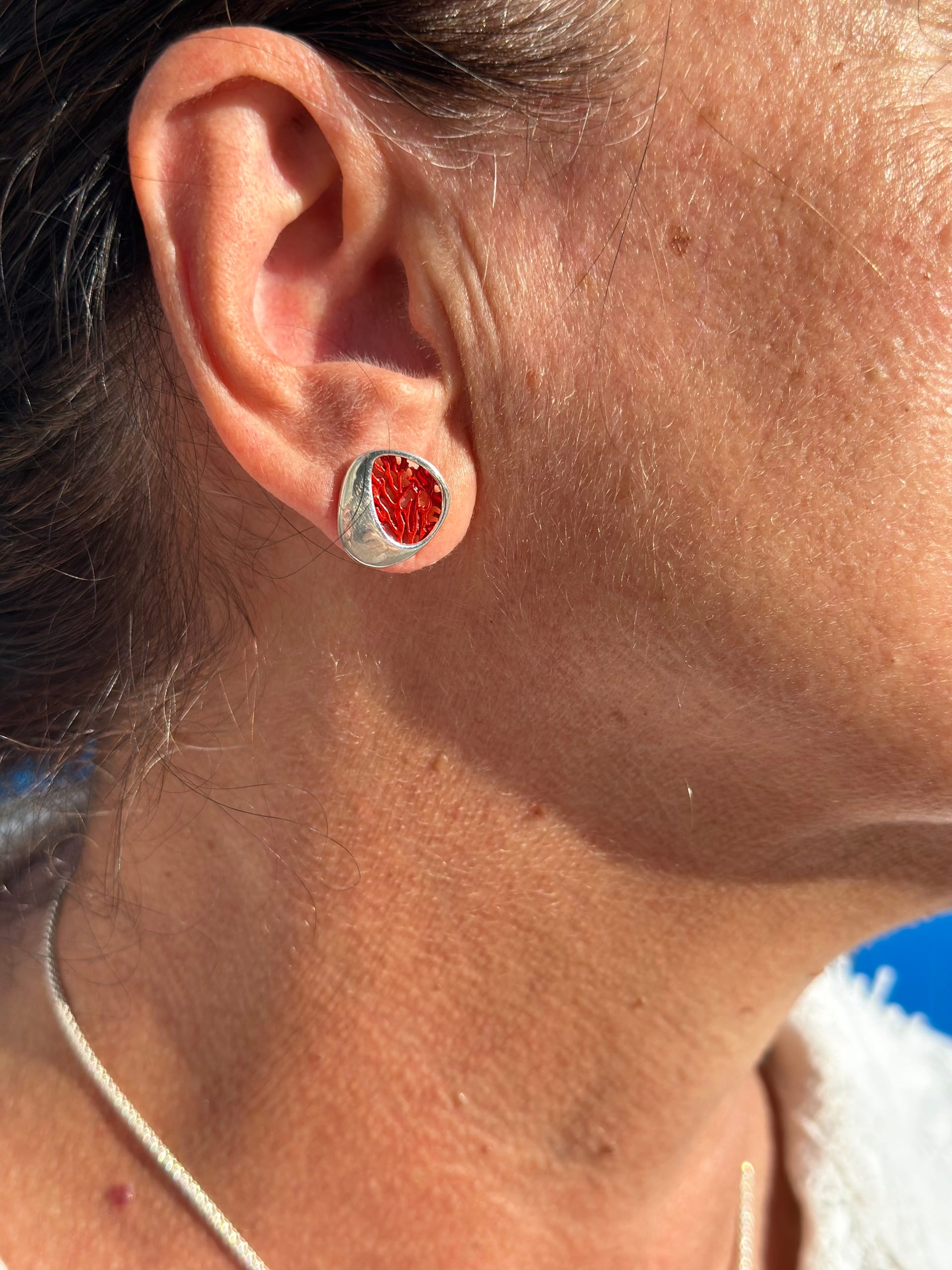 Piccoli orecchini a lobo in argento 925 lucido e un delicato intarsio smaltato che richiama la forma di un corallo. Il contrasto tra l'argento brillante e il rosso intenso crea un effetto visivo sorprendente. Chiusura a farfalla.