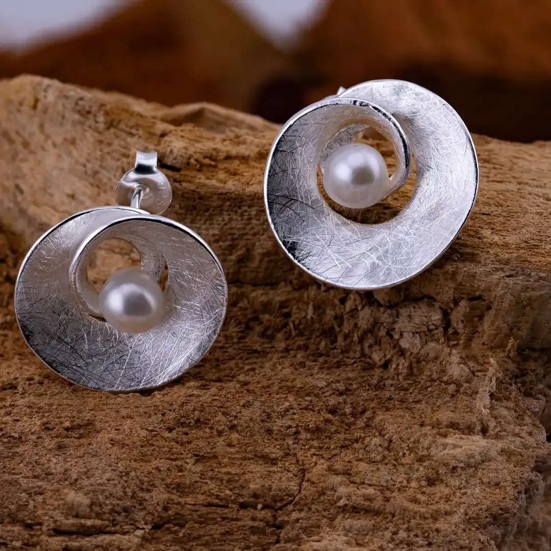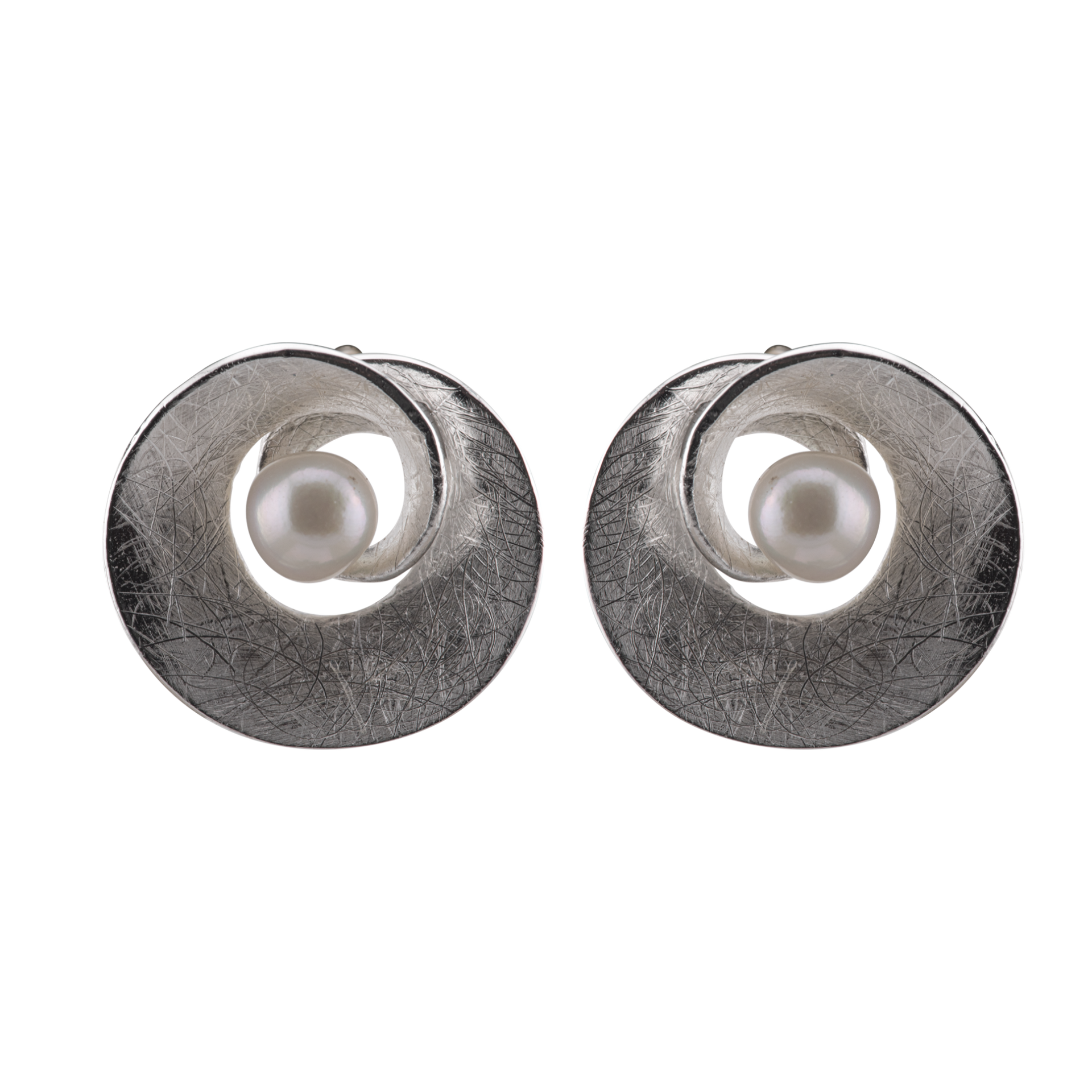 Orecchini a perno in argento 925 con effetto graffiato. Una piccola perla d’acqua dolce arricchisce questa forma semplice e classica. Diametro 15 mm. Chiusura a farfalla.