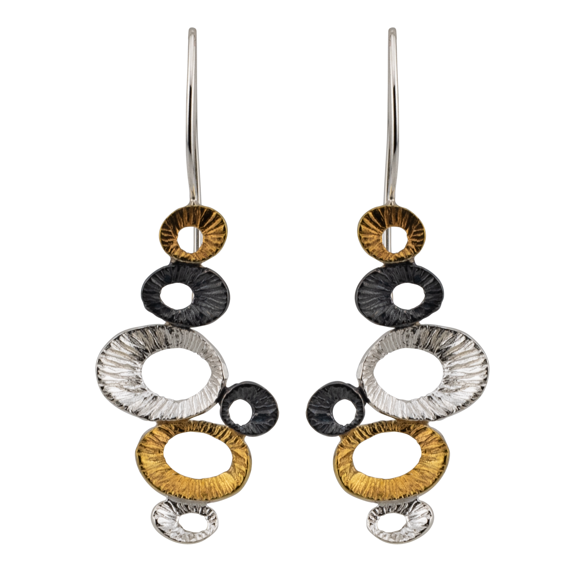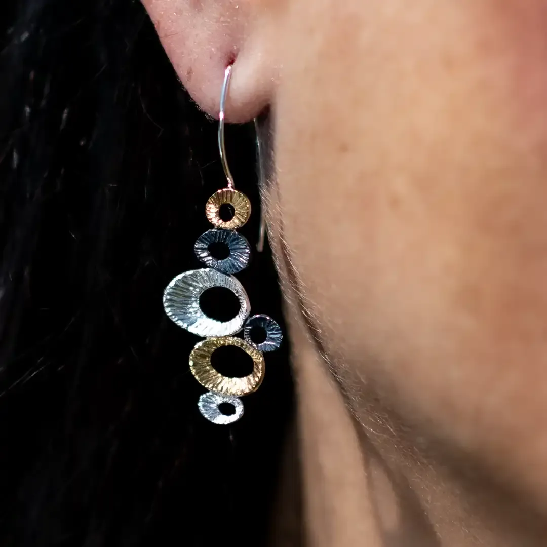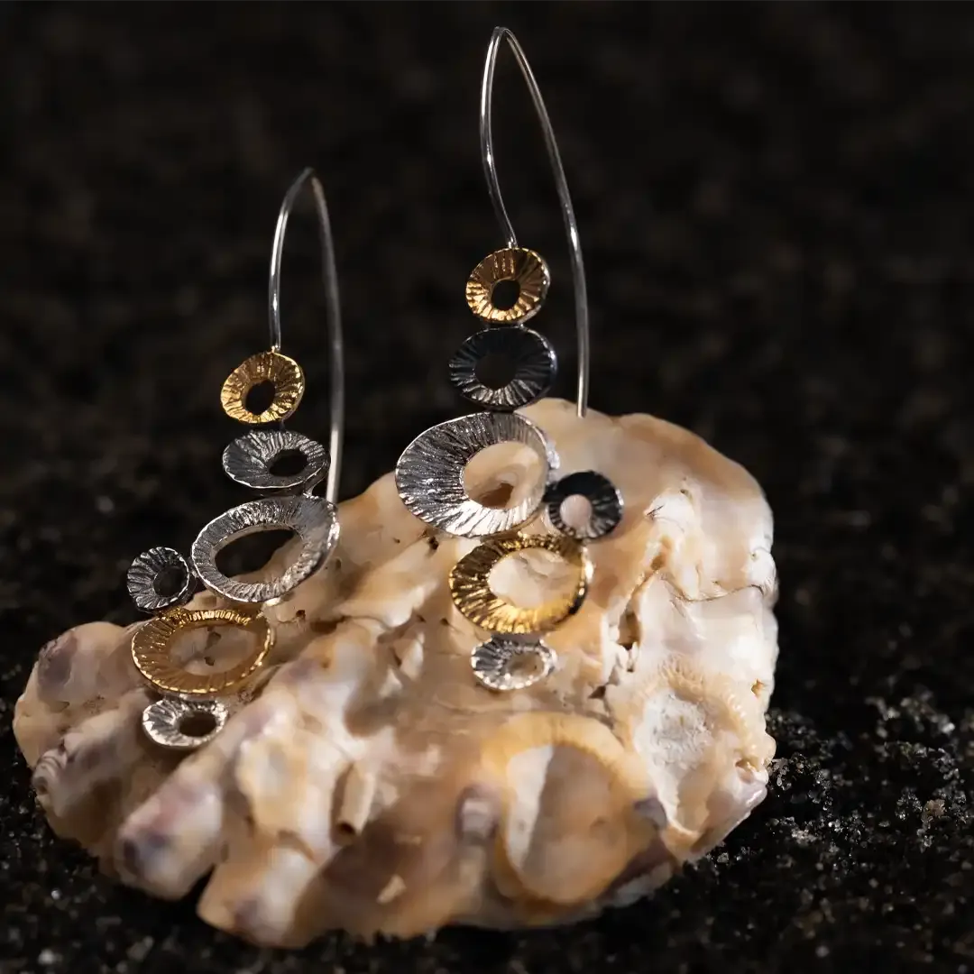 Orecchino in argento con chiusura ad amo. Le piccole piastre lavorate con il naturale movimento doneranno luce al tuo volto.