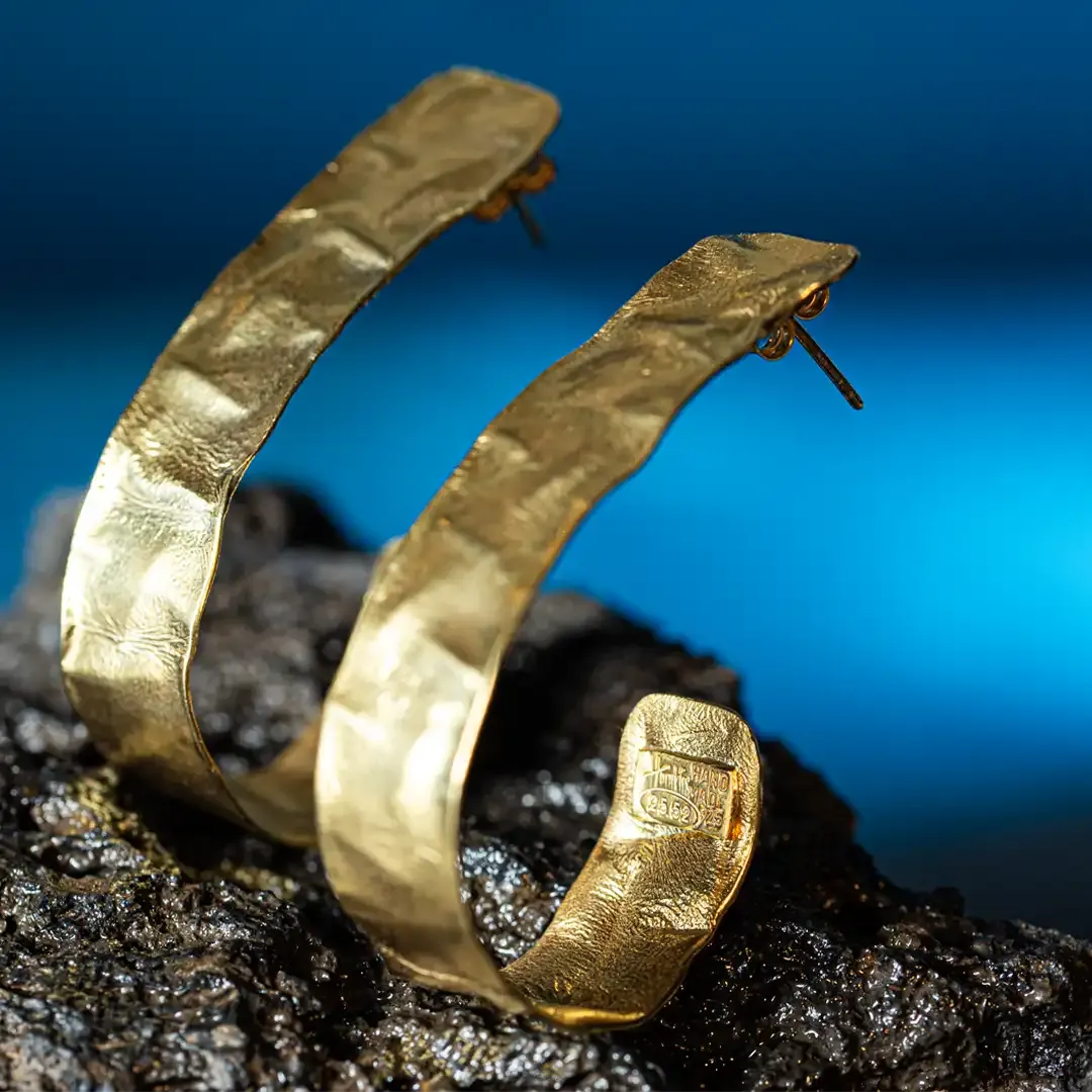 Orecchini a fascione curvo in argento 925 con bagno in oro 24 carati. La particolare lavorazione martellata dona luminosità a una forma molto semplice. Chiusura a farlalla.