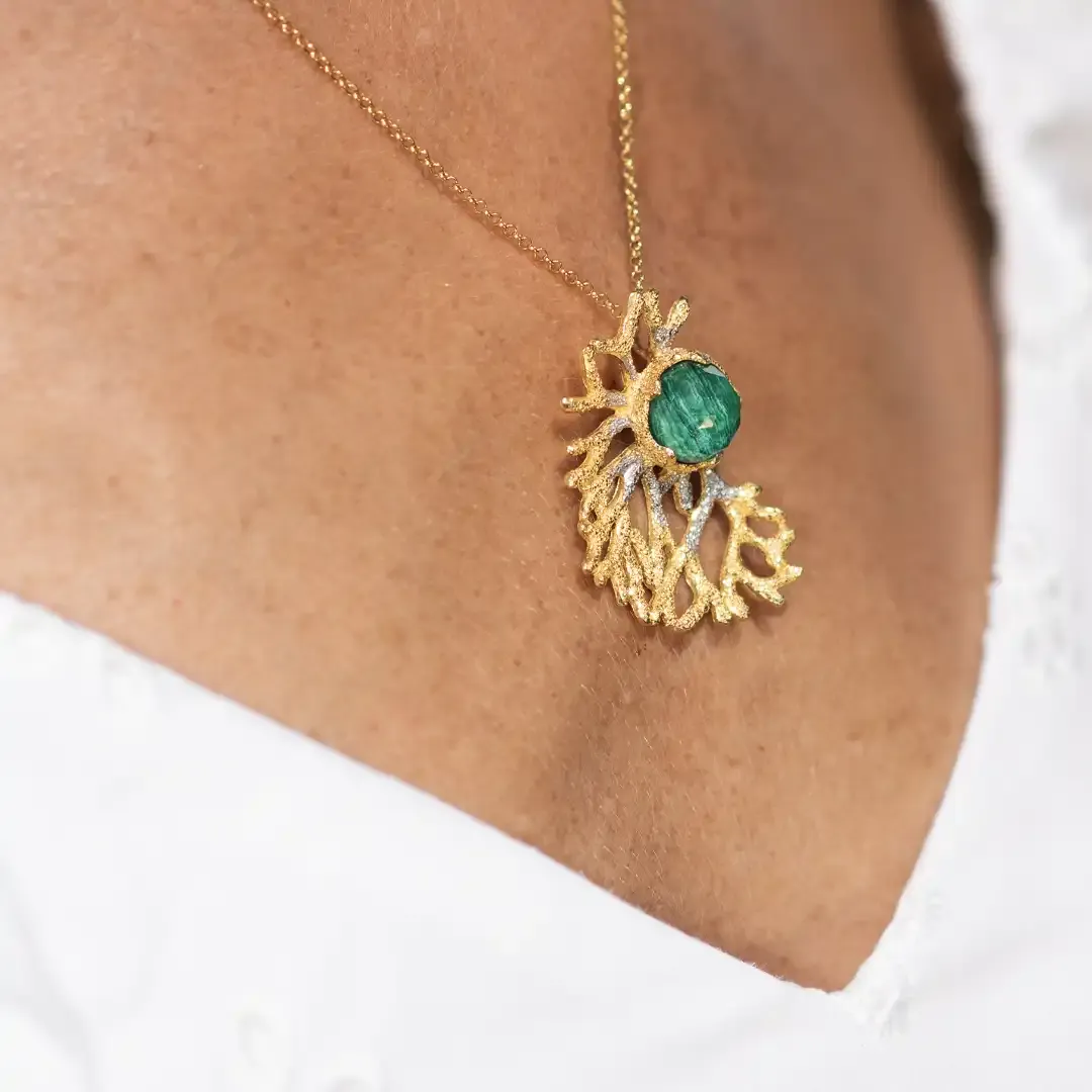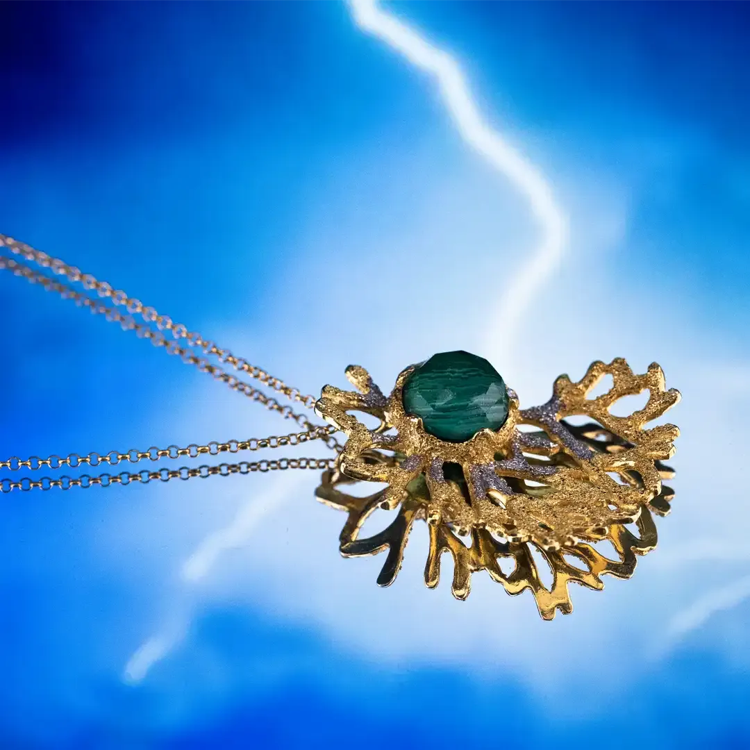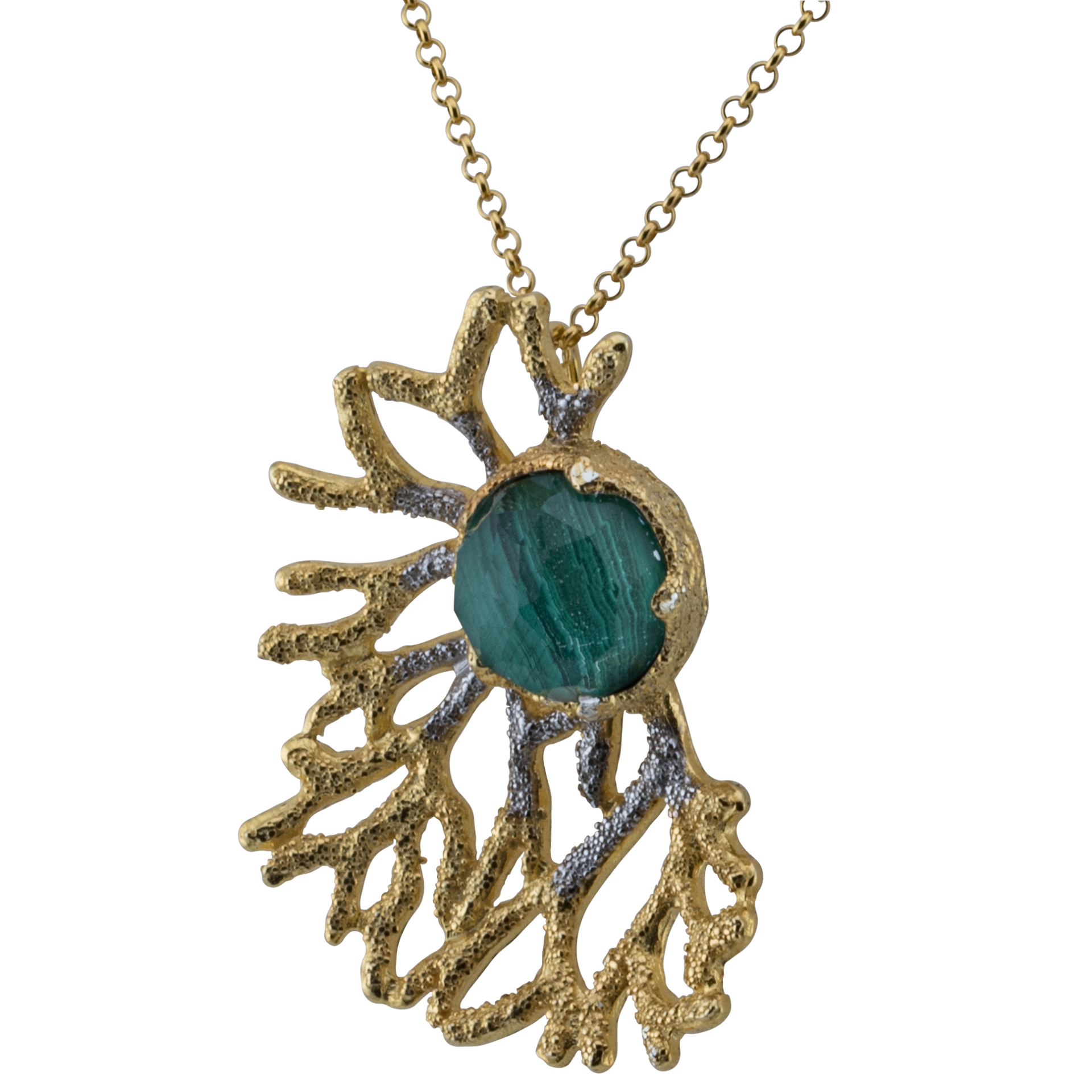 Collana pendente in argento 925 con bagno in oro 24 carati. La pietra centrale è una malachite naturale dal verde intenso. La catena del pendente è lunga 45 cm.
