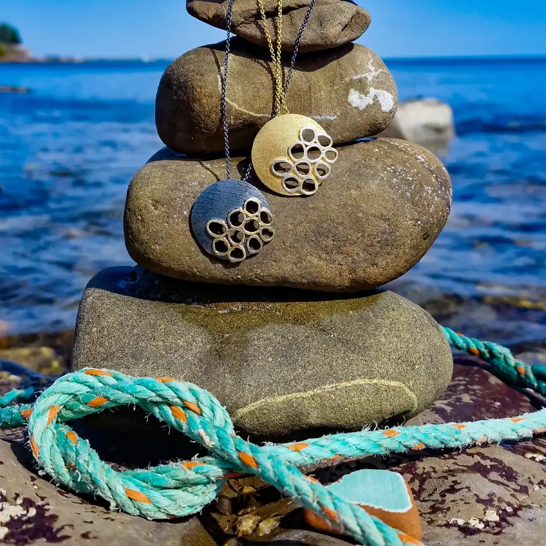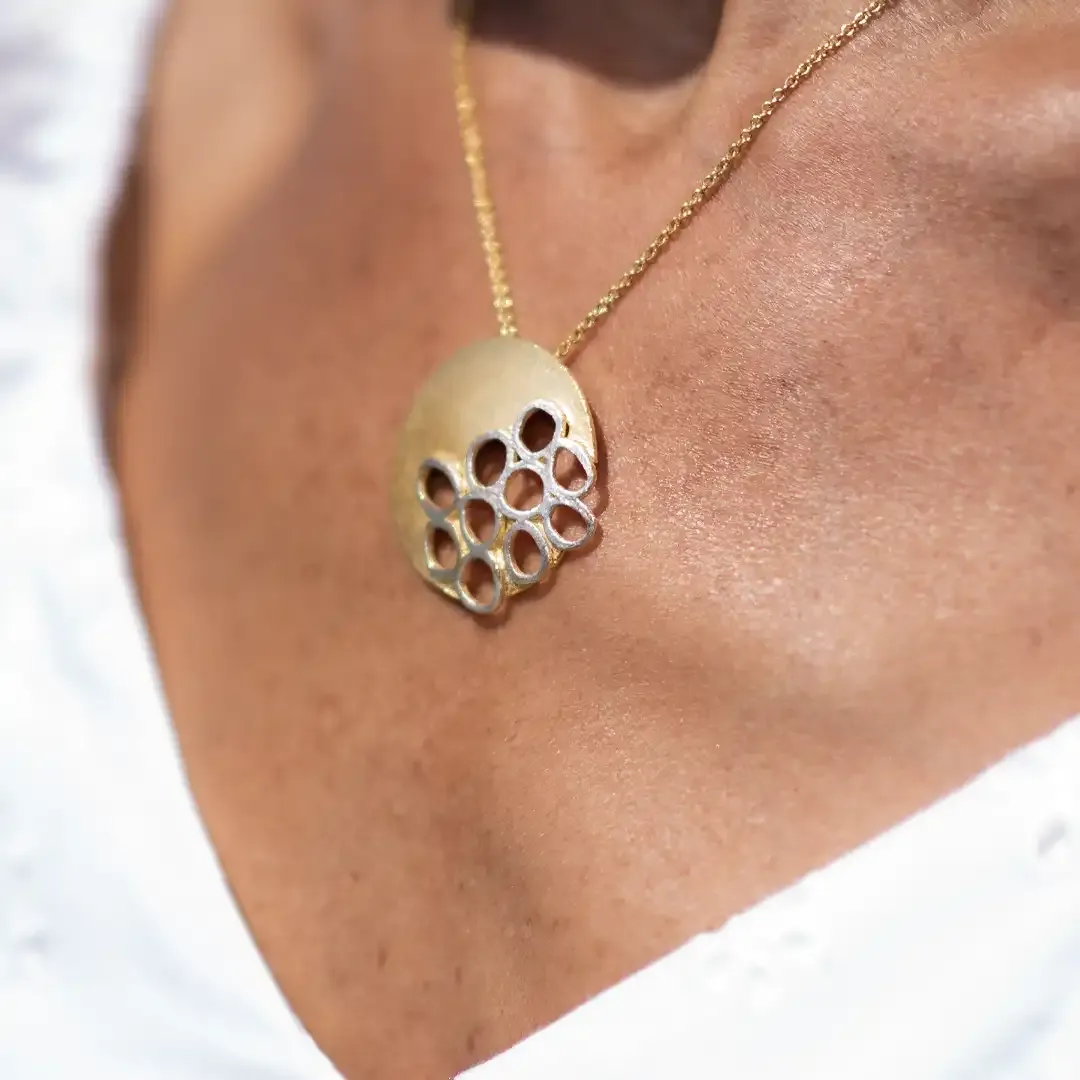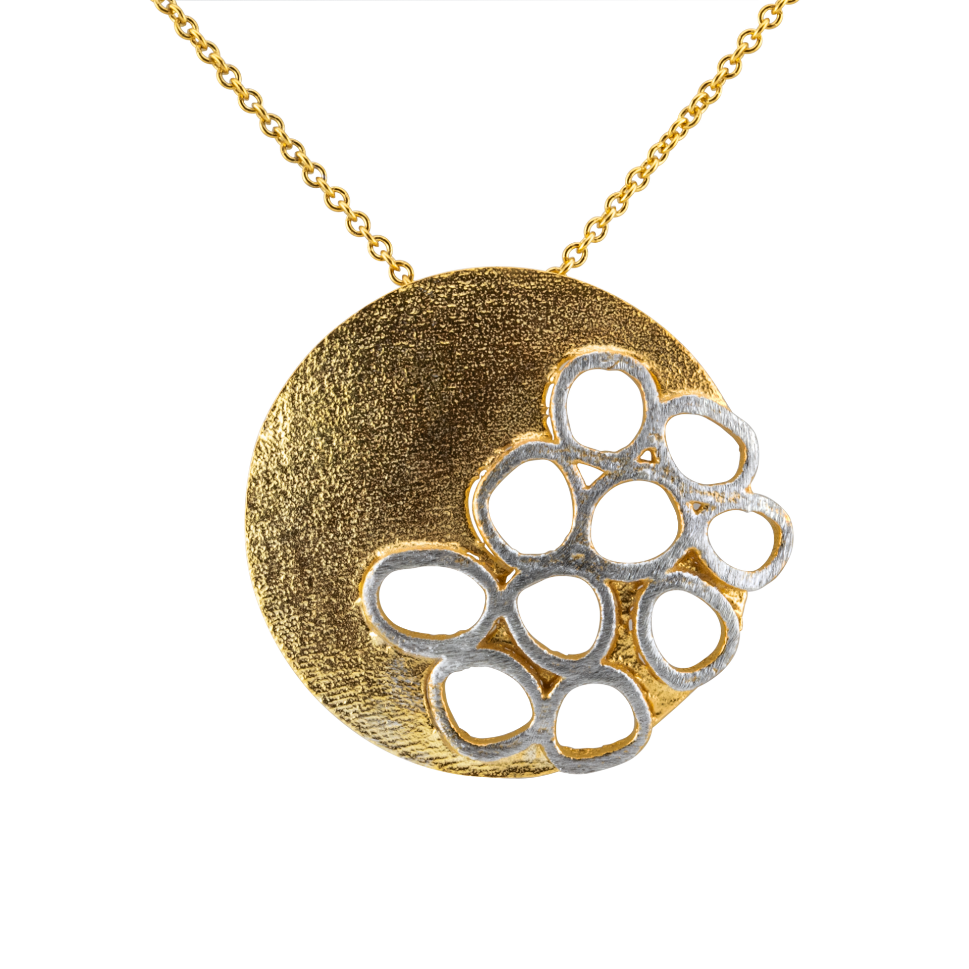 Collana pendente a cerchio traforato e satinato a mano, realizzato in argento 925 e placcato in oro 22 carati. Con un diametro di 35 mm questo pendente unisce artigianalità e stile per un look elegante e sofisticato. La lunghezza della catena è 45 cm.