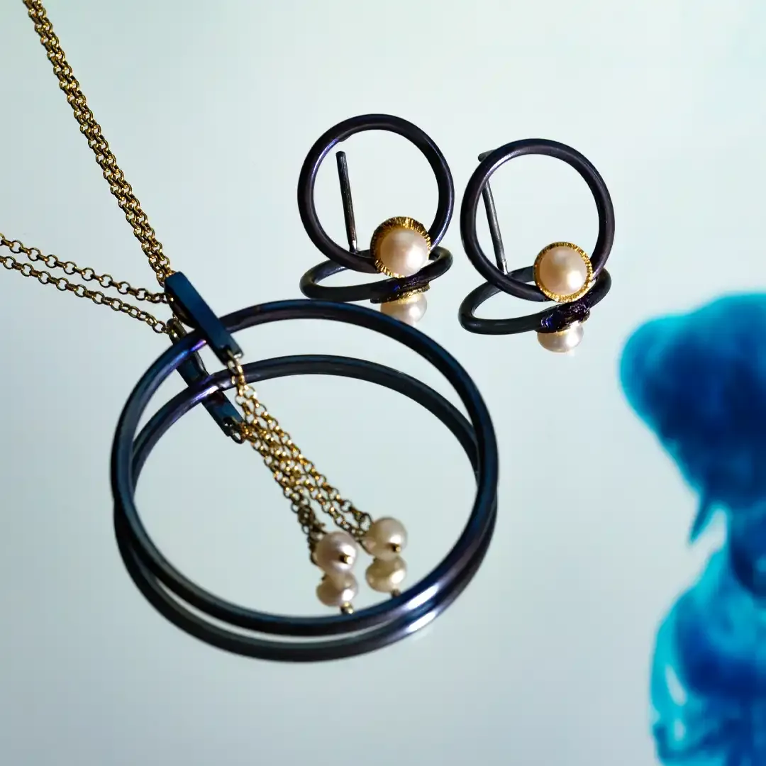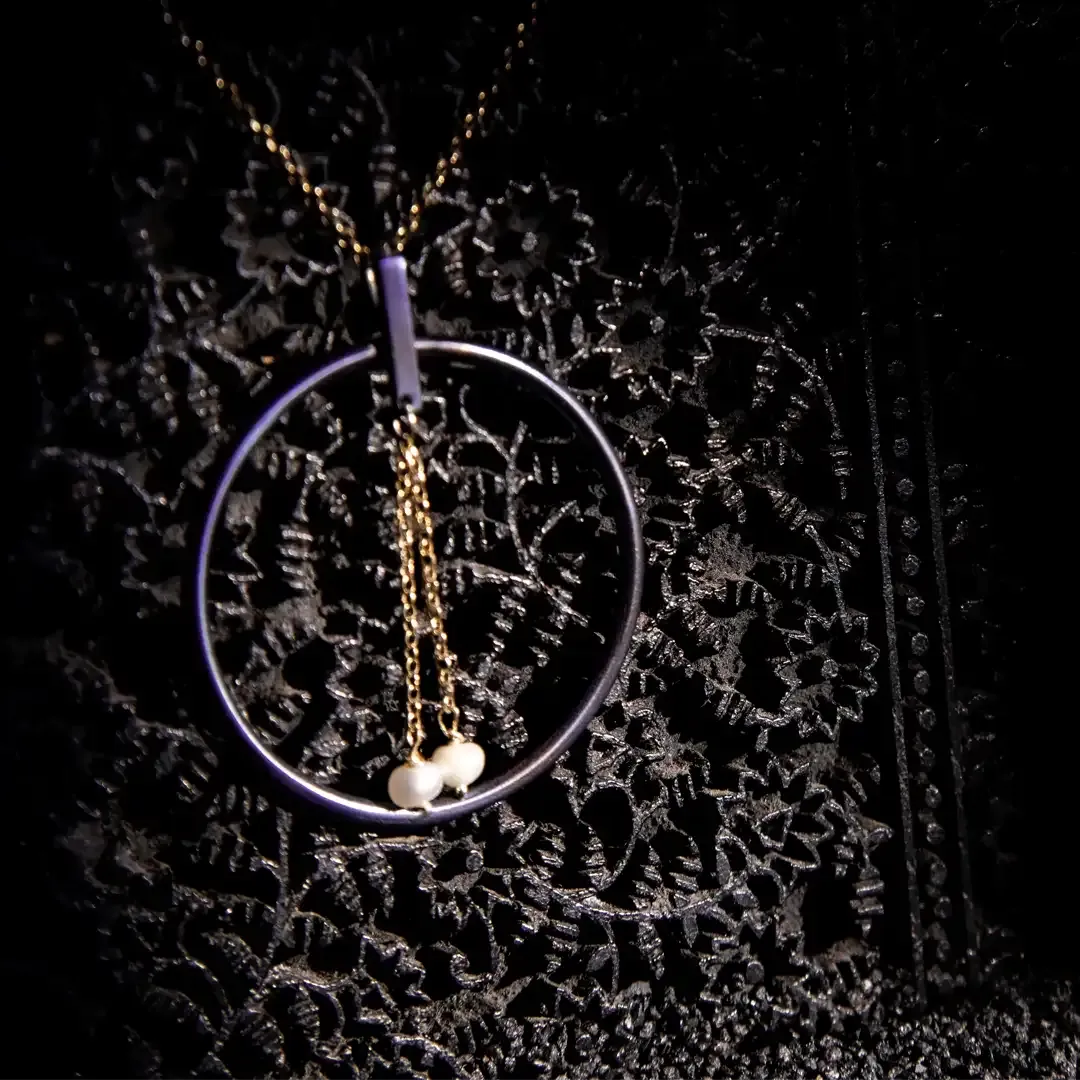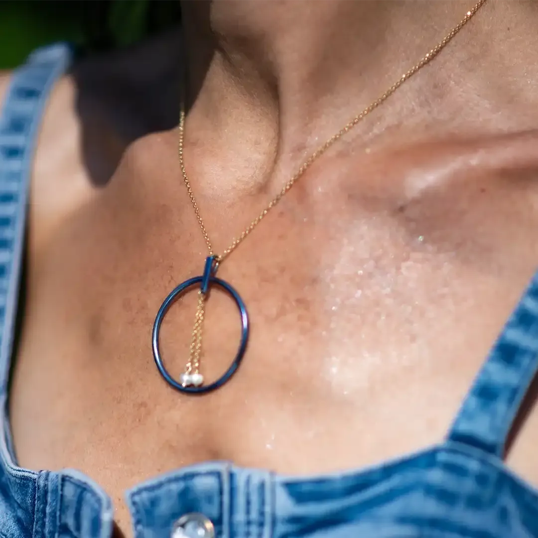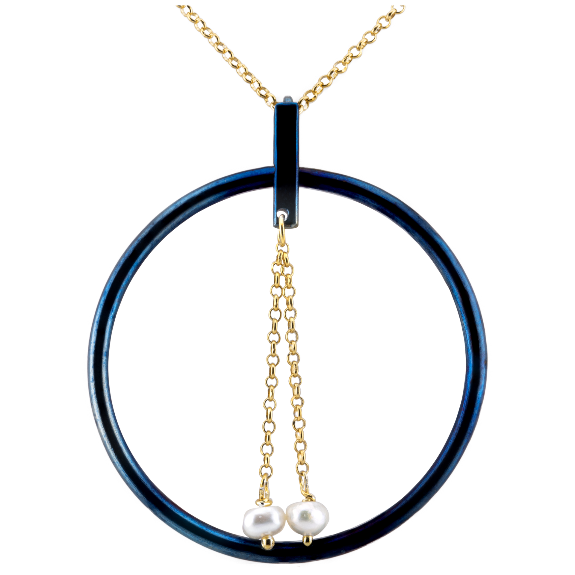 Collana pendente a cerchio realizzato in titanio dallo scintillante colore blu elettrico. All’interno due catenelle in argento dorato reggono due perle d’acqua dolce. Il diametro del pendente è 35 mm. La lunghezza della catena in argento dorato è 42 cm.