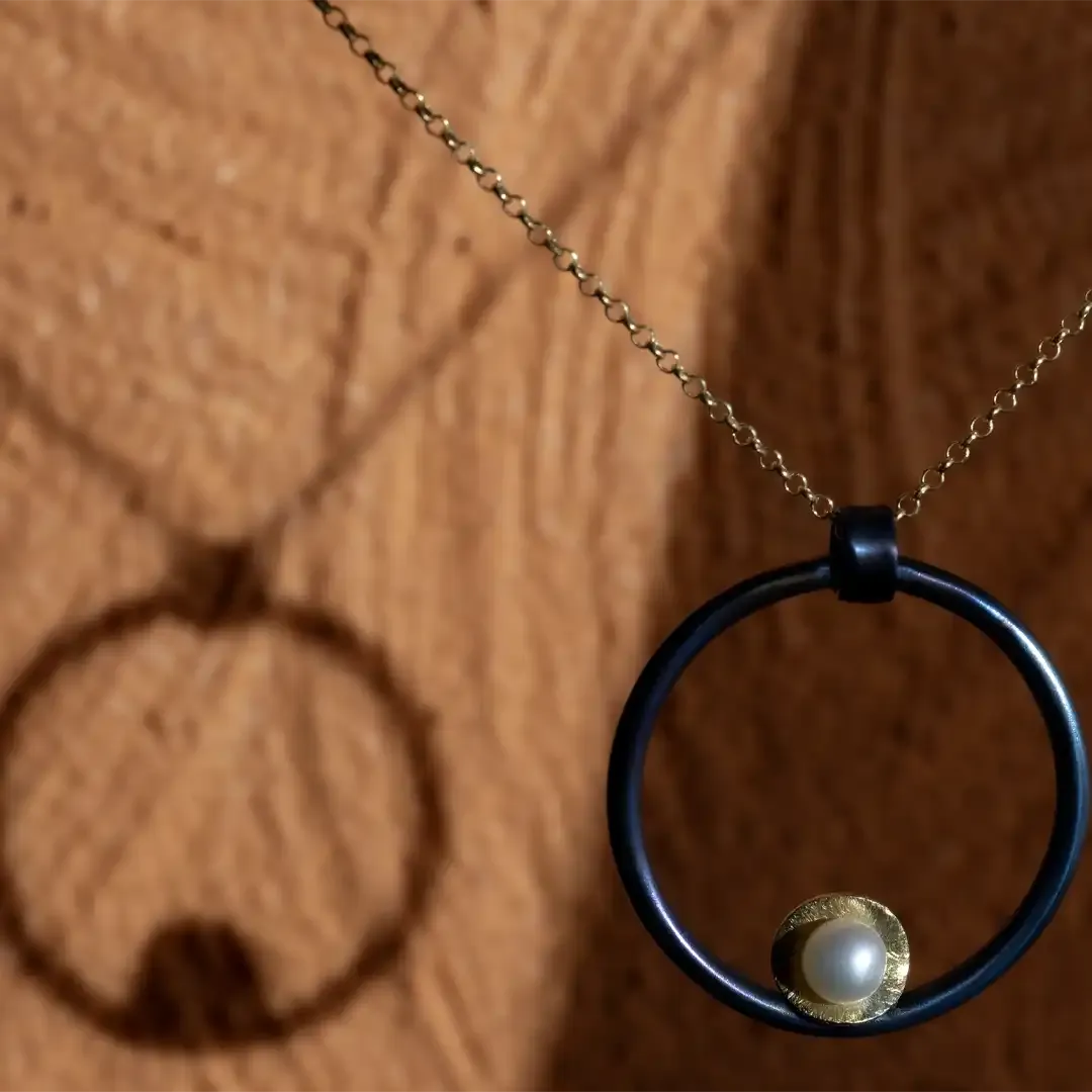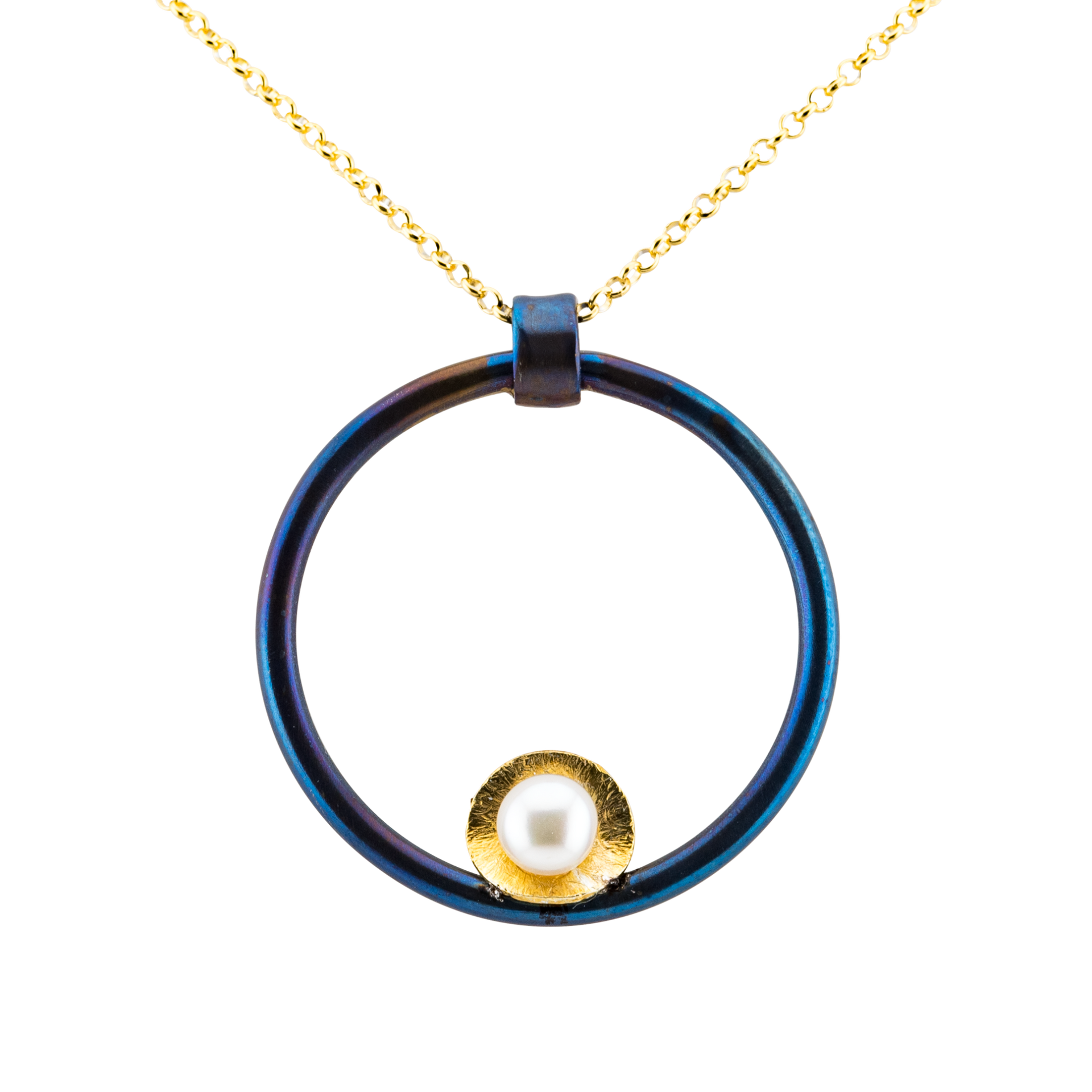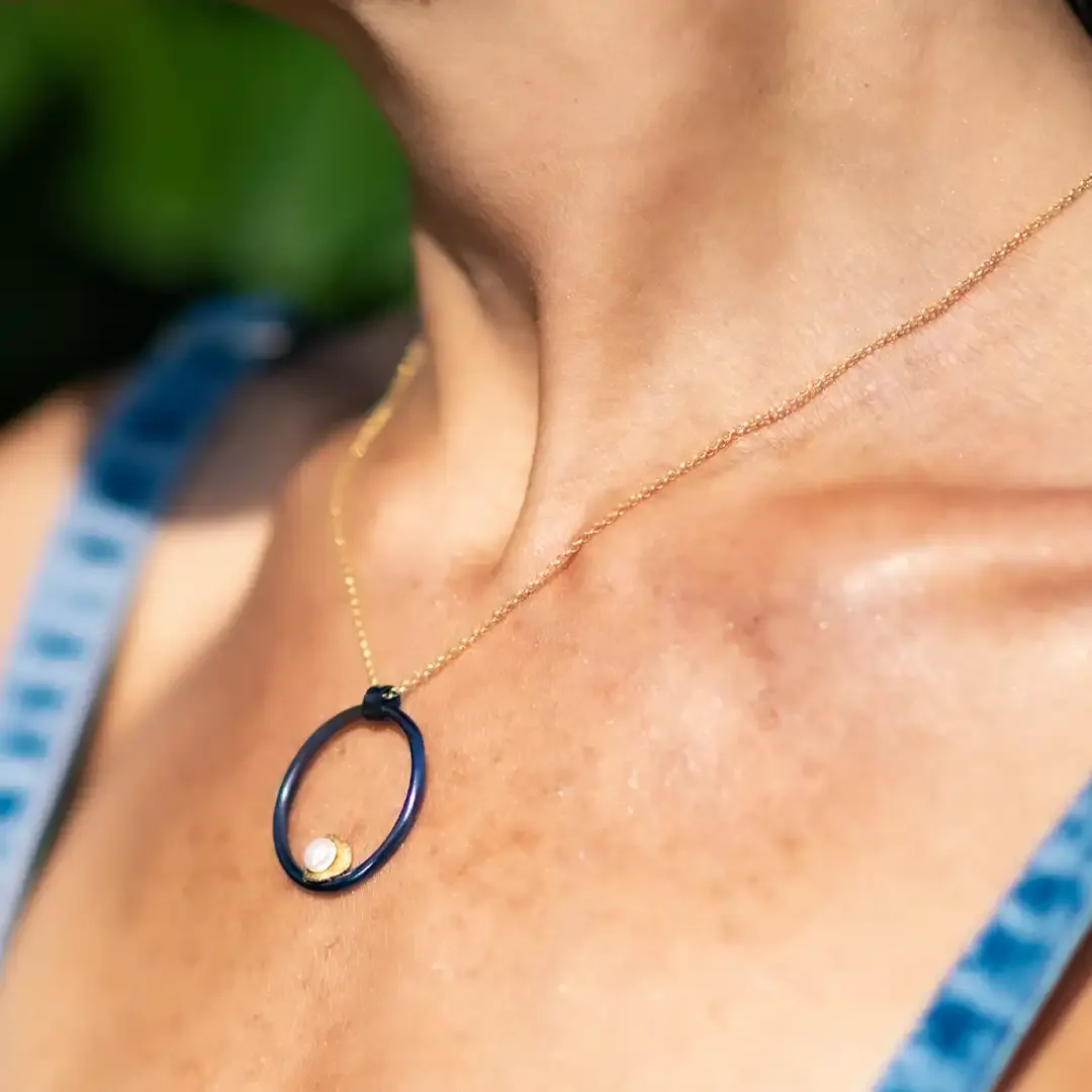 Collana pendente a cerchio realizzato in titanio dal colore blu elettrico. Una piccola perla d’acqua dolce è montata al centro. La catena in argento con bagno in oro ha una lunghezza di 42 cm .