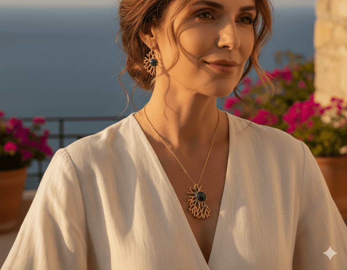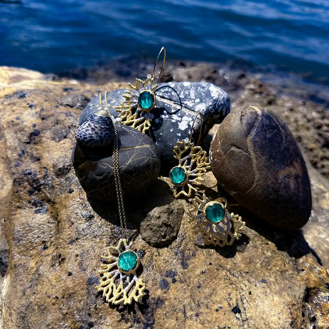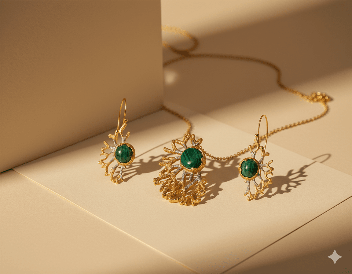 Realizzato a mano in argento 925 con bagno in oro 24 carati questo set riproduce la texture ramificata del corallo marino che cattura la luce con la sua finitura preziosa. Al centro sono montate tre splendide malachiti naturali dalle intense sfumature di verde.